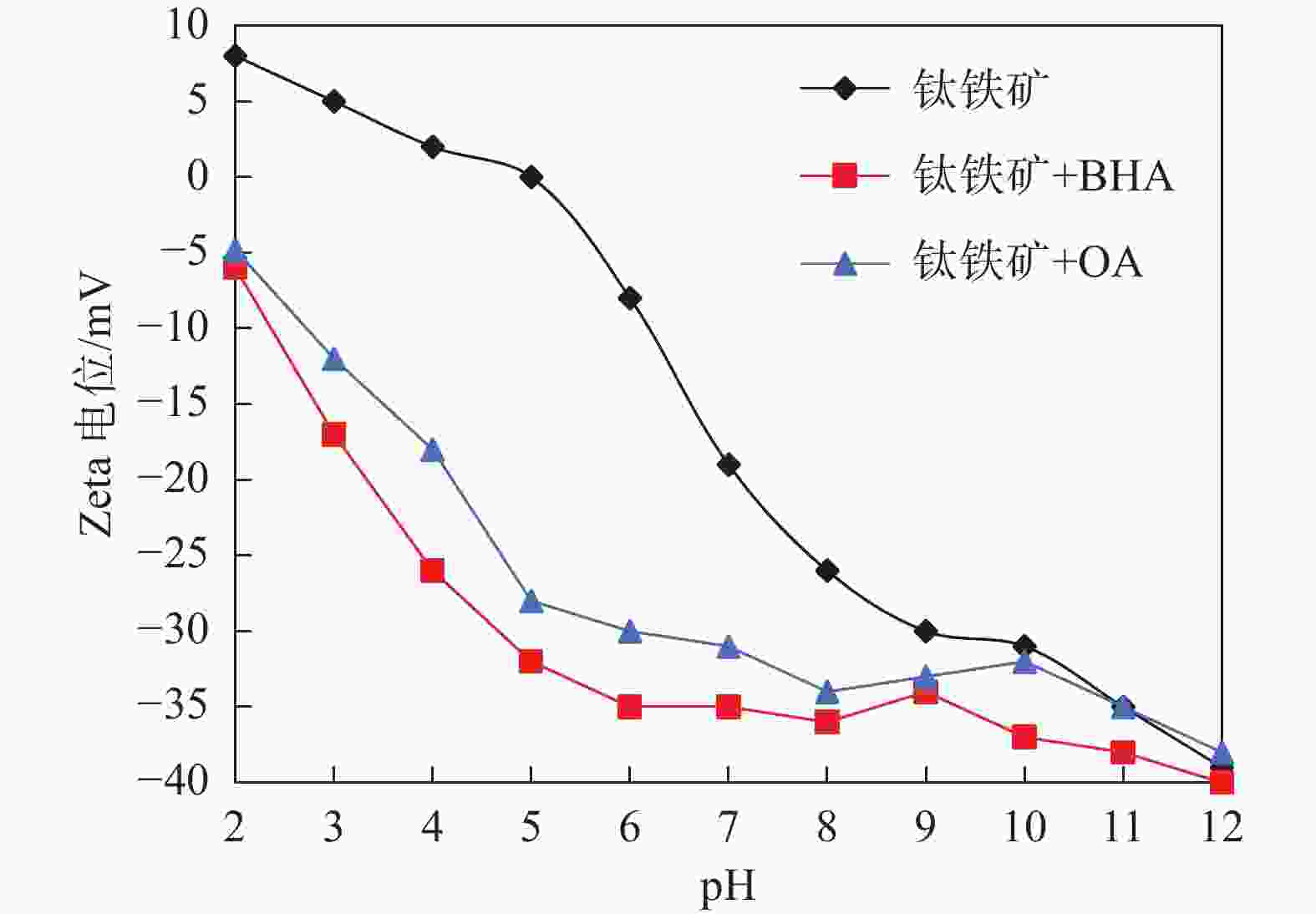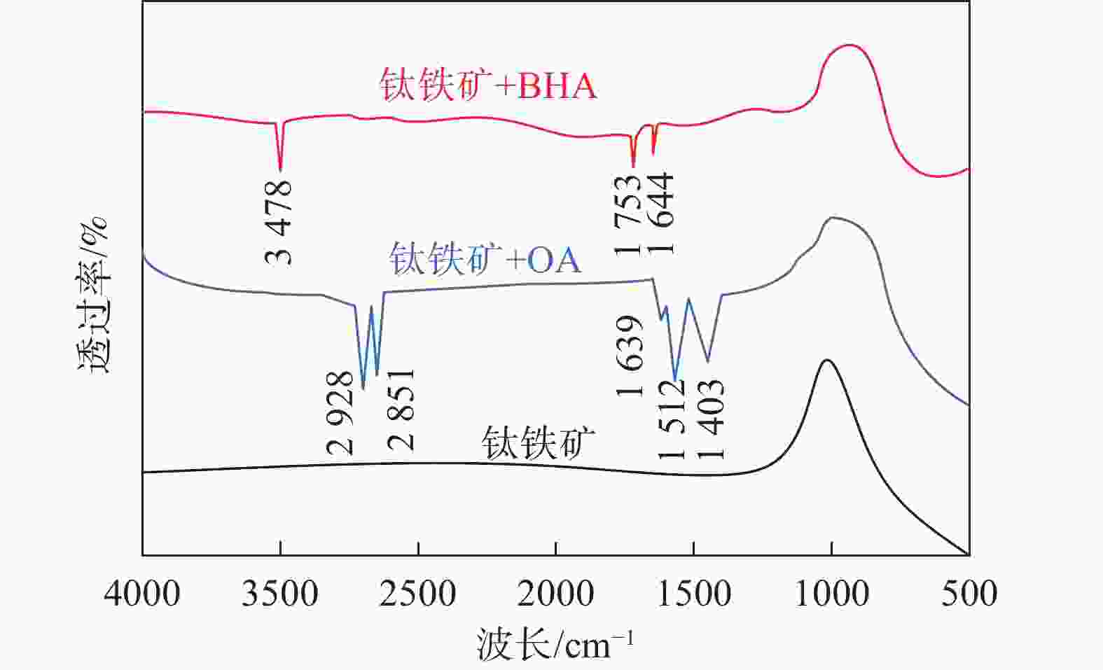 [1] Yang Zhaojun, Wang Fengyu, Zhong Senlin, et al. Flotation mechanism of ilmenite with benzohydroxamic acid[J]. Iron Steel Vanadium Titanium, 2022,43(4):24−27. (杨招君, 王丰雨, 钟森林, 等. 苯甲羟肟酸浮选钛铁矿的作用机理[J]. 钢铁钒钛, 2022,43(4):24−27. doi: 10.7513/j.issn.1004-7638.2022.04.004Yang Zhaojun, Wang Fengyu, Zhong Senlin, et al. Flotation mechanism of ilmenite with benzohydroxamic acid[J]. Iron Steel Vanadium Titanium, 2022, 43(4): 24-27. doi: 10.7513/j.issn.1004-7638.2022.04.004 [2] Chong Xiaoxiao, Luan Wenlou, Wang Fengxiang, et al. Overview of global titanium resources status and titanium consumption trend in China[J]. Conservation and Utilization of Mineral Resources, 2020,40(2):162−170. (崇霄霄, 栾文楼, 王丰翔, 等. 全球钛资源现状概述及我国钛消费趋势[J]. 矿产保护与利用, 2020,40(2):162−170.Chong Xiaoxiao, Luan Wenlou, Wang Fengxiang, et al. Overview of global titanium resources status and titanium consumption trend in China [J]. Conservationand Utilization of Mineral Resources, 2020, 40(2): 162-170. [3] Li Zheng, Chen Congxi. Development status of global titanium resources industry[J]. Acta Geoscientica Sinica, 2021,42(2):245−250. (李政, 陈从喜. 全球钛资源行业发展现状[J]. 地球学报, 2021,42(2):245−250. doi: 10.3975/cagsb.2020.102001Li Zheng, Chen Congxi. Development status of global titanium resources industry[J]. Acta Geoscientica Sinica, 2021, 42(2): 245-250. doi: 10.3975/cagsb.2020.102001 [4] Xiao Wei, Shao Yanhai, Yu Jiayi, et al. Research status and prospect of ilmenite flotation reagents[J]. Conservation and Utilization of Mineral Resources, 2021,41(5):160−167. (肖玮, 邵延海, 尉佳怡, 等. 钛铁矿浮选药剂研究现状及展望[J]. 矿产保护与利用, 2021,41(5):160−167.Xiao Wei, Shao Yanhai, Yu Jiayi, et al. Research status and prospect of ilmenite flotation reagents[J]. Conservation and Utilization of Mineral Resources, 2021, 41(5): 160-167. [5] Hu Yuehua, Han Haisheng, Tian Mengjie, et al. The application of metal-coordinated complexes in the flotation of oxide minerals and fundamental research of the adsorption mechanism[J]. Conservation and Utilization of Mineral Resources, 2018,(1):42−47,53. (胡岳华, 韩海生, 田孟杰, 等. 苯甲羟肟酸铅金属有机配合物在氧化矿浮选中的作用机理及其应用[J]. 矿产保护与利用, 2018,(1):42−47,53. doi: 10.13779/j.cnki.issn1001-0076.2018.01.007Hu Yuehua, Han Haisheng, Tian Mengjie, et al. The application of metal-coordinated complexes in the flotation of oxide minerals and fundamental research of the adsorption mechanism[J]. Conservation and Utilization of Mineral Resources, 2018(1): 42-47, 53. doi: 10.13779/j.cnki.issn1001-0076.2018.01.007 [6] Zhang Chaofan, Yu Qingyao, Cao Yijun, et al. Research progress of ilmenite flotation reagents and their surface modification methods[J]. The Chinese Journal of Nonferrous Metals, 2021,31(12):3675−3689. (张超凡, 余青瑶, 曹亦俊, 等. 钛铁矿浮选药剂及其表面改性的研究进展[J]. 中国有色金属学报, 2021,31(12):3675−3689.Zhang Chaofan, Yu Qingyao, Cao Yijun, et al. Research progress of ilmenite flotation reagents and their surface modification methods[J]. The Chinese Journal of Nonferrous Metals, 2021, 31(12): 3675−3689. [7] Xu Caili, Chi Ru'an, Lü Renliang, et al. Progress in flotation behavior of octyl hydroxamic acid[J]. Journal of Wuhan Institute of Technology, 2019,(6):566−572. (徐彩丽, 池汝安, 吕仁亮, 等. 辛基羟肟酸浮选行为的研究进展[J]. 武汉工程大学学报, 2019,(6):566−572.Xu Caili, Chi Ru'an, Lü Renliang, et al. Progress in flotation behavior of octyl hydroxamic Acid[J]. Journal of Wuhan Institute of Technology, 2019(6): 566-572. [8] 王军, 程宏伟, 赵红波, 等. 油酸钠作用下金红石的浮选行为及作用机理[J]. 中国有色金属学报, 2014(3): 820-825.Wang Jun, Cheng Hongwei, Zhao Hongbo, et al. Flotation behavior and mechanism of rutile in presence of sodium oleate[J]. The Chinese Journal of Nonferrous Metals, 2014(3): 820-825. [9] Zhu Shiman, Li Yifei, Zhang Zheyi, et al. Flotation characteristics and mechanism of rutile with hydroxamic acid collectors[J]. Conservation and Utilization of Mineral Resources, 2021,41(4):59−63. (朱诗曼, 李怡霏, 张喆怡, 等. 羟肟酸类捕收剂浮选金红石特性及其机理[J]. 矿产保护与利用, 2021,41(4):59−63.Zhu Shiman, Li Yifei, Zhang Zheyi, et al. Flotation characteristics and mechanism of rutile with hydroxamic acid collectors[J]. Conservation and Utilization of Mineral Resources, 2021, 41(4): 59-63. [10] 崔振红. 低品位钛磁铁矿的浮选捕收剂捕收性能研究[D] . 赣州: 江西理工大学, 2011.Cui Zhenhong. Research on the collection performance of flotation collectors for low grade titanomagnetite[D]. Ganzhou: Jiangxi University of Science and Technology, 2011. [11] Hu Yuehua, Wang Dianzuo. Dissolution, surface property of salt-type minerals and design of schemes of flotation separation[J]. Journal of Central South University (Science and Technology), 1992,23(3):273−279. (胡岳华, 王淀佐. 盐类矿物的溶解、表面性质变化与浮选分离控制设计[J]. 中南大学学报(自然科学版), 1992,23(3):273−279.Hu Yuehua, Wang Dianzuo. Dissolution, surface property of salt-type minerals and design of schemes of flotation separation[J]. Journal of Central South University (Science and Technology), 1992, 23(3): 273-279. [12] 朱玉霜, 朱建光. 浮选药剂的化学原理(修订版)[M].长沙: 中南大学出版社, 1996.Zhu Yushuang, Zhu Jianguang. Chemical principles of flotation reagents (Revised edition) [M]. Changsha: Central South University Press, 1996. -