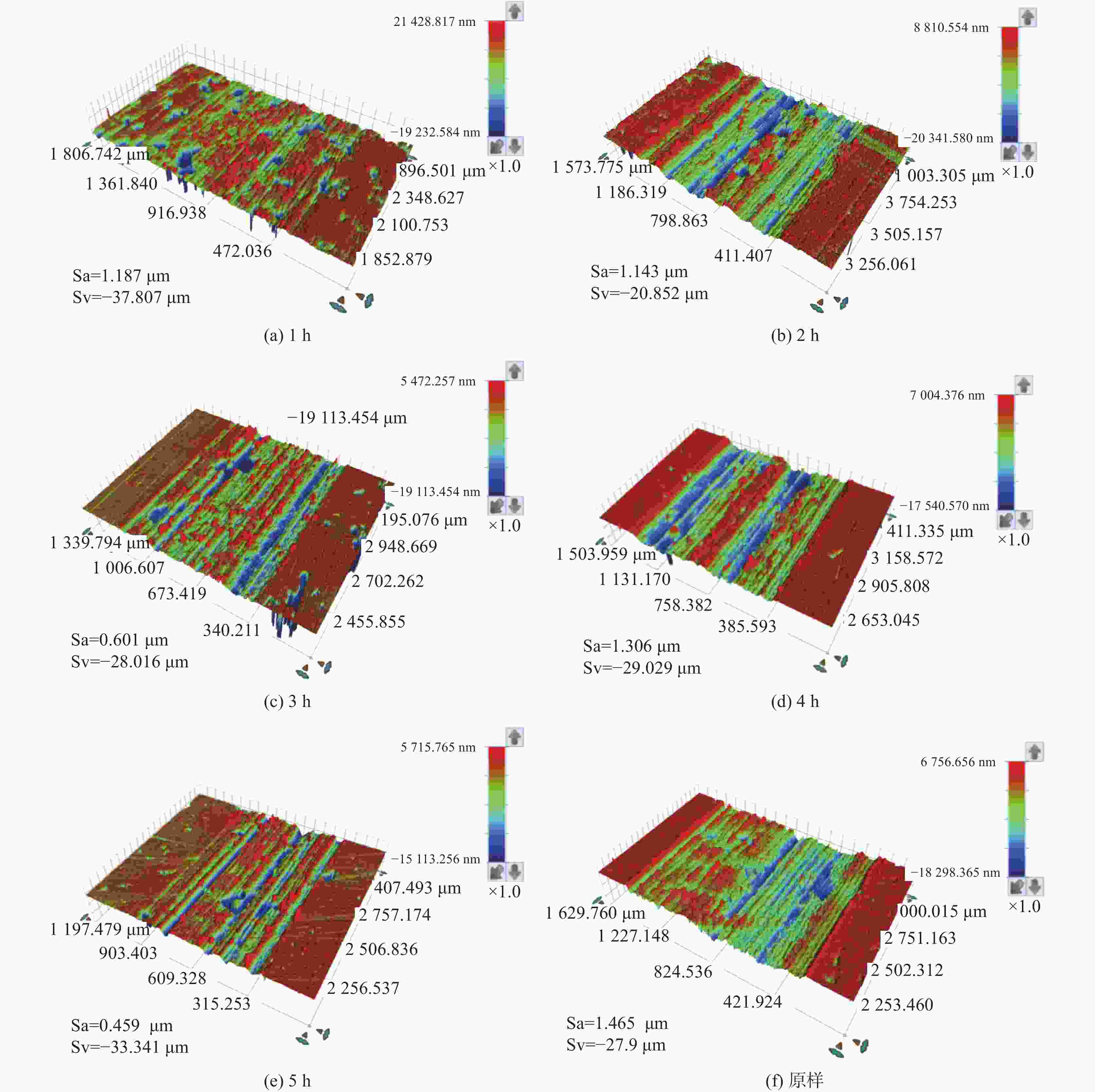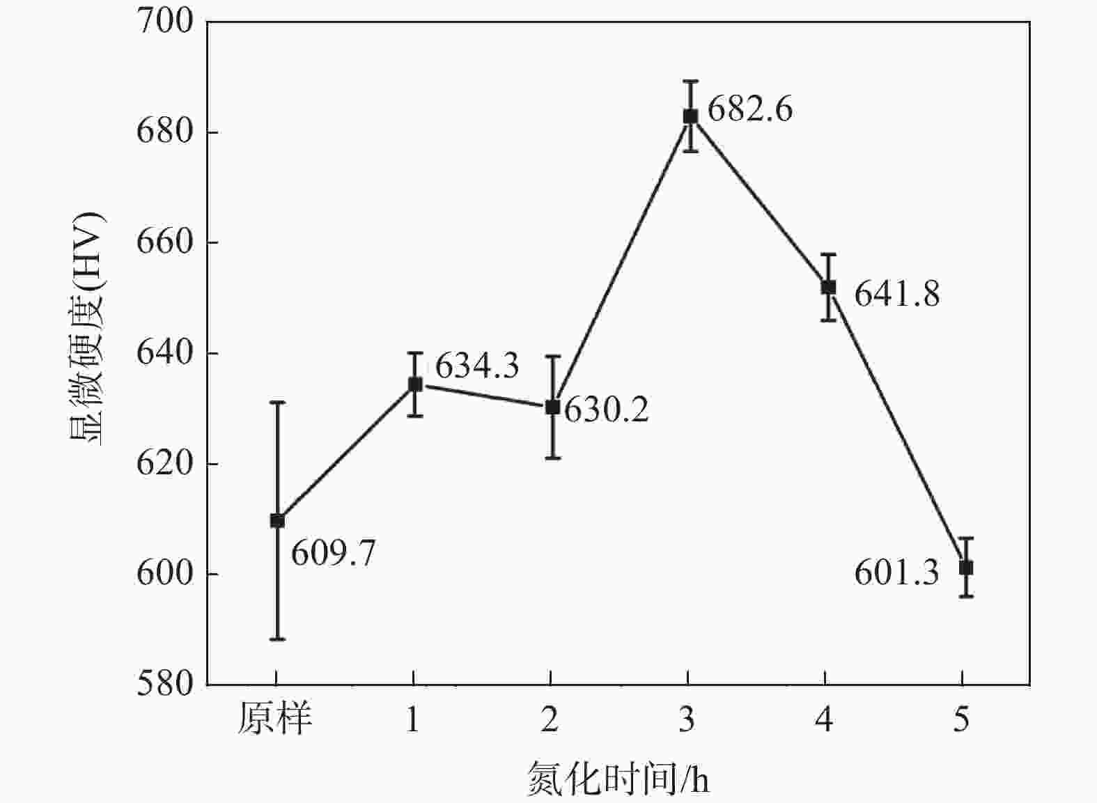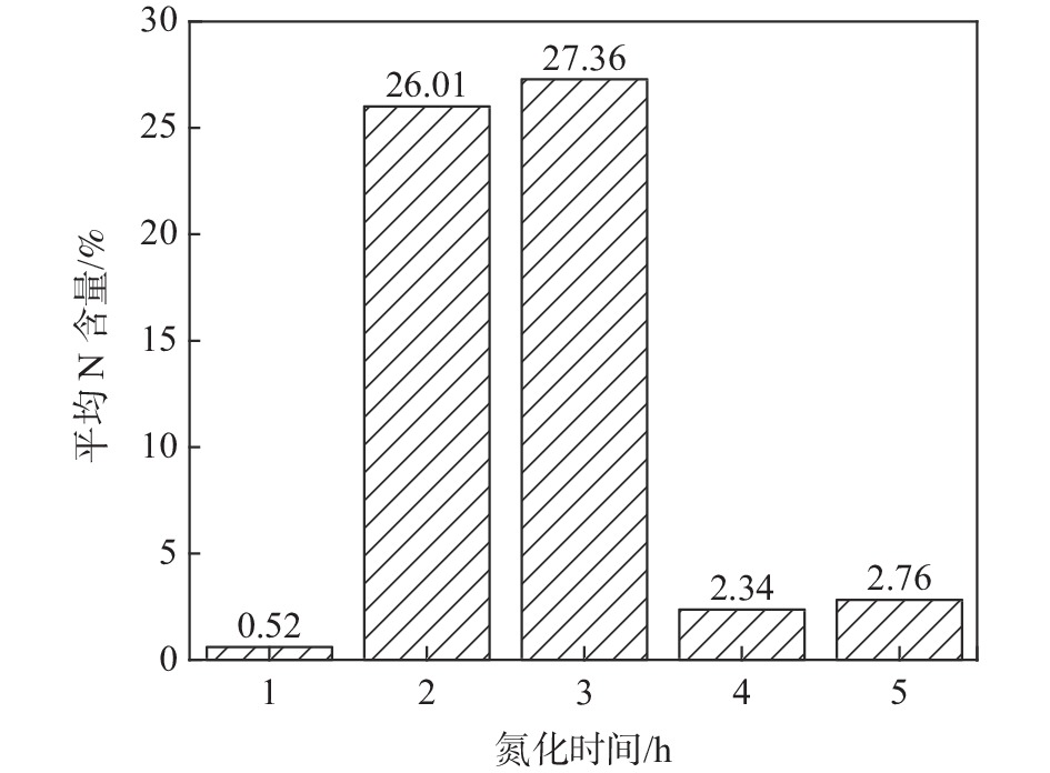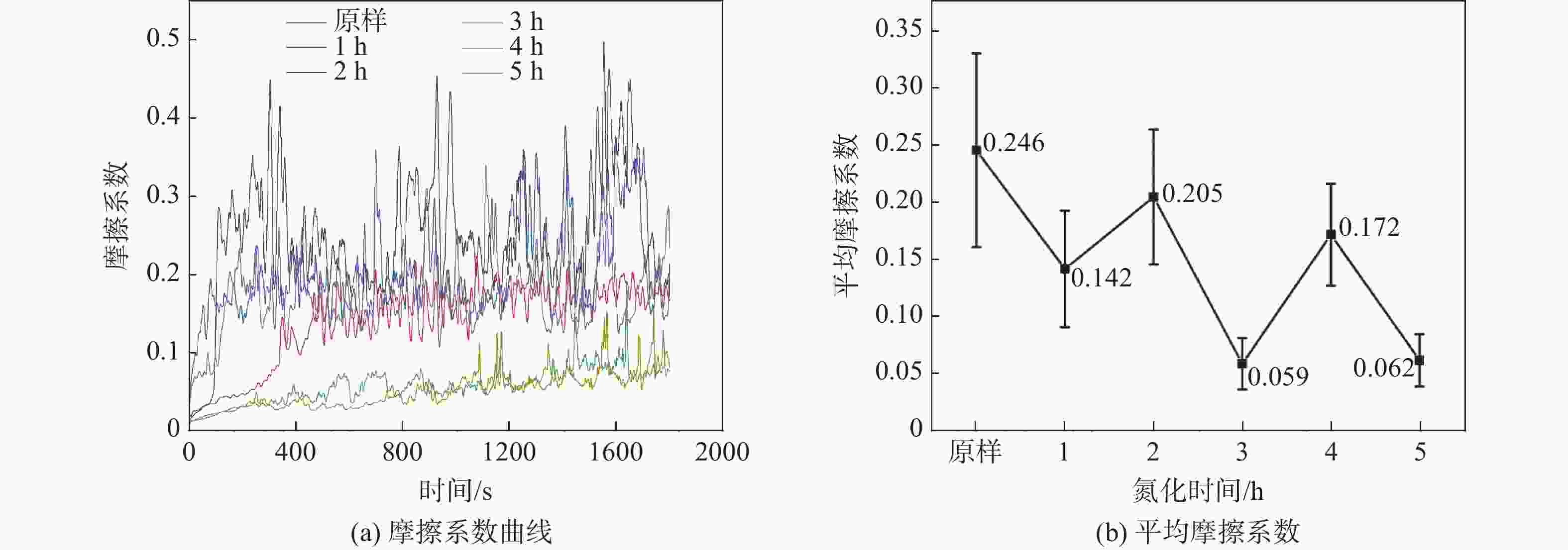 氮化时间/h 磨损量/g 磨损体积/mm3 磨损率/[mm3·(N·m)−1] 原样 0.00017 8.69×10−3 34.76 1 0.00016 8.60×10−3 34 2 0.00009 7.91×10−3 31.64 3 0.00004 2.37×10−3 9.48 4 0.00010 6.97×10−3 27.88 5 0.00007 3.36×10−3 13.44 -