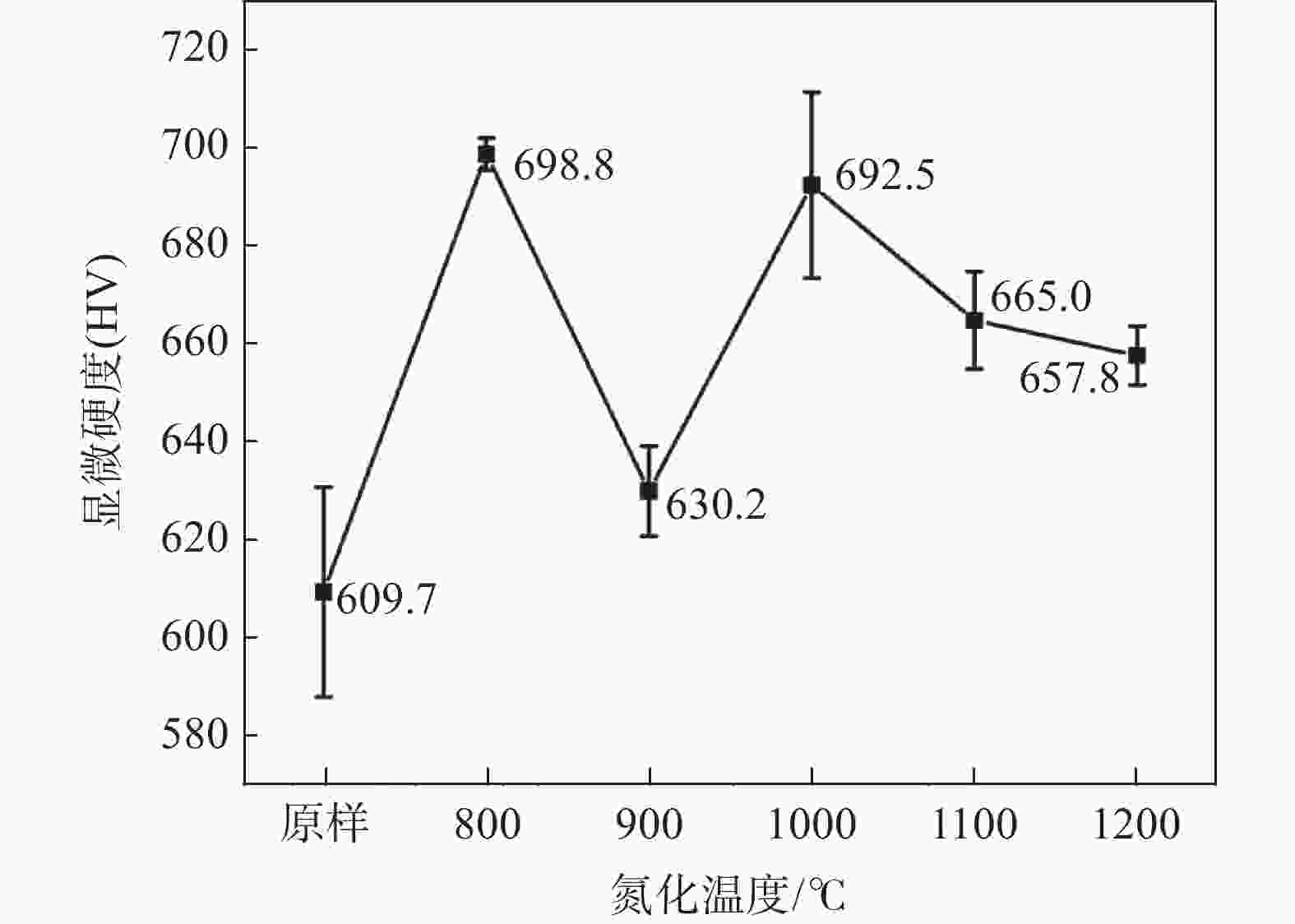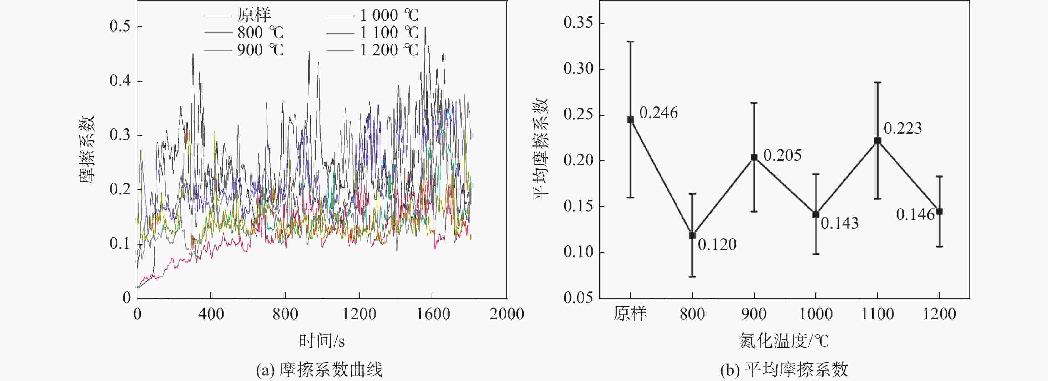 氮化温度/℃ 磨损量/g 磨损体积/mm3 磨损率/[mm3·(N·m)−1] 原样 0.00017 8.69×10−3 34.76 800 0.00006 4.86×10−3 19.44 900 0.00009 7.91×10−3 31.64 1000 0.00013 6.30×10−3 25.2 1100 0.00011 7.05×10−3 28.2 1200 0.00013 6.47×10−3 25.88 表 3 氮化时间不同的氮化层的磨损量、磨损体积及磨损率