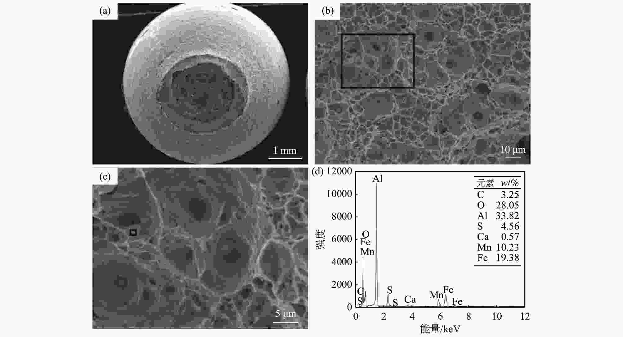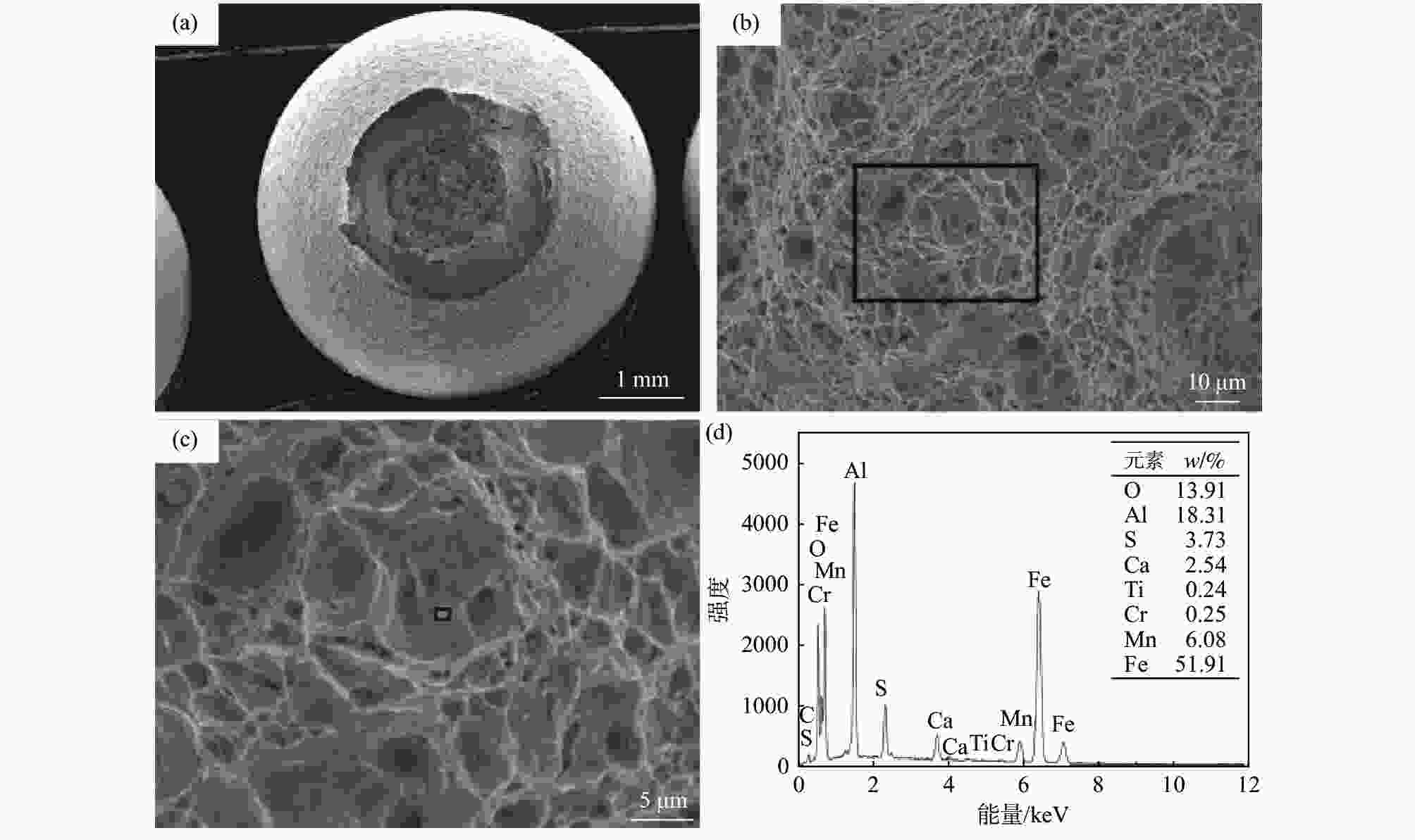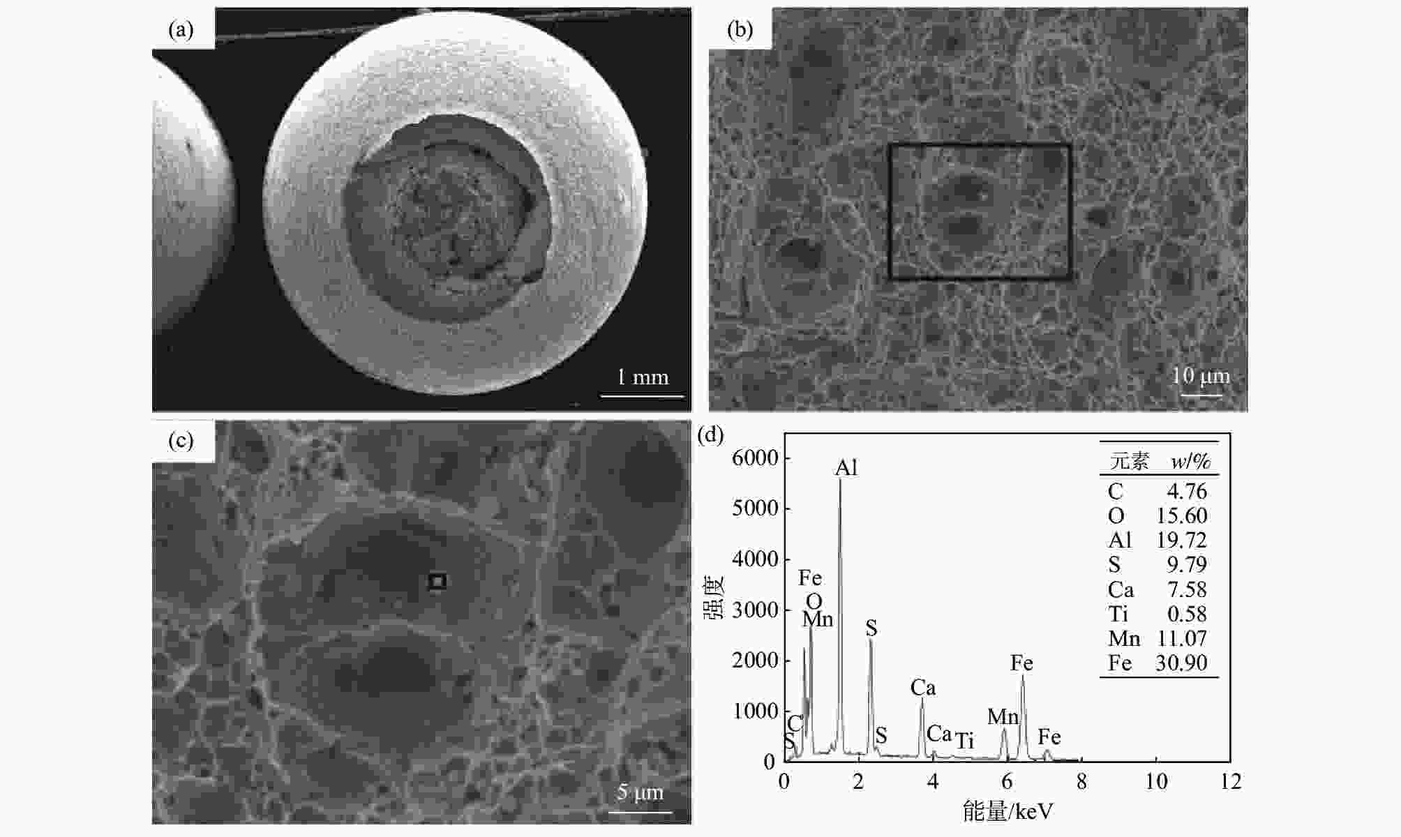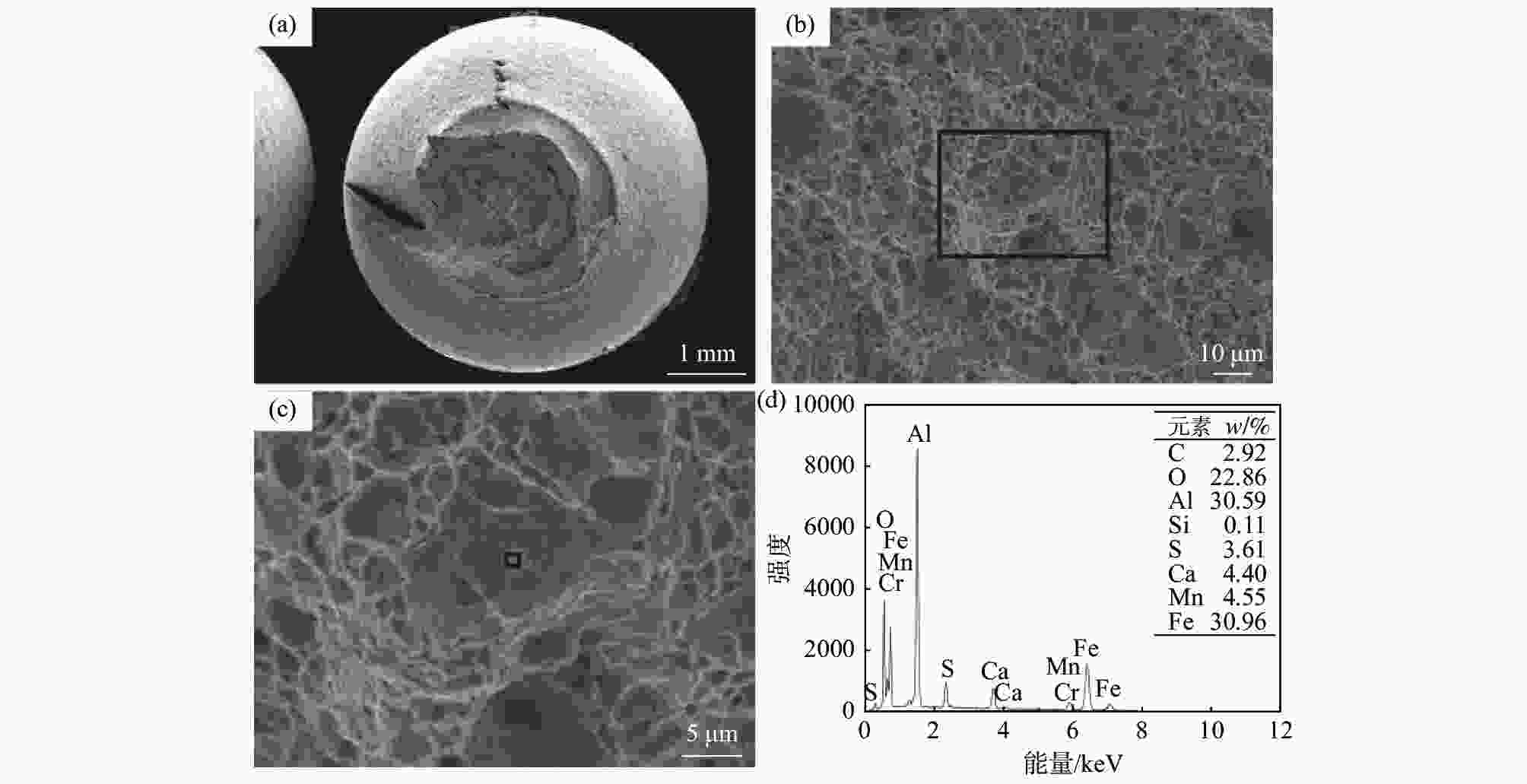 (a)断口宏观形貌;(b)断口纤维区显微形貌;(c)对应(b)中韧窝高倍形貌;(d)韧窝底部夹杂物EDS分析结果