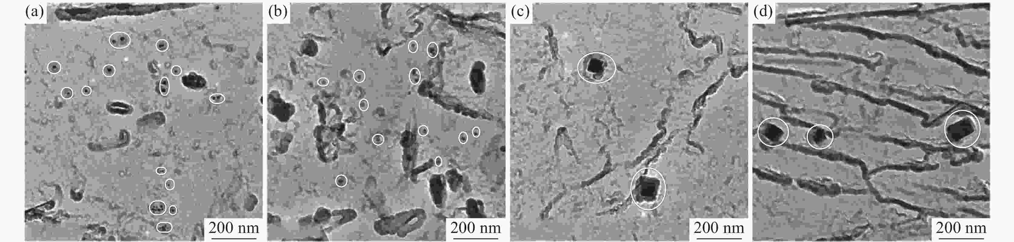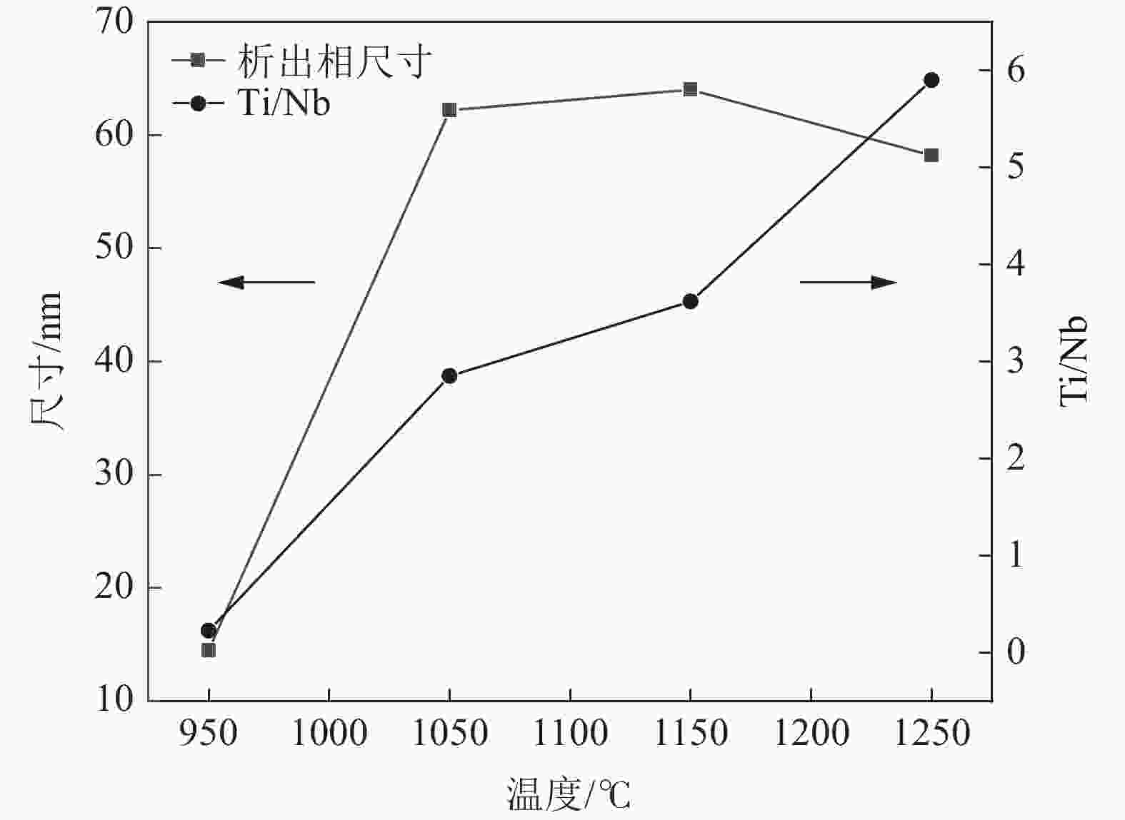 温度/℃ 夹杂物类型 Ti/% Nb/% C/% 形状 950 高Ti低Nb 47.8 8.3 44 方形 950 高Nb低Ti 2.2 8.4 89.4 方形 1050 高Ti低Nb 49.6 16.5 33.9 方形 1150 高Ti低Nb 57.6 14.4 28 方形 1250 高Ti低Nb 49.9 13.2 36.9 方形 -