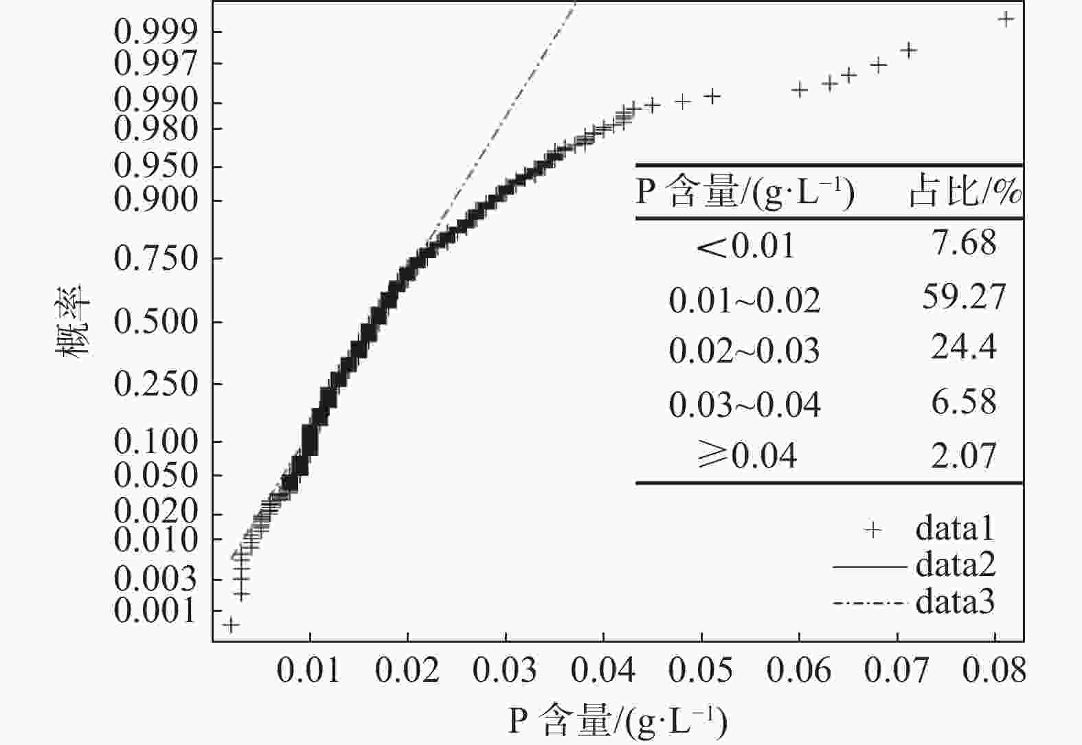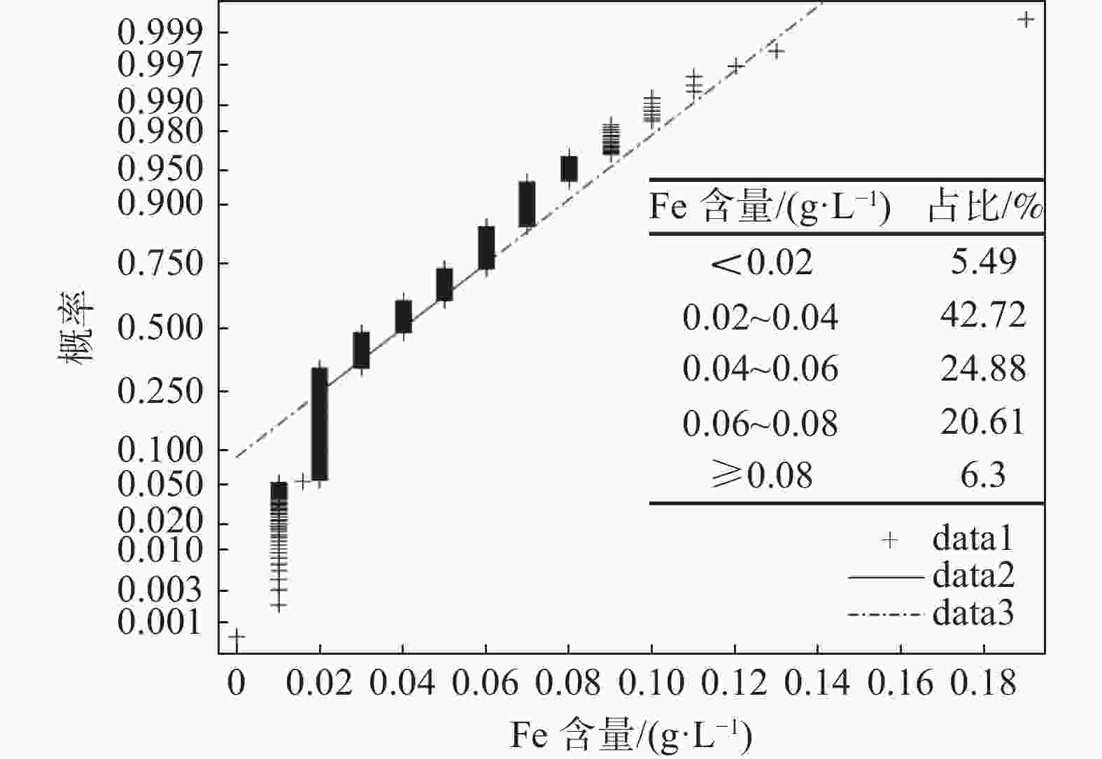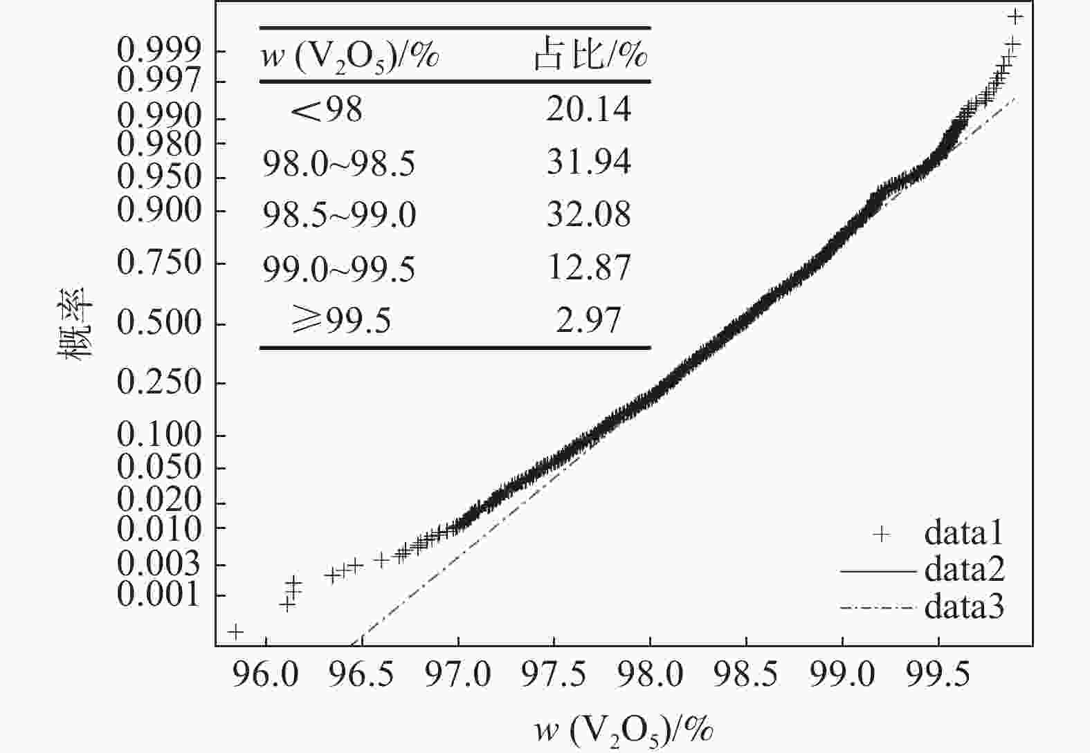 元素 样本数量/个 含量/(g·L−1) 方差 标准差 均值 中位数 V 820 23.3528 23.2600 5.3362 2.3100 P 820 0.0182 0.0170 7.3699 ×10−50.0086 Mn 819 13.6500 13.6500 9.1627 3.0270 Si 820 0.4639 0.4600 0.0132 0.1148 Fe 819 0.0406 0.0400 4.9814 ×10−40.0223 表 2 五氧化二钒样本数据