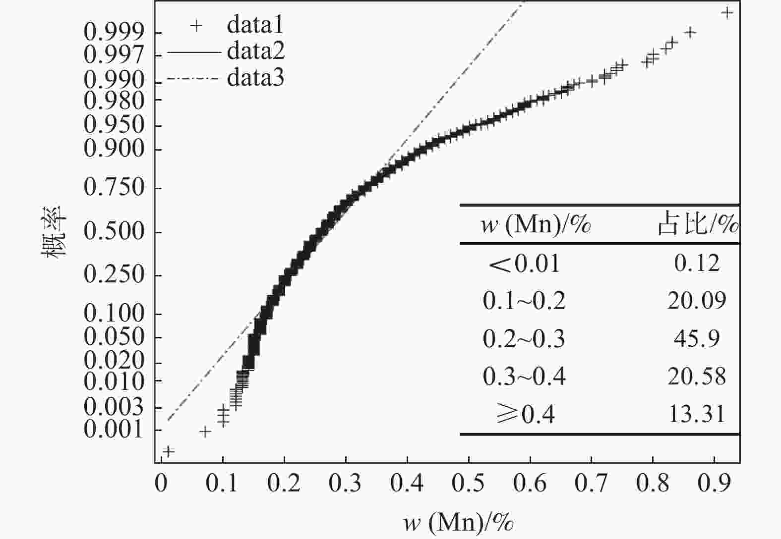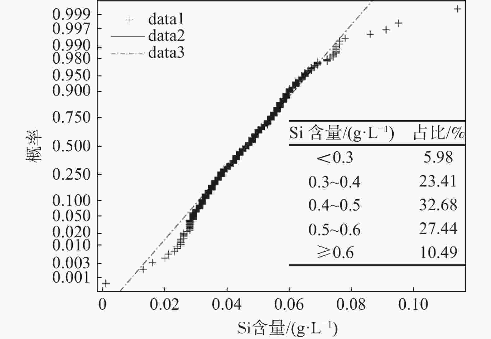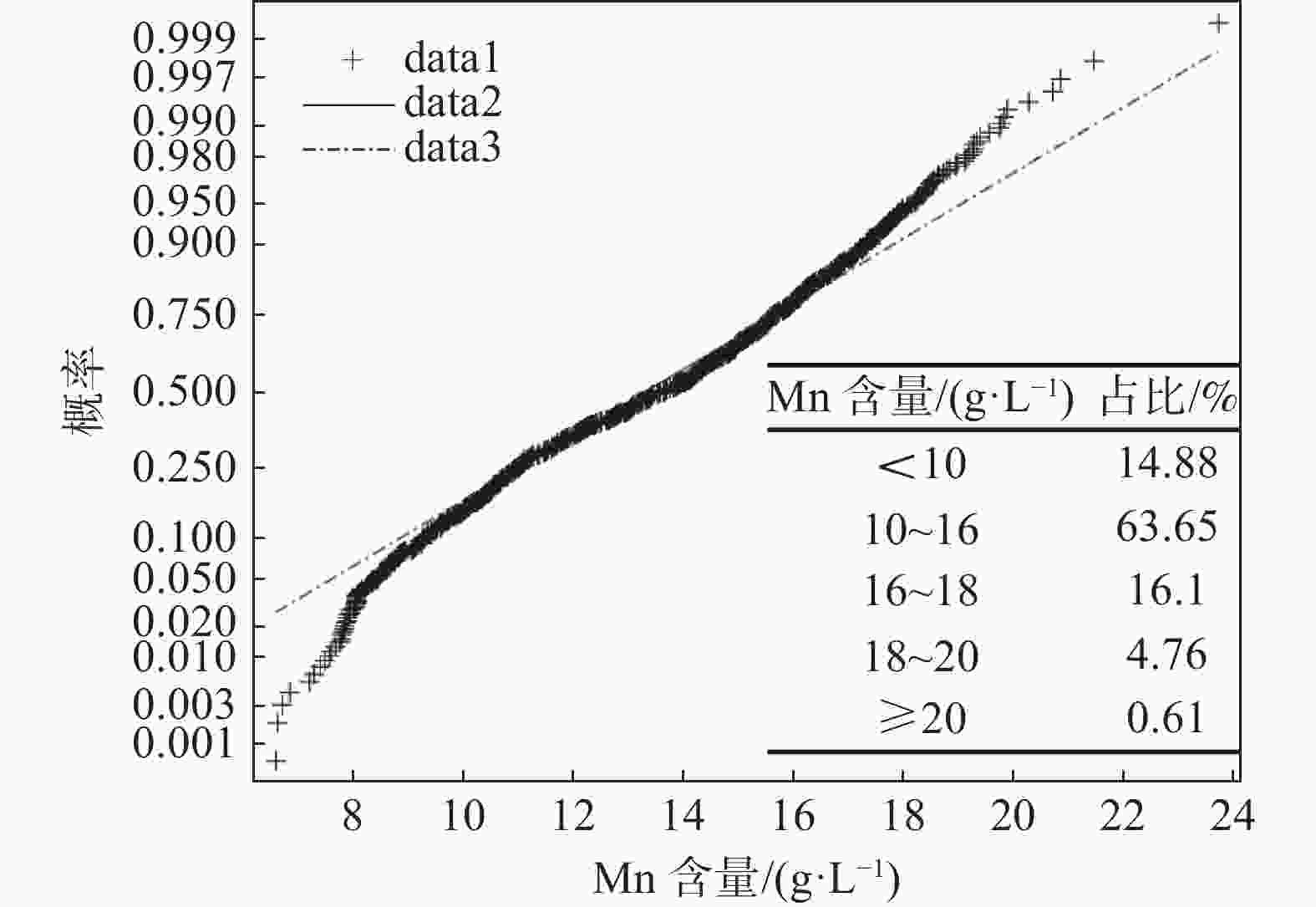 0.6847 、0.6663 ,线性相关程度最高;合格液中Mn与五氧化二钒中Mn的Pearson系数为0.3612 ,合格液中Fe与五氧化二钒中Si的Pearson系数为0.3564 ,具有一定的线性相关;合格液中P与五氧化二钒中Si的Pearson系数为−0.3291 ,合格液中V与五氧化二钒中P的Pearson系数为−0.2259 ,具有一定的负线性相关。合格液中其余元素含量与五氧化二钒中元素含量的Pearson系数的绝对值均小于0.16,说明相关性不强。五氧化二钒和合格液中P、Mn、Fe、Si、V含量均不服从正态分布,反映出统一样本过程不稳定,即生产过程不稳定,因此减少合格液成分异常波动,规避沉钒过程中对五氧化二钒质量产生较大影响的因素,可以提高五氧化二钒成分的稳定性。该研究为生产合格五氧化二钒提供了一定的理论技术支撑。Abstract: The effects of phosphorus, iron, manganese, silicon and vanadium in the qualified solution during vanadium precipitation on the composition of vanadium pentoxide were investigated through multivariate correlation analysis using Pearson coefficient statistics, probability density analysis and probability density cumulative distribution analysis methods. The results show that the Pearson coefficients of P, Mn content in qualified solution and P content in vanadium pentoxide are0.6847 and0.6663 , respectively, with the highest degree of linear dependence. The Pearson coefficients of Mn, Fe in qualified liquid and Mn, Si in vanadium pentoxide are0.3612 and0.3564 , respectively, indicating a certain degree of linear dependence. The Pearson coefficients of P, V in qualified liquid and Si, P in vanadium pentoxide are −0.3291 and −0.2258 , respectively, representing a certain degree of negative linear correlation. The absolute value of Pearson coefficients for the content of other elements in the qualified solution and vanadium pentoxide are all less than 0.16, indicating a weak correlation. The contents of P, Mn, Fe, Si and V in vanadium pentoxide and qualified solution do not follow a normal distribution, reflecting the instability of the unified sample process, that is, the unstable production process. Therefore, it is necessary to reduce the abnormal fluctuation of qualified solution composition and avoid the factors that have relatively great impacts on the vanadium precipitation, which contributes to improve the stability of vanadium oxide composition. This work can provide some theoretical and technical support for the production of qualified vanadium oxide. -