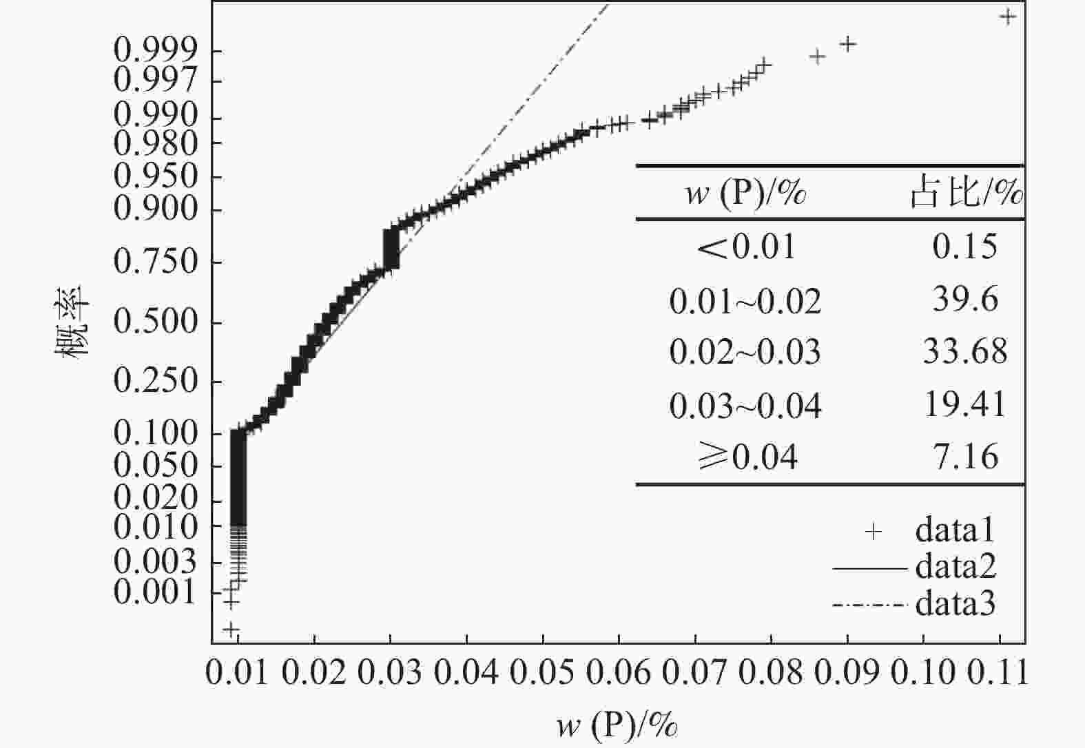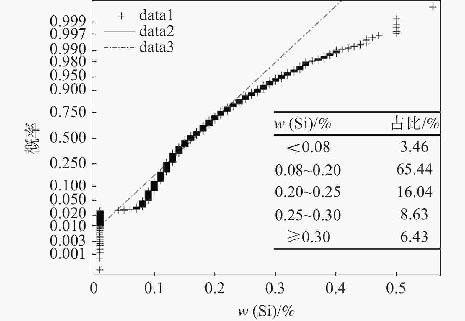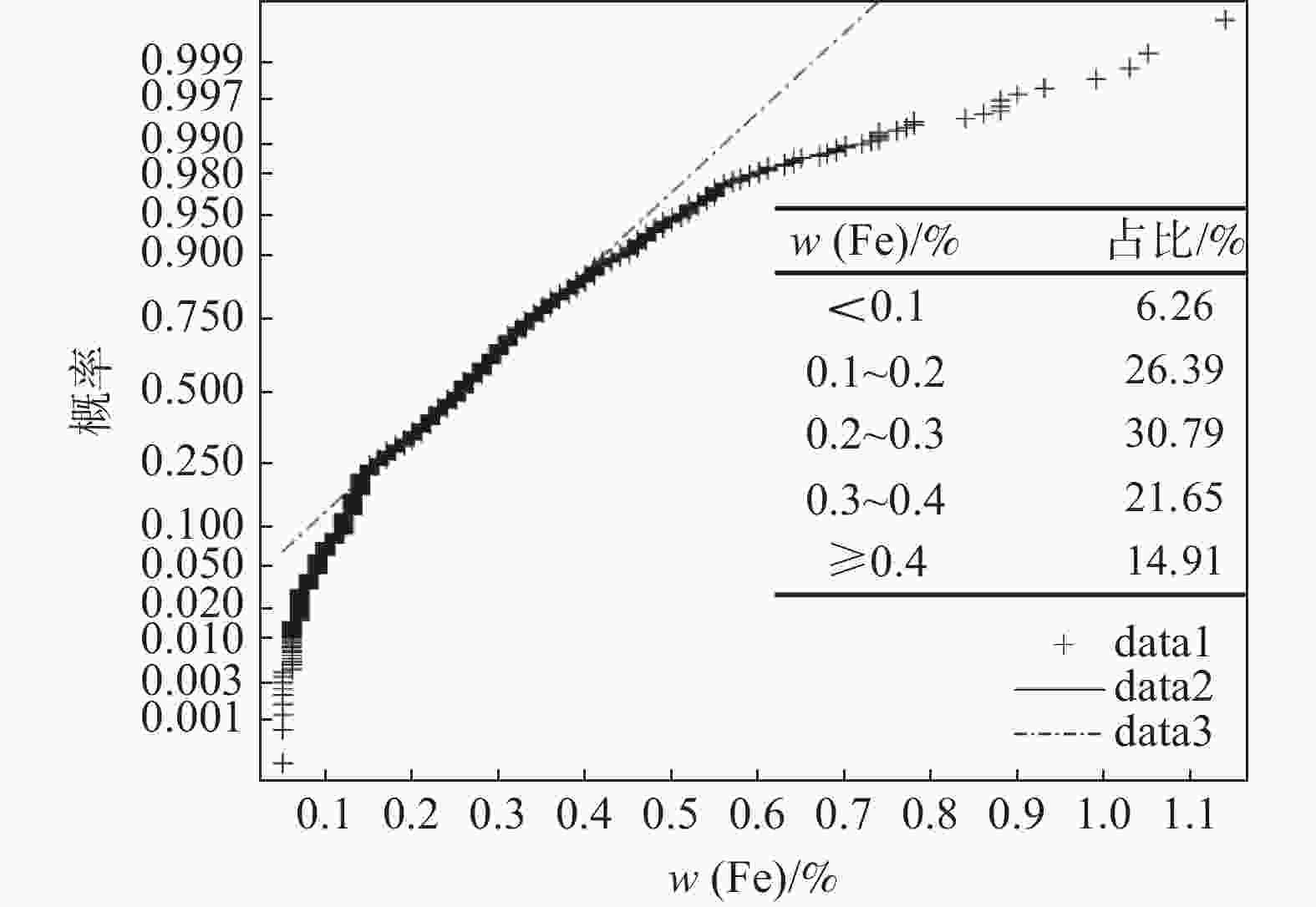 0.6847 、0.6663 ,线性相关程度最高;合格液中Mn与五氧化二钒中Mn的Pearson系数为0.3612 ,合格液中Fe与五氧化二钒中Si的Pearson系数为0.3564 ,具有一定的线性相关;合格液中P与五氧化二钒中Si的Pearson系数为−0.3291 ,合格液中V与五氧化二钒中P的Pearson系数为−0.2259 ,具有一定的负线性相关。合格液中其余元素含量与五氧化二钒中元素含量的Pearson系数的绝对值均小于0.16,说明相关性不强。五氧化二钒和合格液中P、Mn、Fe、Si、V含量均不服从正态分布,反映出统一样本过程不稳定,即生产过程不稳定,因此减少合格液成分异常波动,规避沉钒过程中对五氧化二钒质量产生较大影响的因素,可以提高五氧化二钒成分的稳定性。该研究为生产合格五氧化二钒提供了一定的理论技术支撑。Abstract: The effects of phosphorus, iron, manganese, silicon and vanadium in the qualified solution during vanadium precipitation on the composition of vanadium pentoxide were investigated through multivariate correlation analysis using Pearson coefficient statistics, probability density analysis and probability density cumulative distribution analysis methods. The results show that the Pearson coefficients of P, Mn content in qualified solution and P content in vanadium pentoxide are0.6847 and0.6663 , respectively, with the highest degree of linear dependence. The Pearson coefficients of Mn, Fe in qualified liquid and Mn, Si in vanadium pentoxide are0.3612 and0.3564 , respectively, indicating a certain degree of linear dependence. The Pearson coefficients of P, V in qualified liquid and Si, P in vanadium pentoxide are −0.3291 and −0.2258 , respectively, representing a certain degree of negative linear correlation. The absolute value of Pearson coefficients for the content of other elements in the qualified solution and vanadium pentoxide are all less than 0.16, indicating a weak correlation. The contents of P, Mn, Fe, Si and V in vanadium pentoxide and qualified solution do not follow a normal distribution, reflecting the instability of the unified sample process, that is, the unstable production process. Therefore, it is necessary to reduce the abnormal fluctuation of qualified solution composition and avoid the factors that have relatively great impacts on the vanadium precipitation, which contributes to improve the stability of vanadium oxide composition. This work can provide some theoretical and technical support for the production of qualified vanadium oxide. -