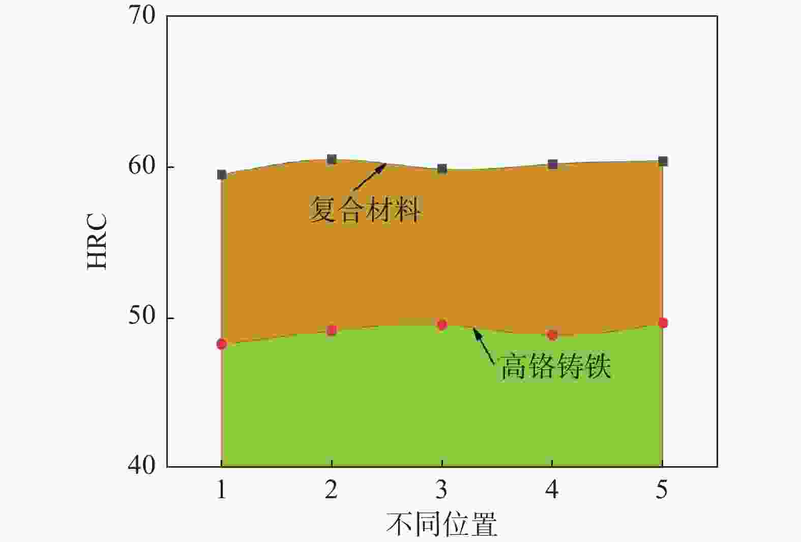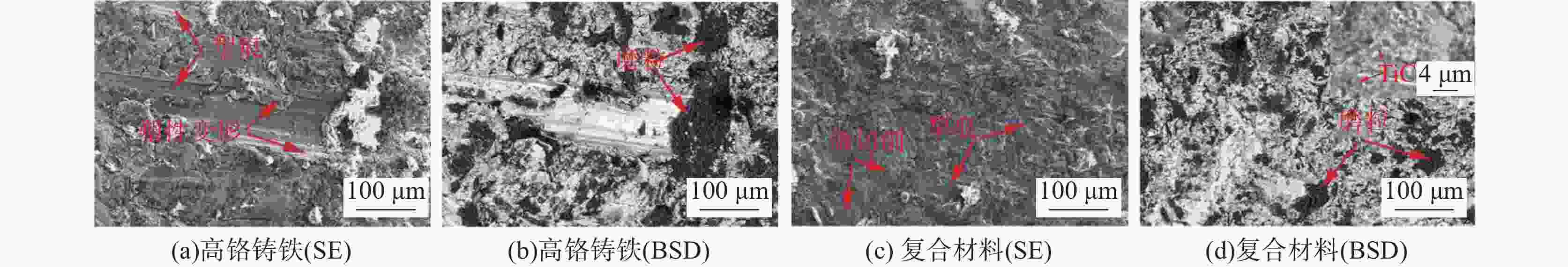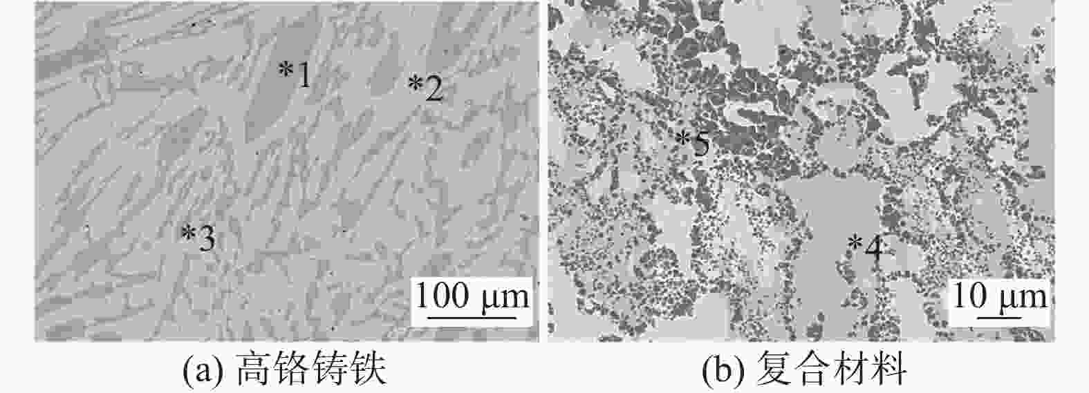 试验钢 点 y/% C Si Ti Cr Fe 高铬铸铁 1 36.08 42.98 20.94 2 19.32 1.24 10.05 63.39 3 36.21 41.54 21.77 复合材料 4 41.05 56.68 1.21 1.06 5 38.8 0.18 53.38 4.27 3.37 -