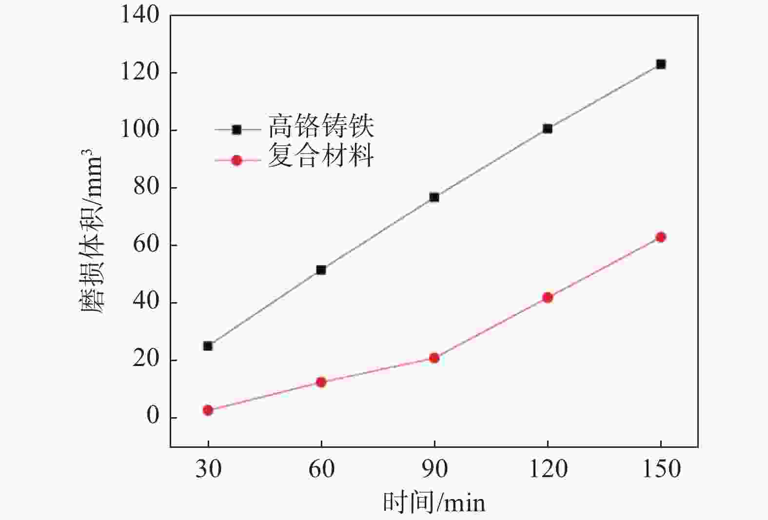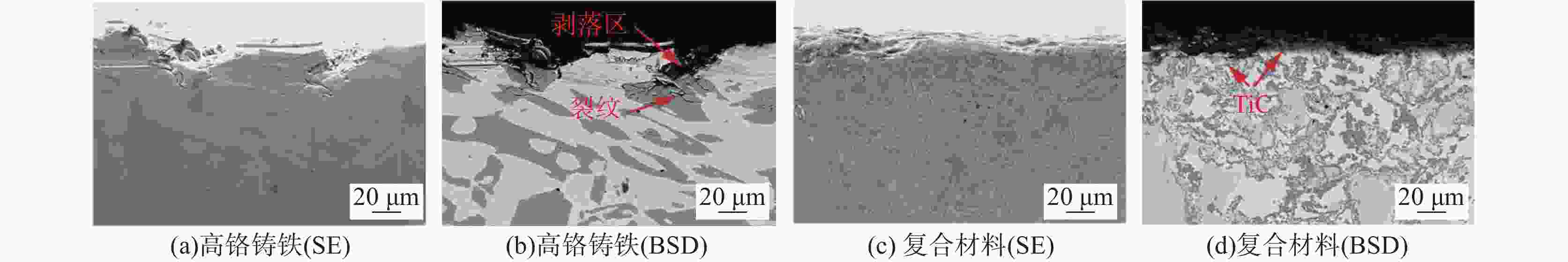 摘要: 通过铸造烧结法制备TiC颗粒增强高铬铸铁基复合材料,采用EDS、SEM等检测手段研究增强颗粒对材料显微组织和磨损行为的影响规律。结果表明,与高铬铸铁相比,复合材料中由于TiC颗粒的存在使其洛氏硬度(HRC)从49提高到了60。在磨损过程中,高铬铸铁表面的M7C3型碳化物在磨粒的反复作用下出现了明显的裂纹,并逐渐向基体内扩展。破碎后的碳化物容易脱落,不能有效阻止磨粒在材料表面的犁削作用,加剧了材料的磨损。而在复合材料中,随着较软的基体相优先被磨料削除,会裸露出大量的TiC颗粒。这些表面凸起的TiC颗粒承担磨粒的主要破坏作用,从而有效保护基体材料。对比发现,在相同的磨损条件下,复合材料的耐磨性与高铬铸铁相比提高了1.95倍。Abstract: TiC particles reinforced high chromium cast iron matrix composites were prepared by casting sintering method. The effects of reinforced particles on the microstructure and wear behavior of the composites were studied by EDS and SEM. The results showed that the Rockwell hardness (HRC) of the composites increases from 49 to 60 compared with high chromium cast iron, due to the presence of TiC particles. During the wear process, the M7C3 carbides on the surface of high chromium cast iron appeared obvious cracks under the repeated action of abrasive particles, and gradually expanded into the matrix. The broken carbides are easy to fall off, which cannot effectively prevent the ploughing effect of abrasive particles on the surface of the material and aggravate the wear of the material. In the composites, a large number of TiC particles are exposed as the softer matrix phase is preferentially removed by the abrasive. These surface convex TiC particles bear the main damage of the abrasive particles, thus effectively protecting the matrix material. Through experimental comparison, it is found that the wear resistance of the composites is 1.95 times higher than that of high chromium cast iron under the same wear conditions.