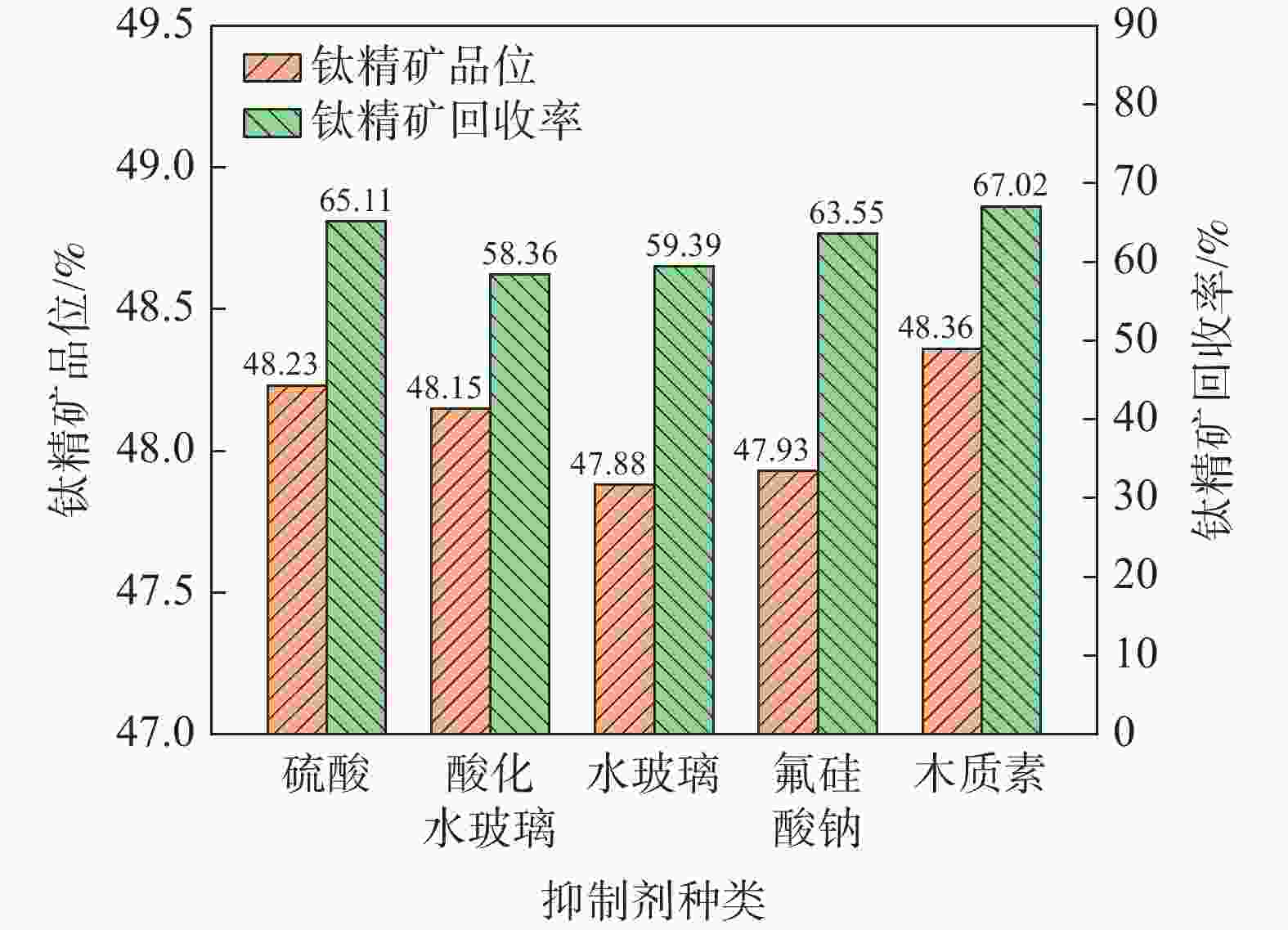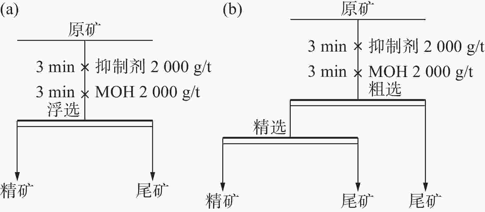 摘要: 攀西地区某选厂浮钛精矿品位为46.84%,其中脉石矿物SiO2、CaO不利于后续氯化法制钛白粉。加入抑制剂(酸化水玻璃、硫酸、水玻璃、氟硅酸钠以及木质素),均可有效抑制脉石矿物上浮,提高钛精矿品位,其中硫酸和木质素效果较好,综合成本确定硫酸为提质浮选抑制剂。采用一次浮选流程考察搅拌时间、硫酸用量、捕收剂用量对最终钛精矿品位和回收率的影响,确定搅拌时间10 min、硫酸用量