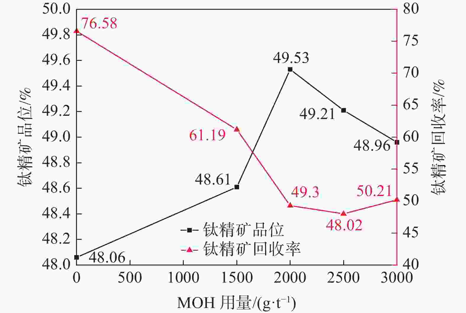 2000 g/t、MOH用量2000 g/t为最佳浮选条件。在最佳浮选条件下,经过一粗一精浮选流程,可将钛精矿品位由46.84%提升至50.04%,钛精矿回收率为41.93%,且CaO+SiO2≤1.5%,满足提质要求。Abstract: The floating titanium concentrate grade of a concentrator in Panxi area is 46.84%, among which gangue minerals SiO2 and CaO are not conducive to the subsequent chlorination process of titanium dioxide. Adding inhibitors to acidified sodium silicate, sulfuric acid, sodium silicate, sodium fluorosilicate and lignin can effectively inhibit gangue minerals from floating and improve the grade of titanium concentrate, among which sulfuric acid and lignin show the best effect, and sulfuric acid is determined to be the quality improvement flotation inhibitor. The effects of stirring time, sulfuric acid dosage and collector dosage on the final grade and recovery of titanium concentrate were investigated by a single flotation process. The optimal flotation conditions were determined to be stirring time of 10 min, sulfuric acid dosage of2000 g/t and MOH dosage of2000 g/t. Under the optimal flotation conditions, the grade of titanium concentrate can be increased from 46.84% to 50.04%, the recovery rate of titanium concentrate is 41.93%, and the CaO+SiO2≤1.5%, which meets the quality improvement requirements. -