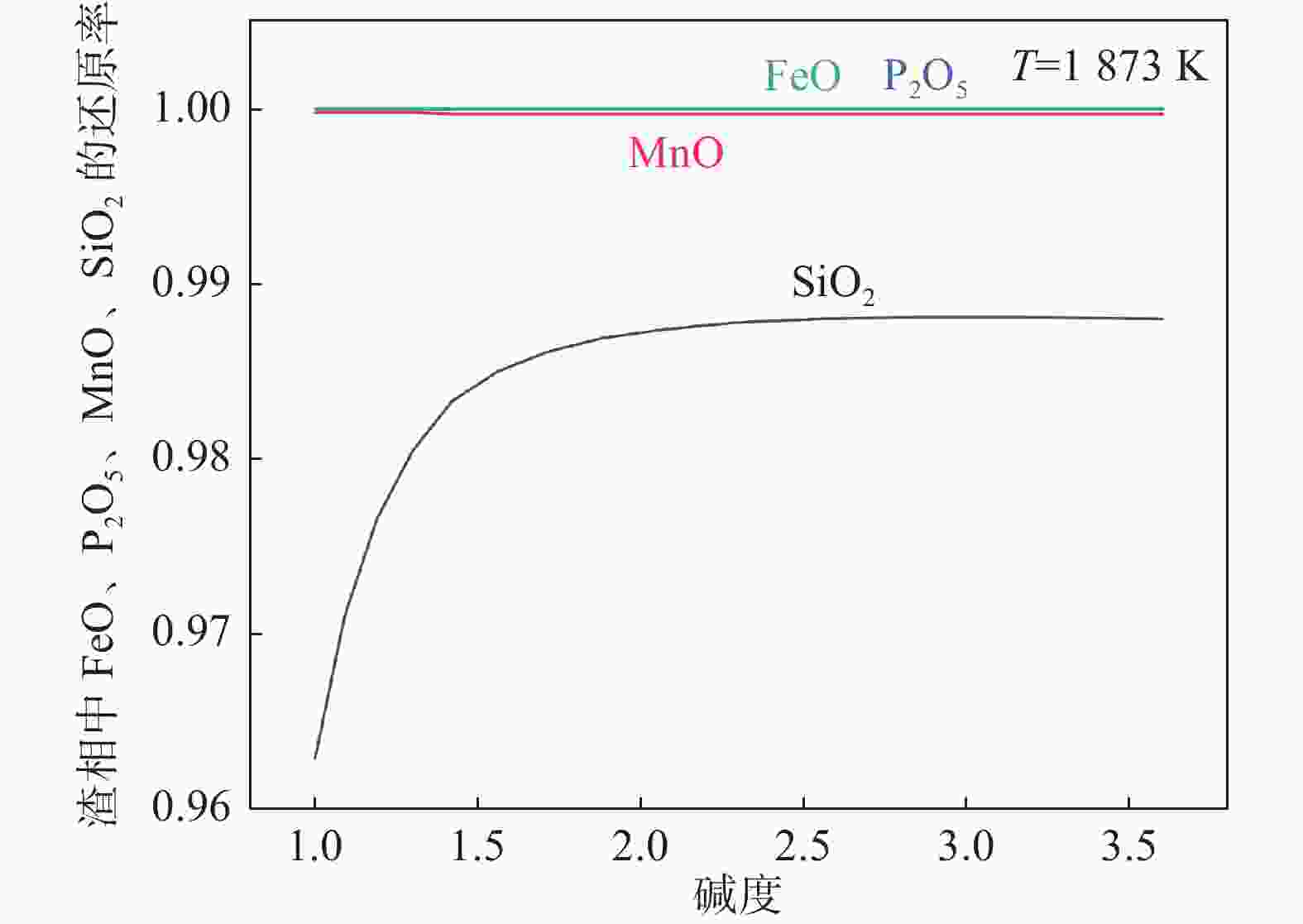 1873 K、w(Al/Slag)=20%时,铝热还原转炉钢渣回收有价元素的效果相对最佳,转炉钢渣中的FeO、P2O5、MnO、SiO2的还原率高达100%、100%、99.97%、98.12%。这为转炉钢渣铝热还原回收有价元素及钢渣资源化利用提供重要的研究基础。Abstract: Aiming at recovery of valuable elements such as Fe, P, Mn and Si from Bessemer steel slag and utilization of steel slag, the thermodynamic conditions and influencing rules of thermite reduction and recovery of valuable elements from Bessemer steel slag were analyzed by a Factsage8.2 software thermodynamic calculation system. The results show that basicity of the slag has little effect on the recovery of FeO, P2O5 and MnO in thermite reduction, and the improvement of slag basicity is beneficial to SiO2 recovery. The change of temperature has little effect on the recovery of FeO, P2O5 and MnO, but increasing temperature is not conducive to the reduction of SiO2 in the steel slag. When the slag basicity is 3.18 and the temperature is1873 K, w(Al/Slag)=20%, the recovery of valuable elements can be achieved the relatively best effect, and the reduction rates of FeO, P2O5, MnO and SiO2 in the slag are as high as 100%, 100%, 99.97% and 98.12%, respectively. These studied results can be used for the efficient recovery of valuable elements and resource utilization of steel slag by thermite reduction.-
