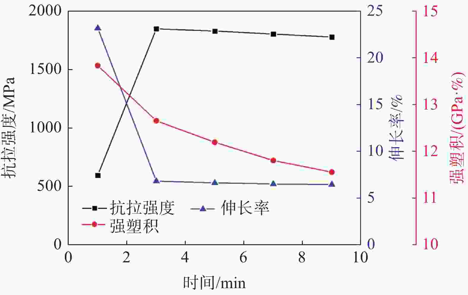 1800 MPa级超高强热成形钢组织性能演变进行了试验研究,确定了最佳的热成形奥氏体化工艺制度。结果表明,当奥氏体化温度及保温时间分别达到840 ℃、3 min时,1800 MPa级超高强热成形钢淬火后的组织均为马氏体,且马氏体组织随着奥氏体化温度的升高及保温时间的增加逐渐粗大,抗拉强度逐渐下降。当奥氏体化温度为840 ℃时,抗拉强度、伸长率及强塑积分别可以达到1861.3 MPa、6.88%、12.81 GPa·%;当保温时间为3 min时,抗拉强度、伸长率及强塑积分别可以达到1851.28 MPa、6.84%、12.66 GPa·%。最佳奥氏体化工艺制度为:奥氏体化温度840 ℃,保温时间3 min。Abstract: The evolution of microstructures and properties of 1800 MPa ultra-high strength hot stamping steels under different austenitizing temperatures and holding times were experimentally studied in this paper, and the optimum hot stamping austenitizing process was established. The results show that when the austenitizing temperature and holding time reach 840 ℃ and 3 min, respectively, the quenched microstructures of the hot stamping steel is consisted of martensite, and the martensite becomes coarser with the increase in temperature and holding time. The tensile strength decreases gradually with the increase of the austenitizing temperature and holding time. When the austenitizing temperature is 840 ℃, the tensile strength, elongation and strength-ductility product can reach1861.3 MPa, 6.88% and 12.81 GPa·%, respectively. When the holding time is 3 min, the tensile strength, elongation and strength-ductility product can reach1851.28 MPa, 6.84% and 12.66 GPa·%, respectively. The austenitizing temperature of 840 ℃ and holding time of 3 min are selected as the optimum austenitizing parameters. -