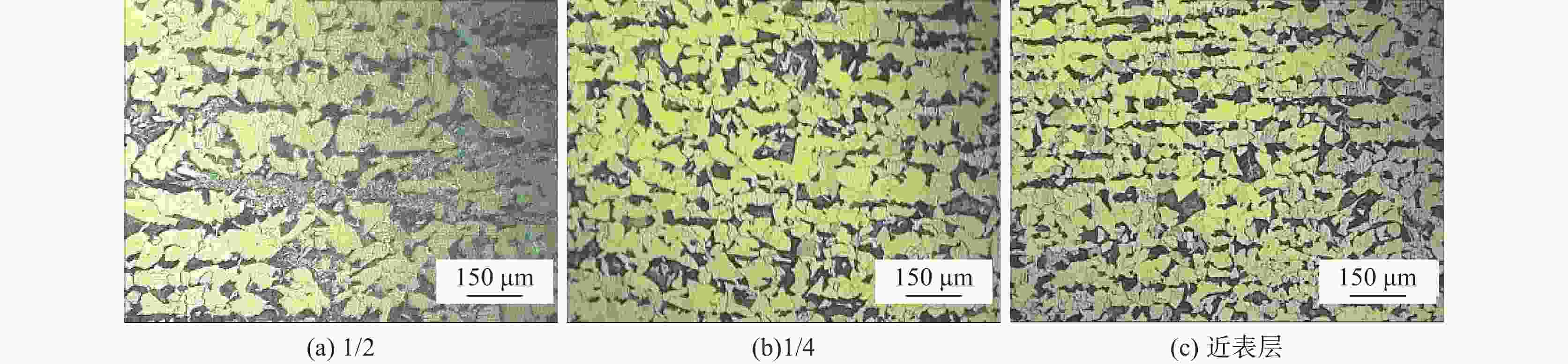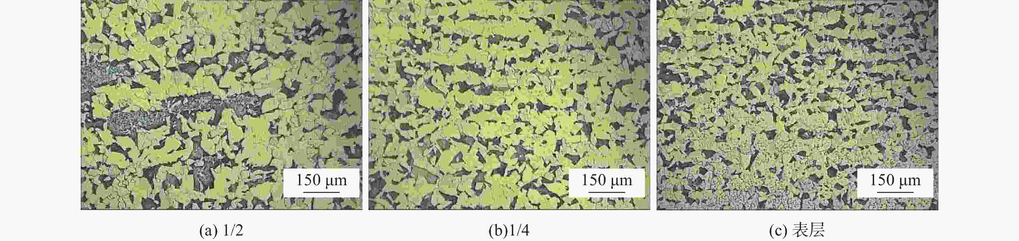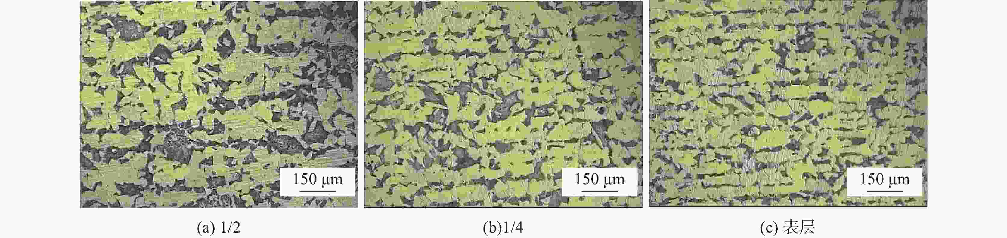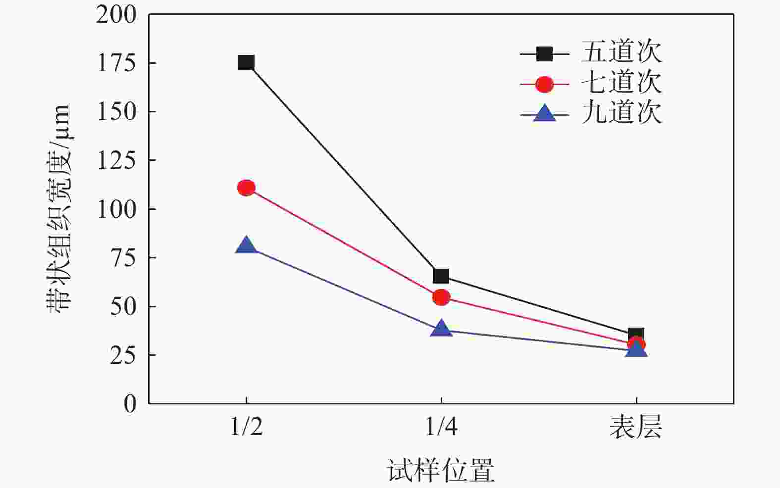 摘要: 低碳微合金钢在轧制过程中经常出现带状组织缺陷,对产品质量和使用性能都有着重要的影响。以某厂Q345热轧板坯为研究对象,通过对元素偏析,轧件热轧过程不同轧制道次、不同位置带状组织演变行为进行分析,结果表明,枝晶间溶质元素偏析是导致带状组织形成的本质原因。同时发现不同轧制道次和不同位置轧材,带状组织尺寸有着明显差异。不同轧制道次,相同位置的带状组织,压下率越大,带状组织越细小,压下率为50%时,中心带状组织宽度约为175 μm;压下率为67%时,中心带状组织宽度约为75 μm。相同轧制道次下,不同轧件位置的带状组织比较,可以发现厚度中心位置带状组织最为粗大,表面处最为细小。Abstract: Banded structure defects often appear in low carbon microalloyed steels during rolling process, which have a great impact on the product quality and service properties. In this study, Q345 hot-rolled slab in a plant was selected as the research object, and the evolution of the banded structure in different rolling passes and positions during hot rolling was analyzed. The results show that the segregation of solute elements between dendrites is the essential reason for the formation of banded structure. At the same time, it is found that there are significant differences in the banded structure size of rolled products at different rolling passes and positions. For the banded structure at the same position in different rolling passes, the larger the reduction rate is, the smaller the banded structure is. When the reduction rate is 50%, the width of the central banded structure is about 175 μm. When the reduction rate is 67%, the width of the central banded tissue is about 75 μm. Under the same rolling pass, the comparison of banded structure at different rolling positions can be made. It is found that the banded structure at half-thickness is the largest, compared to the smallest band observed at the surface.