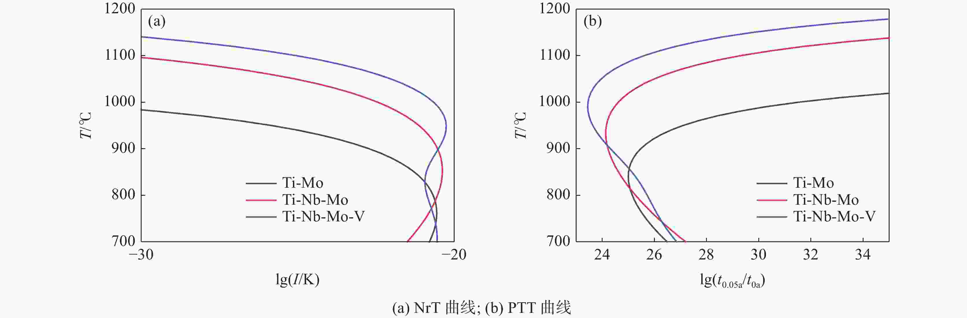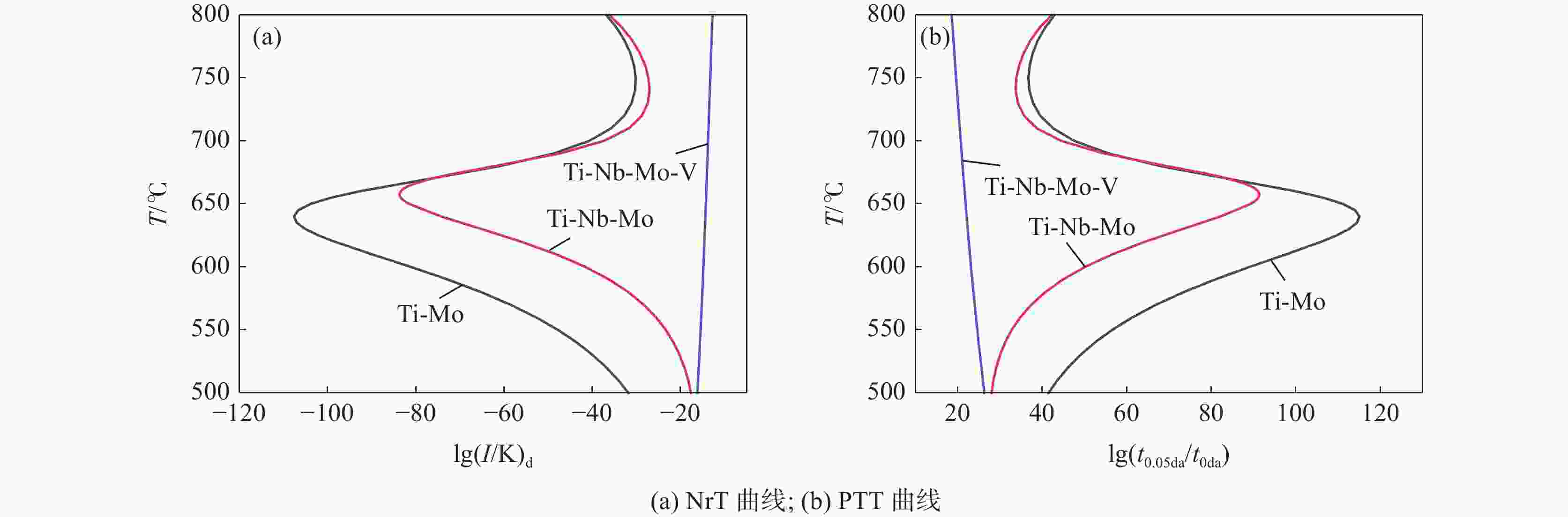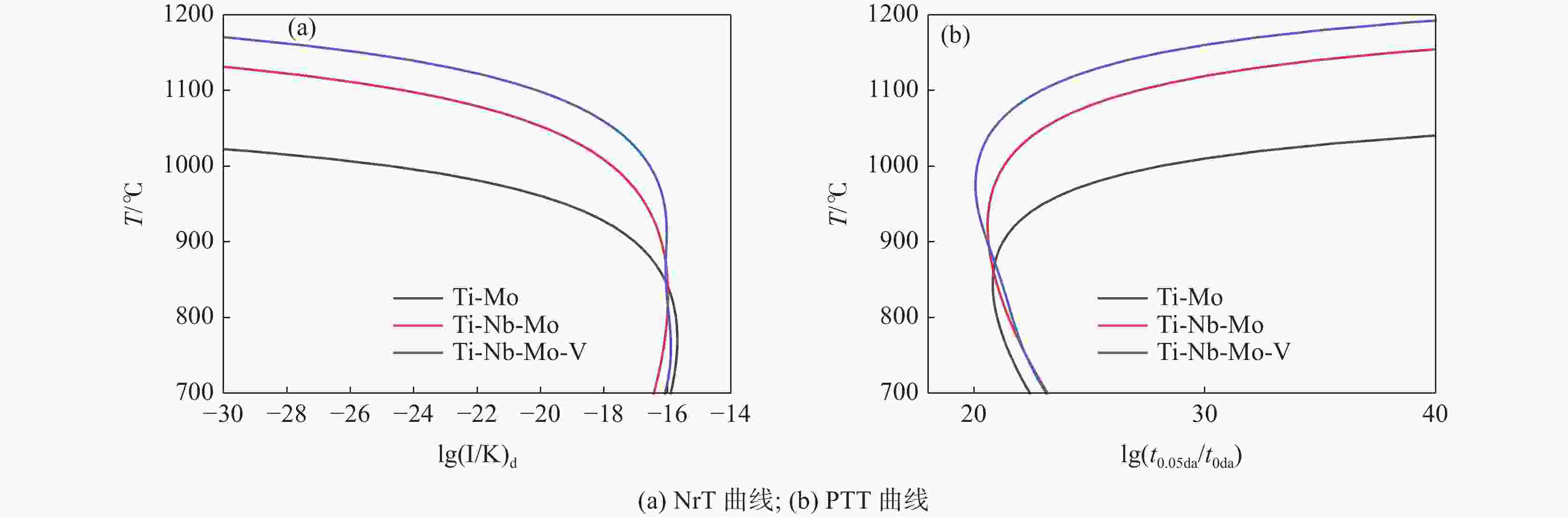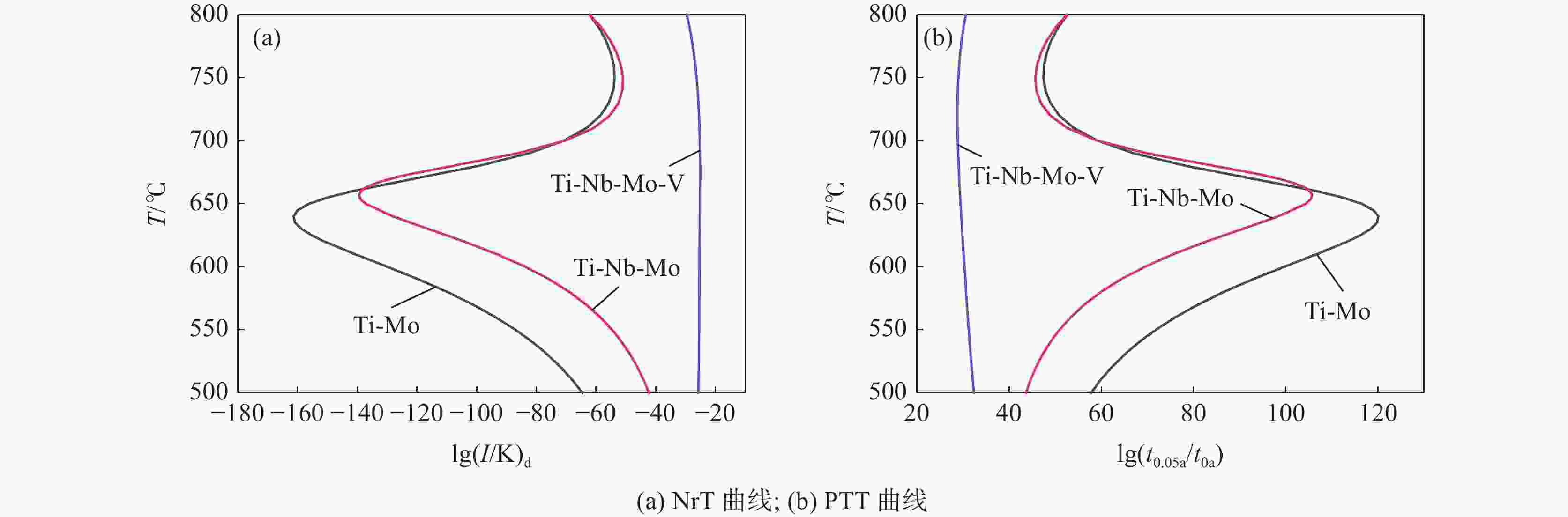T/℃ Ti-Mo Ti-Nb-Mo Ti-Nb-Mo-V lg(I/K) lg(t0.05 a/t0 a) lg(I/K) lg(t0.05 a/t0 a) lg(I/K) lg(t0.05 a/t0 a) 500 −31.79 41.50 −18.37 28.80 −16.1589 26.34 550 −47.79 56.56 −23.77 33.21 −15.4401 24.65 600 −81.13 89.09 −42.06 50.63 −14.8082 23.18 650 −103.85 111.15 −81.54 89.34 −14.2538 21.90 700 −40.7 47.64 −37.35 44.52 −13.7491 20.74 750 −30.17 36.75 −27.27 33.88 −13.2546 19.65 800 −36.86 42.97 −36.17 42.25 −12.7449 18.59 -