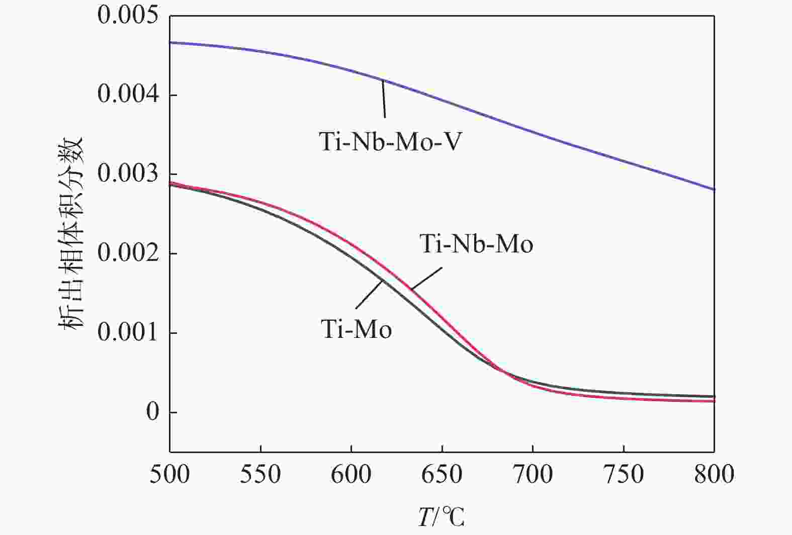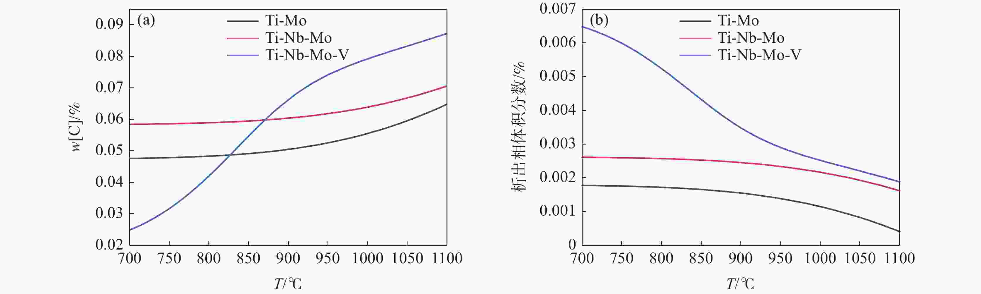 T/ ℃ Ti-Mo Ti-Nb-Mo Ti-Nb-Mo-V lg(I/K)d lg(t0.05 da/t0 da) lg(I/K)d lg(t0.05 da/t0 da) lg(I/K)d lg(t0.05 da/t0 da) 700 −15.90 22.41 −16.43 23.19 −16.08 23.13 750 −15.71 21.57 −16.17 22.25 −15.90 22.24 800 −15.74 21.00 −16.01 21.49 −15.95 21.65 850 −16.09 20.80 −16.00 20.93 −16.06 21.15 900 −17.03 21.25 −16.19 20.61 −16.03 20.57 950 −19.22 22.98 −16.70 20.66 −16.10 20.12 1000 −24.71 28.05 −17.74 21.28 −16.56 20.13 1050 −42.61 45.56 −19.83 22.98 −17.68 20.85 1100 −167.31 169.90 −24.29 27.09 −20.10 22.90 表 5 试验钢中碳化物在铁素体中均匀形核的计算结果