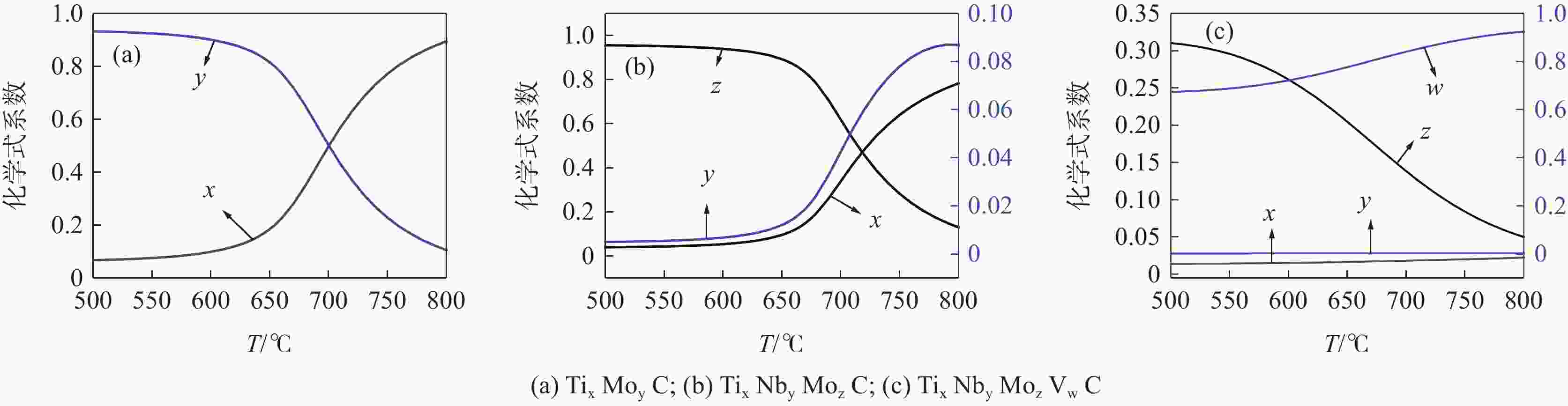 T/℃ Ti-Mo Ti-Nb-Mo Ti-Nb-Mo-V lg(I/K) lg(t0.05 a/t0 a) lg(I/K) lg(t0.05 a/t0 a) lg(I/K) lg(t0.05 a/t0 a) 500 −64.57 57.76 −43.81 44.65 −25.71 32.34 550 −87.03 71.80 −54.66 50.90 −25.51 31.24 600 −129.97 99.61 −83.74 69.41 −25.38 30.31 650 −156.16 116.42 −137.18 104.27 −25.20 29.46 700 −70.89 59.21 −70.52 59.20 −25.27 28.85 750 −53.80 47.46 −51.04 45.66 −26.36 28.99 800 −62.22 52.60 −62.15 52.53 −29.61 30.60 表 6 试验钢中碳化物在铁素体中位错线上形核的计算结果