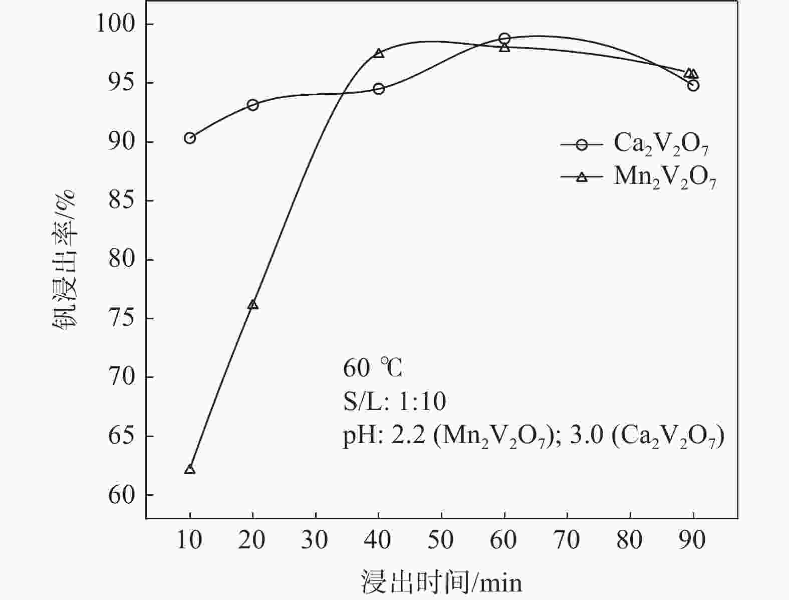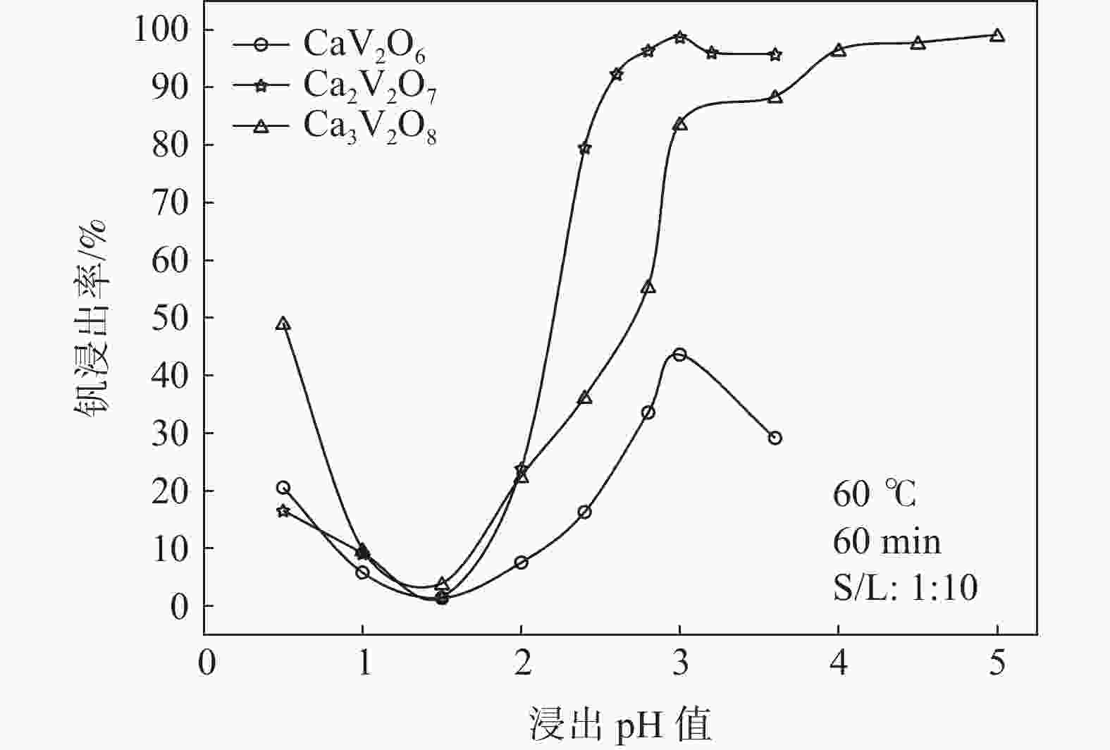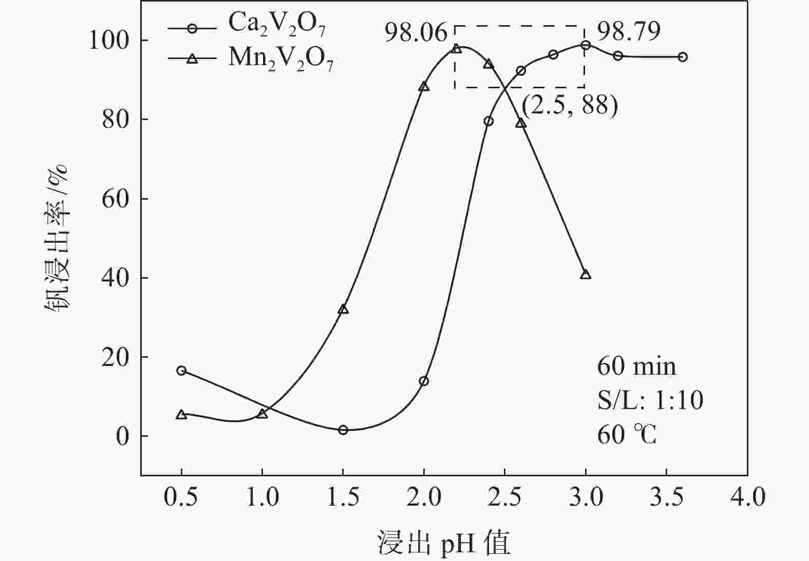摘要: 钒酸钙和钒酸锰是钒渣钙化焙烧过程中重要的焙烧产物,其在硫酸中的溶解浸出行为对提钒过程钒收率有重要影响。采用单因素试验递进式研究了浸出pH值、时间及温度对合成钒酸钙(锰)以及钒渣钙化(锰化)、钙锰复合焙烧熟料中钒组元浸出行为的影响。结果表明,合成CaV2O6、Ca2V2O7、Ca3V2O8及Mn2V2O7在pH值分别为3.0、3.0、5.0、2.2的硫酸溶液中于60 ℃下浸出60 min时,钒的浸出率达到最大值,分别为43.62%、98.79%、97.98%、98.06%。pH值为1.0~2.0时,四种钒酸盐钒的浸出率均出现一个低谷,这是由钒的水解引起的。钒渣常规钙化和锰化焙烧过程中主要生成Ca2V2O7和Mn2V2O7两种钒酸盐,浸出pH值为2.5时,钒的浸出率分别为85.24%、87.07%;钒渣钙锰复合焙烧过程中生成的焦钒酸钙、焦钒酸锰共生复盐,熟料于pH值为2.5的硫酸溶液中浸出后钒的浸出率最大为90.09%,较常规钙化、锰化体系钒的浸出率高约四个百分点,表明钙、锰协同提钒与单一添加剂提钒相比有一定的强化作用。Abstract: Calcium vanadate and manganese vanadate are important roasting products in the calcification roasting process of vanadium slag, and their dissolution and leaching behavior in sulfuric acid has an important effect on the vanadium yield in the vanadium extraction process. In this paper, the effects of leaching pH, time and temperature on the leaching behavior of vanadium components in the synthesis of calcium vanadate (or manganese vanadate), vanadium slag calcification (or reaction with manganese) and calcium-manganese composite roasting clinker were studied by single factor test step-by-step method. The results showed that the maximum leaching rate of vanadium was 43.62%, 98.79%, 97.98% and 98.06% when the synthetic CaV2O6, Ca2V2O7, Ca3V2O8 and Mn2V2O7 were leached at 60℃ for 60 min at pH 3.0, 3.0, 5.0 and 2.2, respectively. When the pH value is 1.0~2.0, the leaching rate of the four vanadates shows a low peak, which is caused by the hydrolysis of vanadium. Ca2V2O7 and Mn2V2O7 vanadate were mainly formed during the conventional calcification and manganese roasting of vanadium slag, and the leaching rates of vanadium were 85.24% and 87.07%, respectively, when the leaching pH value was 2.5. The leaching rate of vanadium after clinker leaching in sulfuric acid solution with pH value of 2.5 was 90.09%, which was about four percentage points higher than that of vanadium in conventional calcification and manganese systems, indicating that the synergistic extraction of vanadium from calcium and manganese had a certain strengthening effect on vanadium extraction with a single additive.