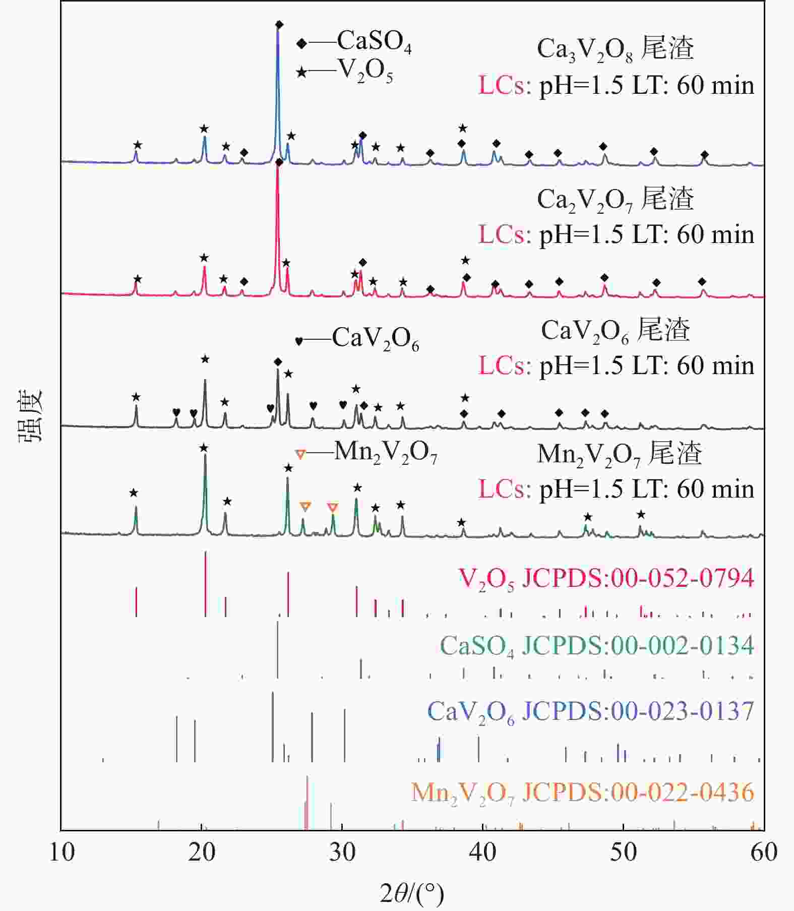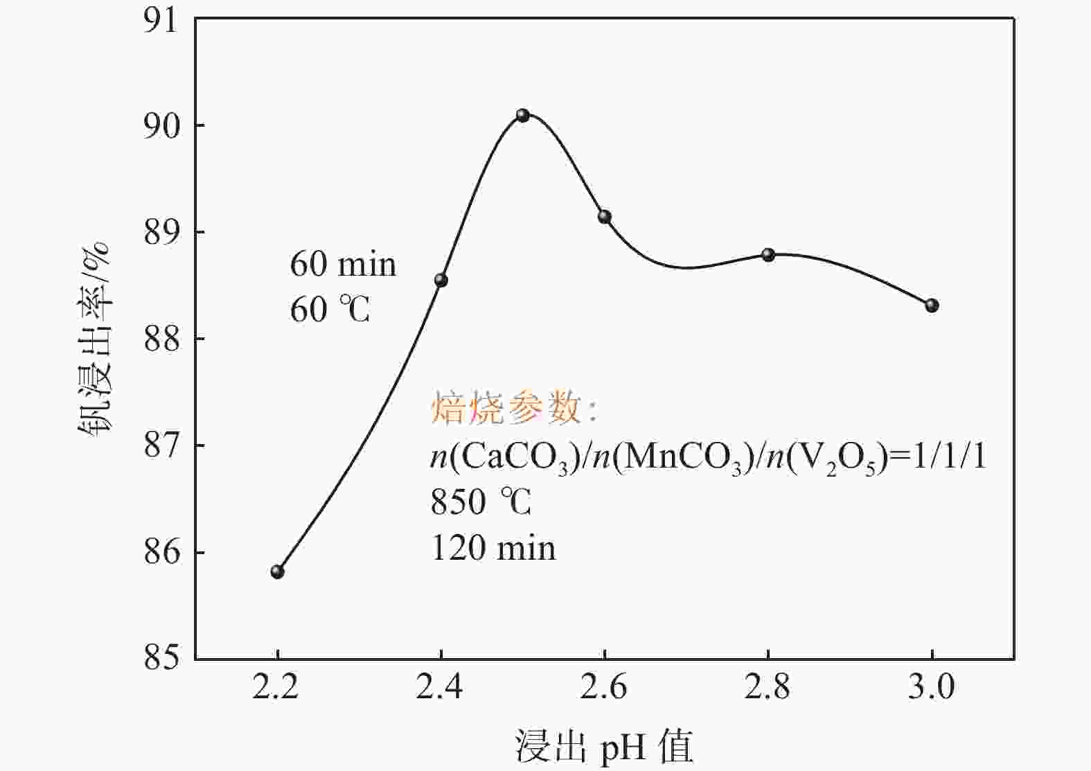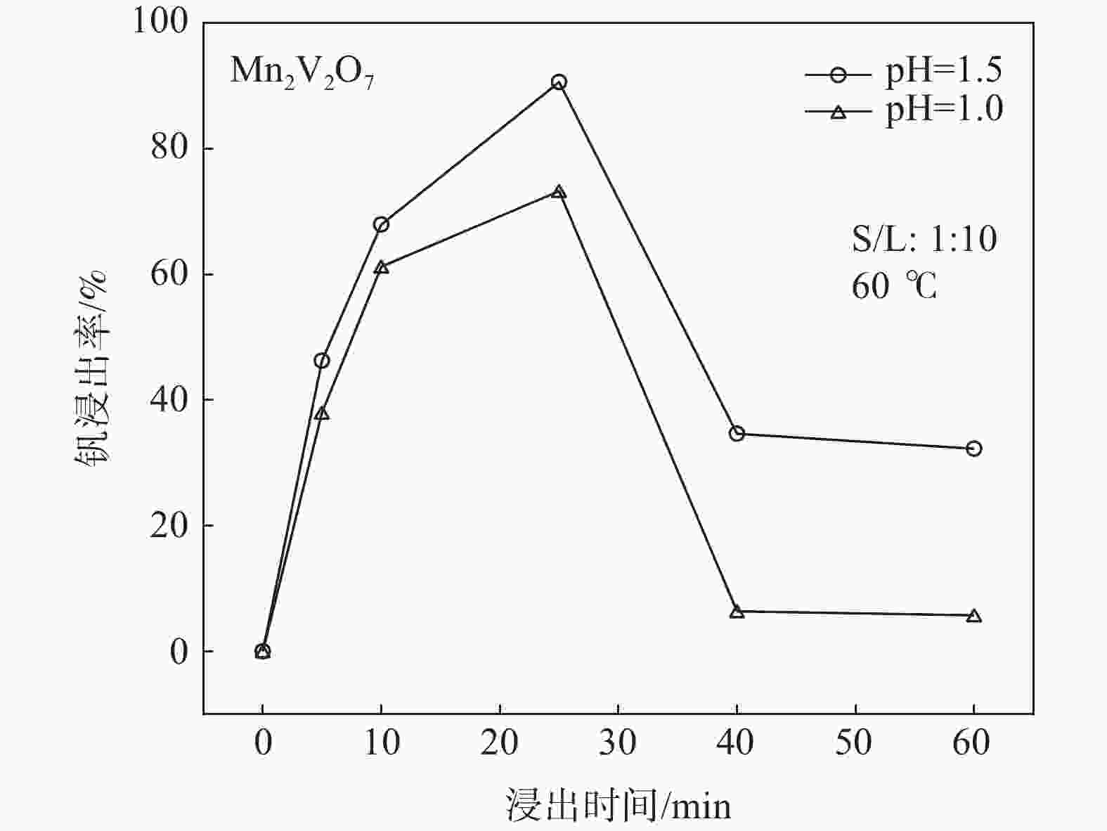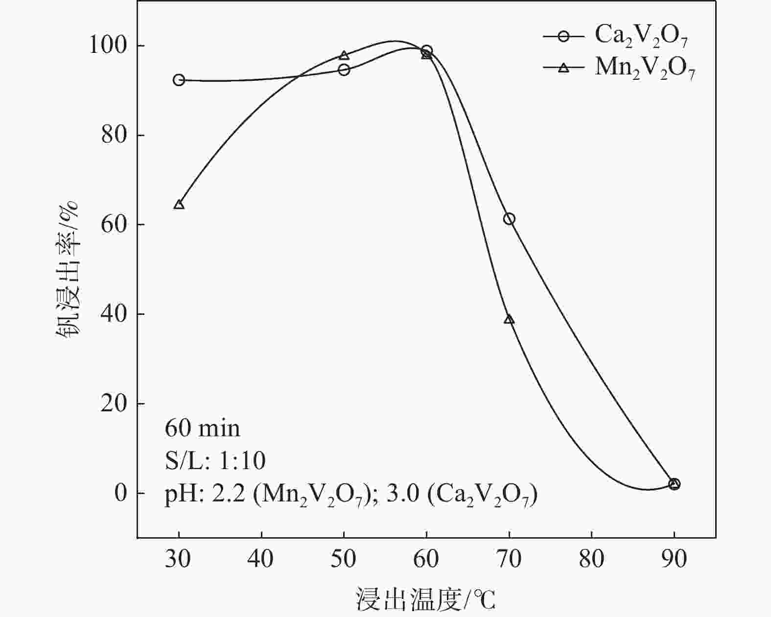摘要: 钒酸钙和钒酸锰是钒渣钙化焙烧过程中重要的焙烧产物,其在硫酸中的溶解浸出行为对提钒过程钒收率有重要影响。采用单因素试验递进式研究了浸出pH值、时间及温度对合成钒酸钙(锰)以及钒渣钙化(锰化)、钙锰复合焙烧熟料中钒组元浸出行为的影响。结果表明,合成CaV2O6、Ca2V2O7、Ca3V2O8及Mn2V2O7在pH值分别为3.0、3.0、5.0、2.2的硫酸溶液中于60 ℃下浸出60 min时,钒的浸出率达到最大值,分别为43.62%、98.79%、97.98%、98.06%。pH值为1.0~2.0时,四种钒酸盐钒的浸出率均出现一个低谷,这是由钒的水解引起的。钒渣常规钙化和锰化焙烧过程中主要生成Ca2V2O7和Mn2V2O7两种钒酸盐,浸出pH值为2.5时,钒的浸出率分别为85.24%、87.07%;钒渣钙锰复合焙烧过程中生成的焦钒酸钙、焦钒酸锰共生复盐,熟料于pH值为2.5的硫酸溶液中浸出后钒的浸出率最大为90.09%,较常规钙化、锰化体系钒的浸出率高约四个百分点,表明钙、锰协同提钒与单一添加剂提钒相比有一定的强化作用。Abstract: Calcium vanadate and manganese vanadate are important roasting products in the calcification roasting process of vanadium slag, and their dissolution and leaching behavior in sulfuric acid has an important effect on the vanadium yield in the vanadium extraction process. In this paper, the effects of leaching pH, time and temperature on the leaching behavior of vanadium components in the synthesis of calcium vanadate (or manganese vanadate), vanadium slag calcification (or reaction with manganese) and calcium-manganese composite roasting clinker were studied by single factor test step-by-step method. The results showed that the maximum leaching rate of vanadium was 43.62%, 98.79%, 97.98% and 98.06% when the synthetic CaV2O6, Ca2V2O7, Ca3V2O8 and Mn2V2O7 were leached at 60℃ for 60 min at pH 3.0, 3.0, 5.0 and 2.2, respectively. When the pH value is 1.0~2.0, the leaching rate of the four vanadates shows a low peak, which is caused by the hydrolysis of vanadium. Ca2V2O7 and Mn2V2O7 vanadate were mainly formed during the conventional calcification and manganese roasting of vanadium slag, and the leaching rates of vanadium were 85.24% and 87.07%, respectively, when the leaching pH value was 2.5. The leaching rate of vanadium after clinker leaching in sulfuric acid solution with pH value of 2.5 was 90.09%, which was about four percentage points higher than that of vanadium in conventional calcification and manganese systems, indicating that the synergistic extraction of vanadium from calcium and manganese had a certain strengthening effect on vanadium extraction with a single additive.