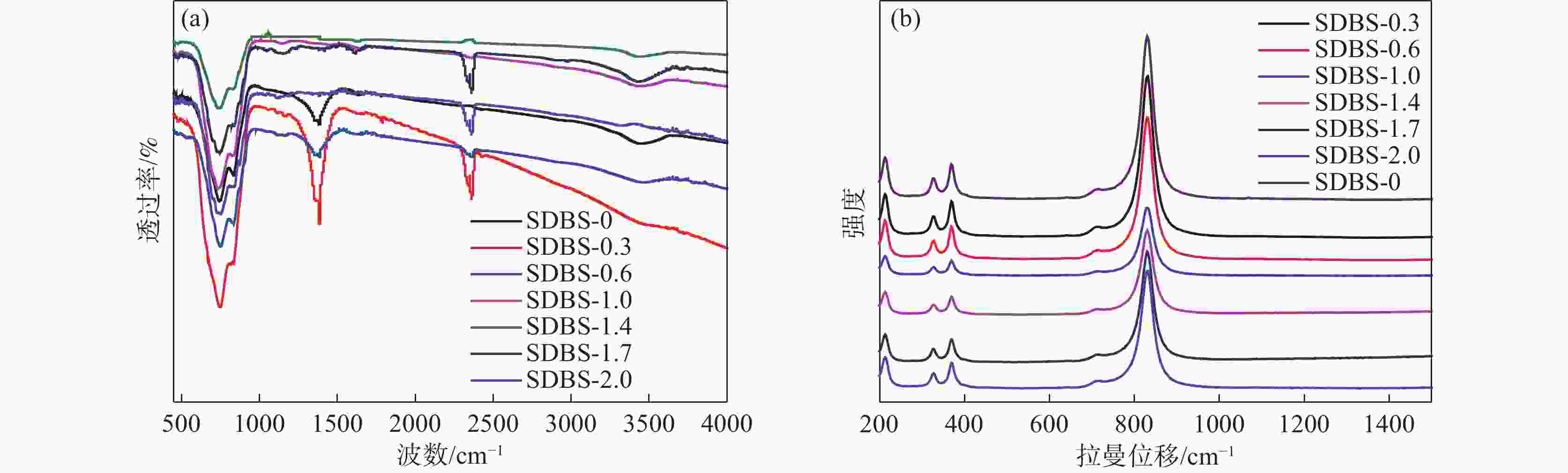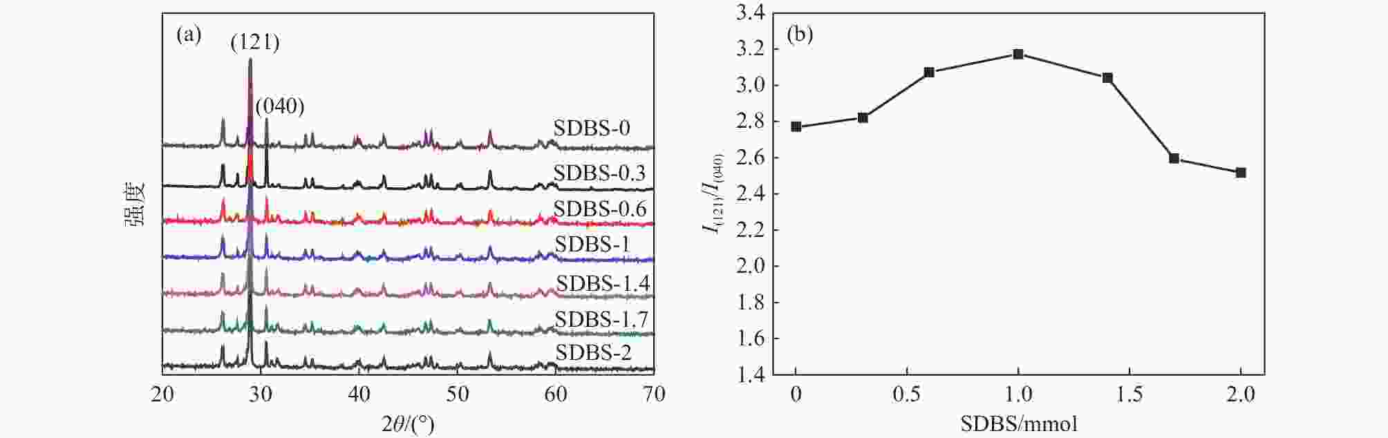 摘要: 以十二烷基苯磺酸钠(SDBS)作为结构导向剂,液相法制备钒酸铋黄色颜料纳米粉体,探究了SDBS对钒酸铋颜料形貌结构、物相以及色度值的影响。结果表明,SDBS可以在钒酸铋制备过程中促进钒酸铋(121)晶面的生长,同时,有效地降低钒酸铋颗粒尺寸,提高钒酸铋颗粒的分散稳定性,实现对钒酸铋色调的调控。SDBS添加量为1.0 mmol时,制备的钒酸铋为单斜晶系白钨矿结构,颗粒无明显团聚,平均尺寸为115.21 nm,且分布集中,89%的颗粒尺寸在50~150 nm。实现了钒酸铋由红色调黄到绿色调黄的转变,同时提高了钒酸铋的亮度L*。粉体色度参数L*=89.10,a*=−2.54,b*=71.82。Abstract: In this paper, sodium dodecylbenzene sulfonate (SDBS) was used as structure directing agent to prepare bismuth vanadate pigment nanopowder by liquid phase method.The influence of SDBS on the morphology, phase, and chromaticity value of bismuth vanadate was investigated.The results show that SDBS can promote the growth of bismuth vanadate 121 crystal plane during the preparation of bismuth vanadate. At the same time, it effectively reduces the particle size of bismuth vanadate, improves the dispersion stability of bismuth vanadate particles and achieves the regulation of the color tone of bismuth vanadate. When the amount of SDBS added is 1.0, the prepared bismuth vanadate has a monoclinic scheelite structure. The particles show no obvious agglomeration, with an average size of 115.21 nm and a concentrated distribution, with 89% of the particles ranging in the size from 50 to 150 nm. The transformation of bismuth vanadate from red to yellow to green was achieved, while the brightness L* of bismuth vanadate was improved, with a chromaticity value of L*=89.10, a*= −2.54 and b*=71.82.