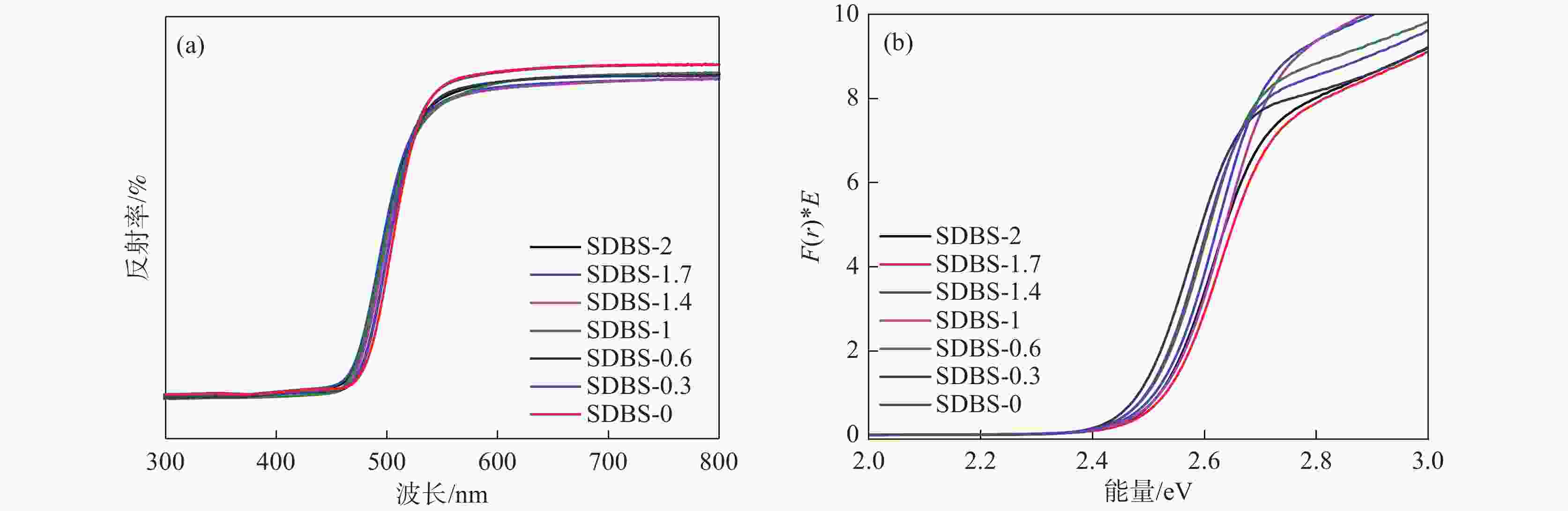 SDBS添加量/mmol L* a* b* 0 87.02 1.21 72.14 0.3 88.17 −0.24 70.05 0.6 88.80 −1.12 71.22 1.0 89.10 −2.54 71.82 1.4 88.53 −2.49 71.49 1.7 88.28 −2.46 69.08 2.0 87.26 −2.34 68.29 -