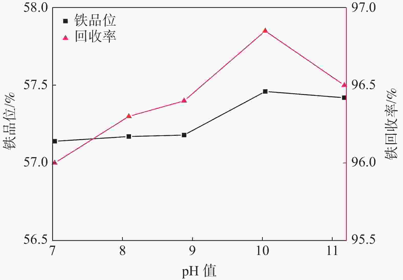 粒级/μm 产率/% TFe品位/% TFe分布率/% −74~+48 20.45 54.18 19.92 −48~+38 11.27 54.69 11.08 −38~+30 12.82 55.03 12.69 −30~+23 51.27 57.25 52.78 −23~+18 2.99 48.75 2.62 −18 1.20 41.83 0.91 合计 100.00 55.61 100.00 表 3 最终精矿筛析试验结果