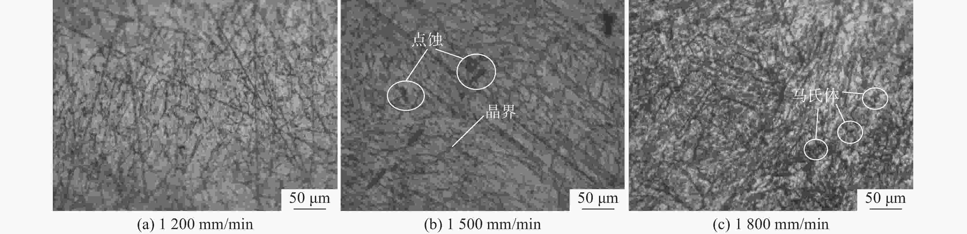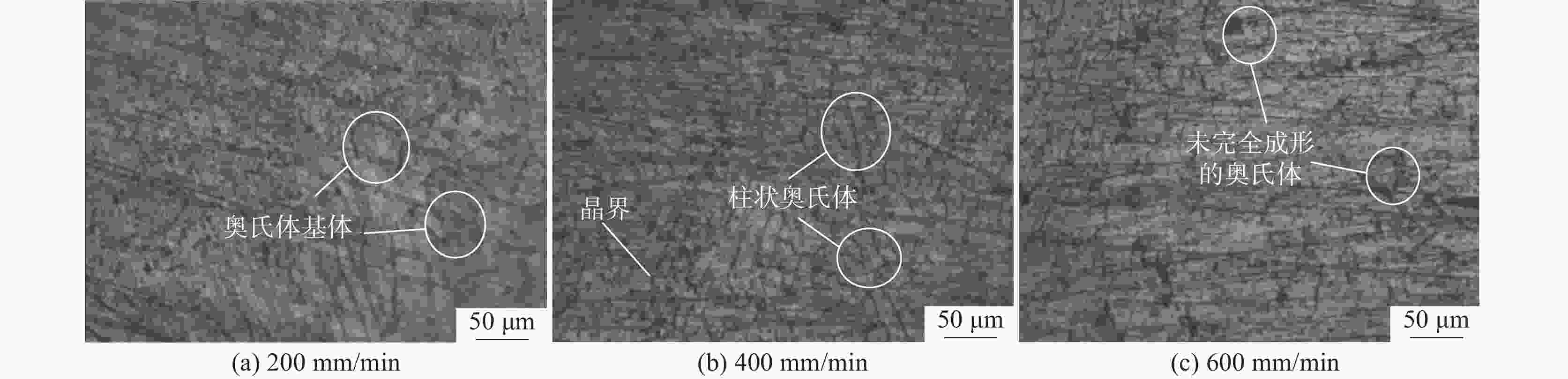 摘要: 采用直径为1 mm的304不锈钢丝材为材料,以电子束熔丝沉积技术(EBF3)制备304不锈钢试样,并进行力学性能及显微组织分析。设计了9组试验方案进行单因素试验,分别改变束流强度、送丝速度以及基板进给速度三个参数进行打印。结果表明,9组试件的抗拉强度和屈服强度均表现优异,但断后伸长率表现一般,其中当束流为26 mA、送丝速度为1400 mm/min、进给速度为400 mm/min时,试件各项特征表现最好,拉伸强度为1328.92 MPa,屈服强度为711.60 MPa,断后伸长率为34.45%。通过综合分析可知,改变送丝速度对试件的塑性影响最大,改变进给速度对试件的强度影响最大。此外,改变束流与进给速度的试件内部金相组织基体由奥氏体组成,改变送丝速度的试件显微组织则多为奥氏体转变和过程析出的组织为组成部分;改变束流和送丝速度的试件中以组织的构成变化为主,改变进给速度的试件中组织则以晶粒度的变化为主,最终形成了不同拉伸件性能间的差异。在进行扫描电镜断口分析中可以发现,试件在拉伸试验中均发生脆性断裂。Abstract: 304 stainless steel wire with a diameter of 1 mm was used as the material to prepare 304 stainless steel samples using electron beam fusion deposition technology (EBF3) for mechanical properties and microstructure analysis. Nine sets of experimental were designed for single factor experiments, where the beam intensity, wire feeding speed, and substrate feeding speed were changed for printing. The results showed that the tensile strength and yield strength of 9 groups of specimens were excellent, but their elongations were average. Among them, when the beam current was 26 mA, the wire feeding speed was 1400 mm/min, and the feed speed was 400 mm/min, the characteristics of the specimens were the best, with a maximum tensile strength of 1328.92 MPa, a maximum yield strength of 711.60 MPa, and a fracture elongation of 34.45%. Through the comprehensive analysis, it can be concluded that changing the wire feeding speed has the greatest impact on the plasticity of 304 stainless steel tensile parts, and changing the moving speed has the greatest impact on the strength of 304 stainless steel specimens. In addition, the microstructure of 304 stainless steel specimens with varying beam and feeding rates was composed of austenite. While, the microstructure of specimens with varying wire feeding rates was mostly composed of austenitic transformation phases precipitates; The changes in beam flow and wire feeding speed were mainly due to changes in the composition of the microstructure, while the changes in feed speed were mainly due to changes in grain size, ultimately resulting in the properties variation of different tensile parts. During the fracture analysis by scanning electron microscopy, it was found that brittle fracture occurred in all specimens during the tensile tests.