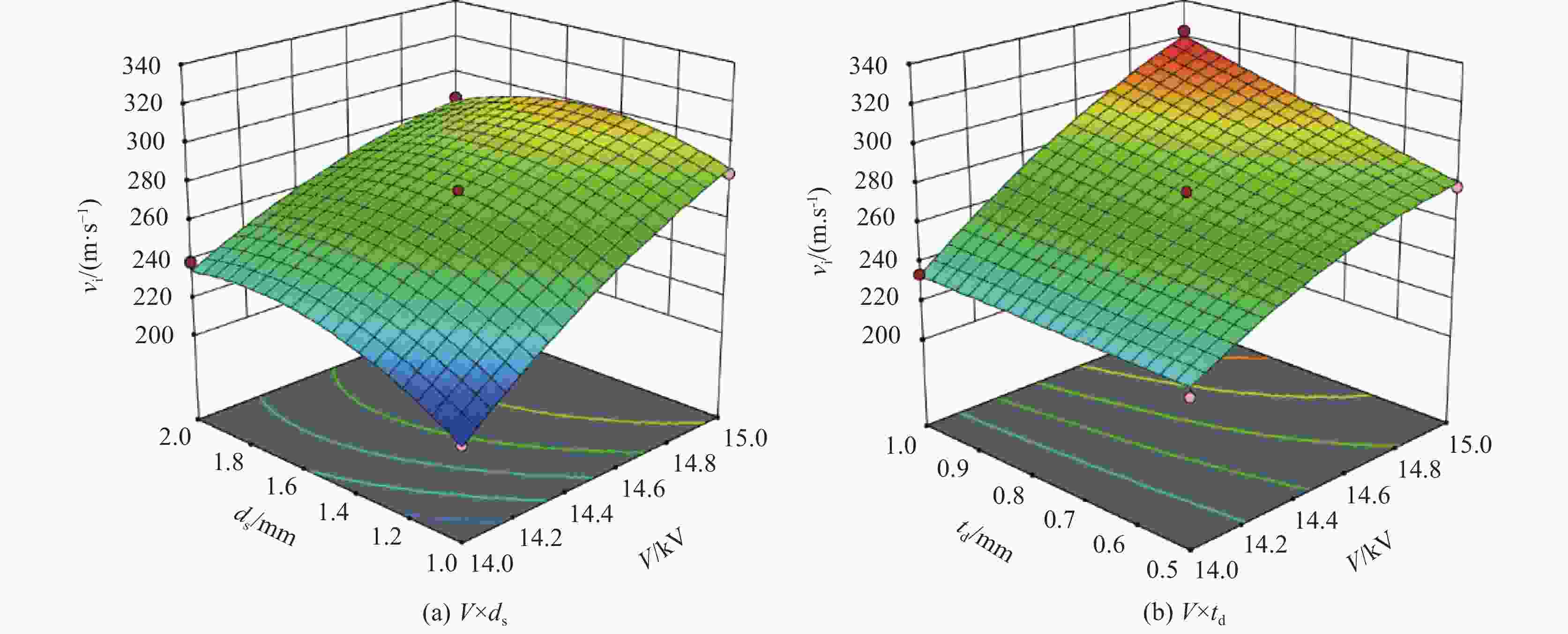试验序号 模式 V/kV ds/mm td/mm vi/(m·s−1) 1 0-- 14.5 1 0.5 245 2 000 14.5 1.5 0.75 276 3 +-0 15 1 0.75 284 4 ++0 15 2 0.75 286 5 -0+ 14 1.5 1 234 6 +0- 15 1.5 0.5 278 7 --0 14 1 0.75 201 8 +0+ 15 1.5 1 323 9 0++ 14.5 2 1 271 10 0-+ 14.5 1 1 262 11 -+0 14 2 0.75 239 12 000 14.5 1.5 0.75 276 13 0+- 14.5 2 0.5 257 14 000 14.5 1.5 0.75 276 15 -0- 14 1.5 0.5 227 表 4 二次模型ANOVA结果