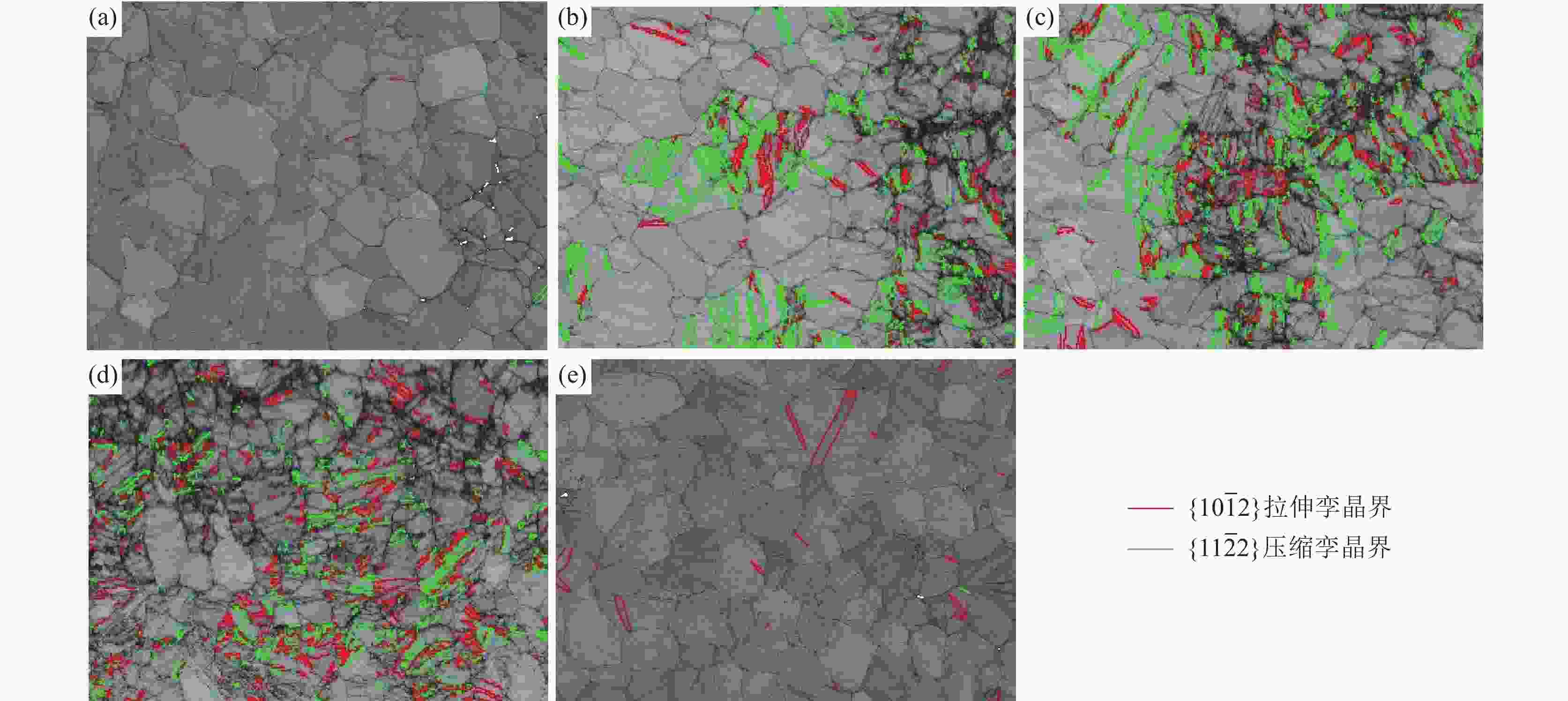 摘要: 采用十字形试样对工业纯钛板材进行了双轴拉伸试验,利用数字图像相关方法(Digital Image Correlation, DIC)捕获应变响应,探讨了双轴拉伸应力状态对力学性能的影响。与单轴力学性能相比,双轴加载下材料强度明显提升,当X、Y两轴加载速率相等时,材料的屈服强度及抗拉强度最高。进一步利用背向散射衍射技术(Electron Back Scatter Diffraction, EBSD)分析双轴载荷比对孪晶行为的影响。沿轧制方向(RD)和横向(TD)单向加载时,孪晶体积分数较小,而双轴载荷下有较多孪晶,在等比载荷时有最大的孪晶体积分数,且当横向载荷大于轧制方向载荷时,拉伸孪晶体积分数高于压缩孪晶体积分数。Abstract: In this study, biaxial tensile tests were conducted on the commercial pure titanium plates using cruciform specimens. The impact of biaxial tensile stress state on the mechanical properties was explored through Digital Image Correlation (DIC) to capture the strain response. The effect of biaxial tensile stress states on the mechanical properties of specimens was discussed. Compared to uniaxial mechanical properties, the biaxial loading material strength demonstrated a significant improvement. When the loading rates of X-axis and Y-axis are equal, the yield strength and tensile strength of the material reach the maximum. Electron Back Scatter Diffraction (EBSD) was further employed to analyze the influence of the biaxial load ratio on twinning behavior. Under uniaxial tension along the rolling direction (RD) or transverse direction (TD), the volume fraction of twins was found to be small, while there were more twins under biaxial loading and a maximum volume fraction of twins under equal load. Notably, when the load in the transverse direction exceeded that in the rolling direction, the volume fraction of tension twins surpassed that of compression twins.