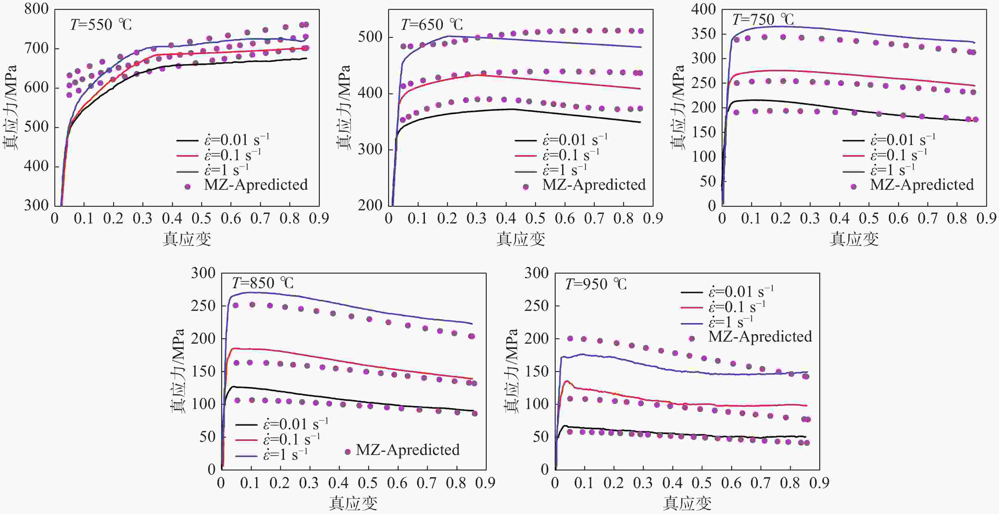3800 热模拟试验机,在不同温度(550 ~950 ℃)下、不同应变速率(0.01、0.1、1 s−1)下完成了等温压缩试验。依据试验数据,对改进的Z-A本构模型参数进行了标定,并对其有效性进行了分析。基于分析结果,建立了一种优化的Z-A本构模型,借助相关性系数R,平均相对误差值AARE和均方根误差RSME三种统计参数,探讨了该模型的可预测性。结果表明优化的Z-A本构模型能够准确地预测该材料的高温流变行为,其模型的R、AARE和RSME分别为0.9994 ,1.62%和1.3248 。Abstract: The constitutive model plays an important role in describing the response behavior of materials under different deformation conditions and in optimizing the hot forming process. Therefore, in order to obtain the physical constitutive model for accurately describing the high temperature rheological behavior of TC4 titanium alloy, the isothermal compression experiments were performed under different temperatures (500~900 ℃) and different strain rates (0.01, 0.1, 1 s−1) by using the Gleeble-3800 thermal simulator. According to the experimental data, the parameters of modified Z-A constitutive model are calibrated, and its effectivity is analyzed. Based on the analysis results, an optimized Z-A constitutive model was established, and the predictability of the model was discussed with the help of correlation coefficient R, mean absolute relative error value AARE and root mean square error RSME. The results indicate that the optimized Z-A constitutive model can accurately predict the high-temperature rheological behavior of the material. The R, AARE and RSME of the model are0.9992 , 1.63% and1.3252 , respectively. -