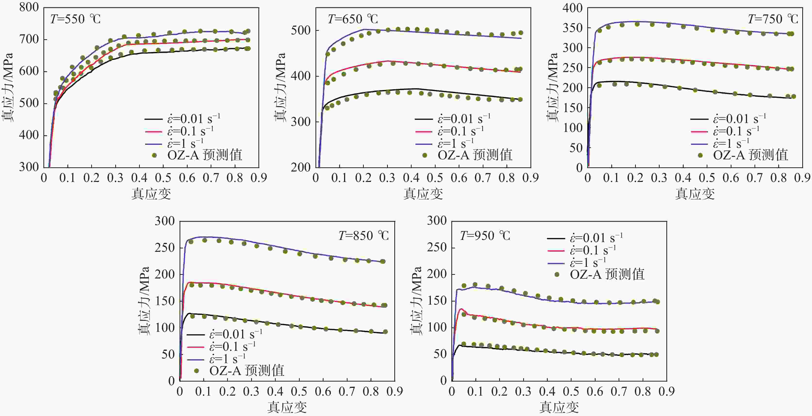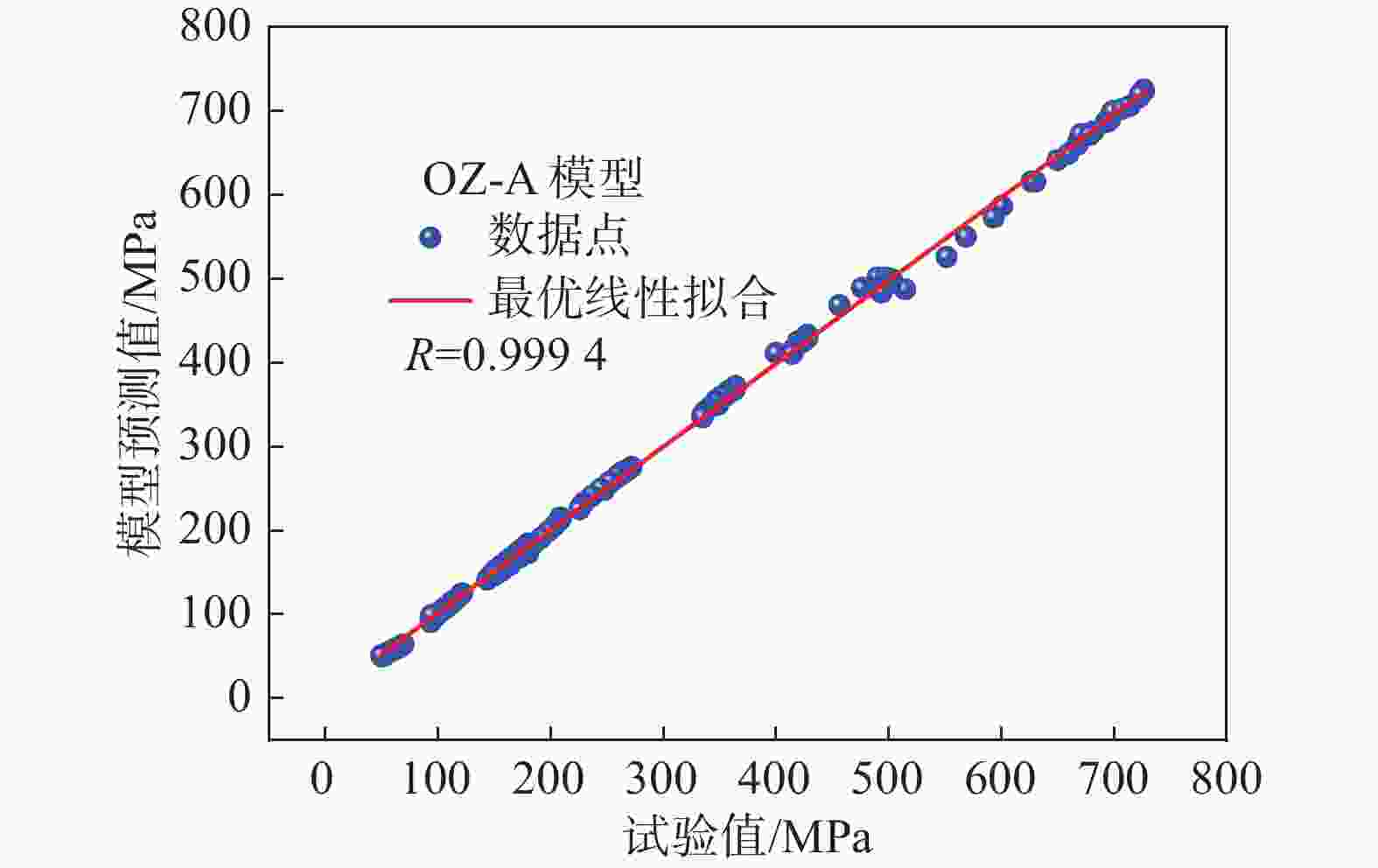 本构模型 相关性系数(R) 平均相对误差(AARE)/% 均方根误差(RMSE) OZ-A 0.9994 1.62 1.3248 -