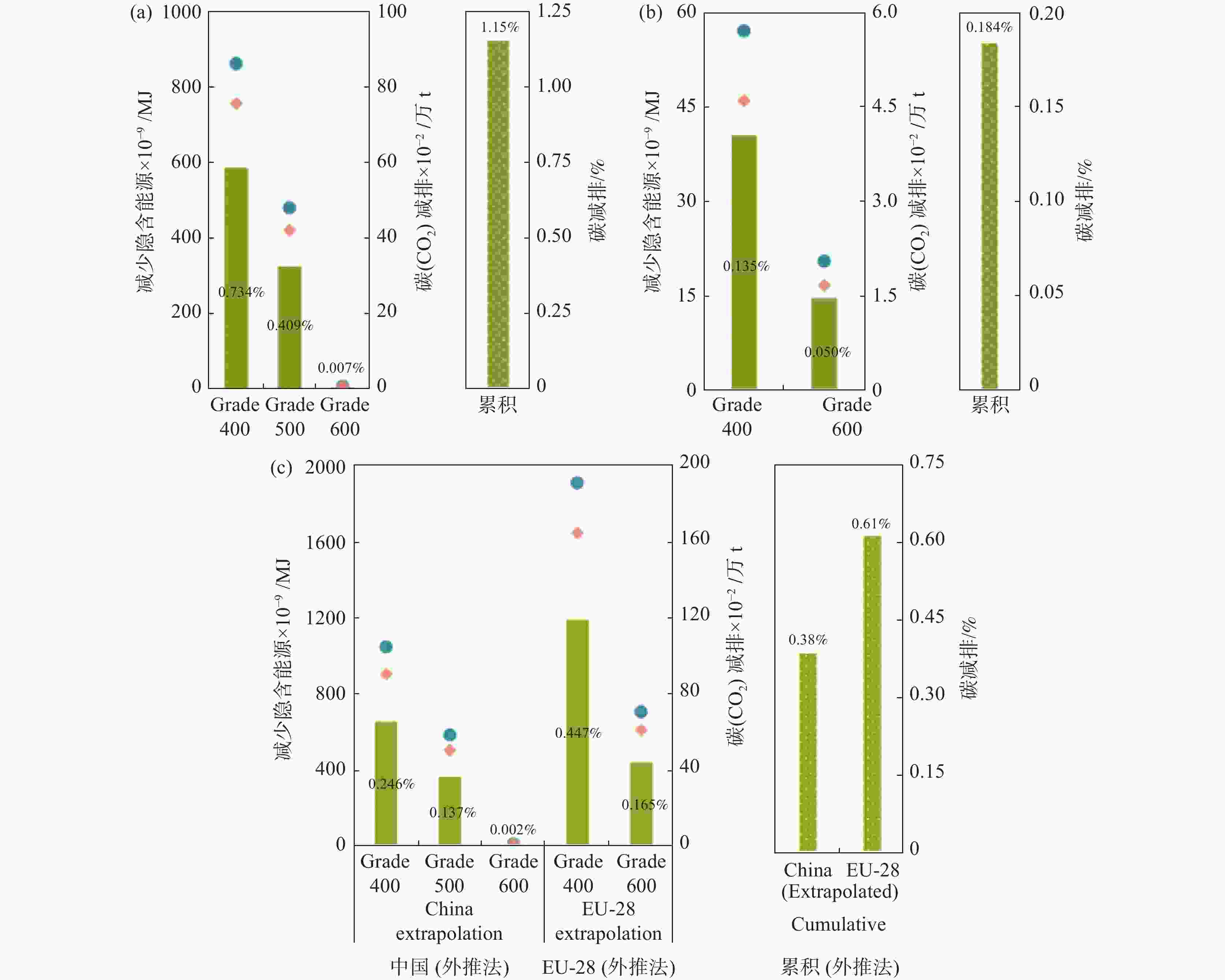 图中,减排量是使用2019年的数据计算的:(a)中国;(b)欧盟(EU-28);(c)全球(以中国和欧盟28国使用情景作为边界条件外推得到的数据)。节约的隐含能源(青色)和隐含碳(橙色)是采用螺纹钢市场的钒数据计算的,并通过已知地区的螺纹钢成分推算每个等级的钢产量和钒用量。对于全球情景分析,具体的隐含能源和隐含碳减排量是使用螺纹钢市场数据中的钒、中国和欧盟28国的数据以及每个等级占总钢比例加权钒量来计算的。以低碳钢(250 MPa)为参考,计算各等级钢的隐含能源和隐含碳的节约量。碳的减排百分比(黄绿色)是相对于各自的年度化石碳排放总量计算的