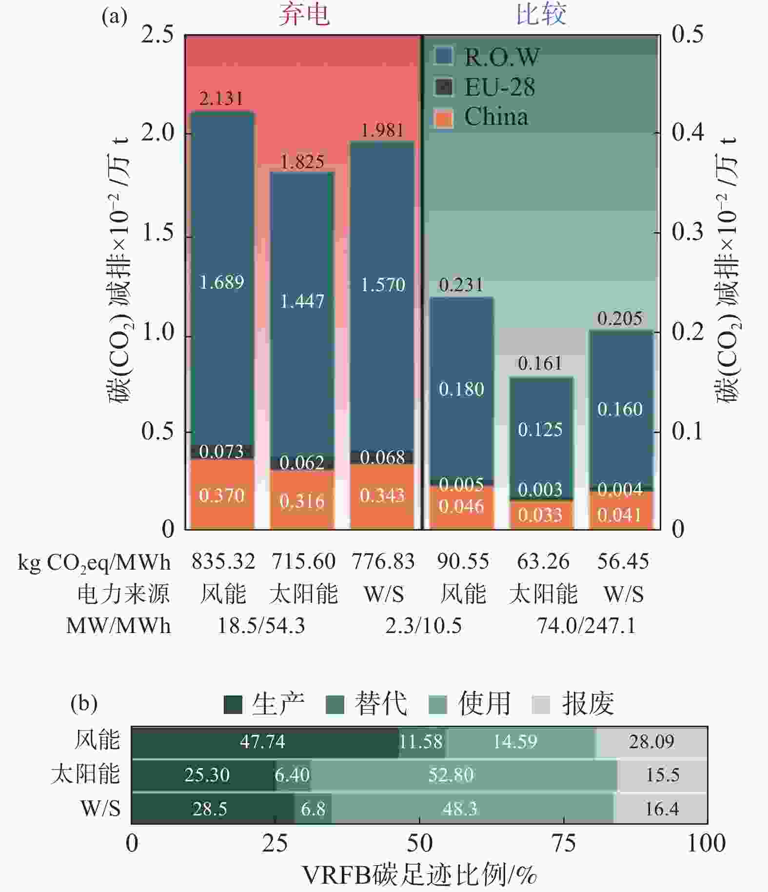 (a) 所有目前运行的VRFB在20年内针对可再生能源弃电(橙色)和比较评估(绿色)情景的减排量。中国(黄色)、欧盟28国(黑色)和R.O.W.(世界其余地区,深绿色)减排量被堆叠起来,以显示全球减排总量。柱状图下面插入的表格与上面的列相对应,并给出了以kgCO2eq/MWh (kgCO2当量/MWh)为单位的标准化减排量、电源(风能、太阳能或风能/太阳能混合(W/S))以及系统的额定功率和存储容量(根据其相应的柱色进行颜色匹配);(b) 每个生命周期阶段占VRFB总碳排放的比例