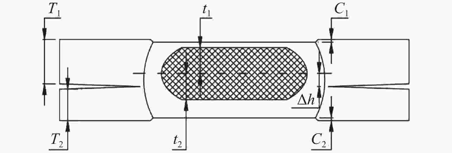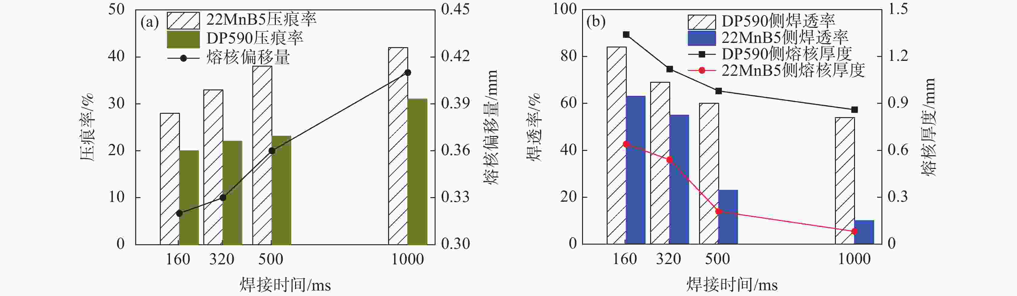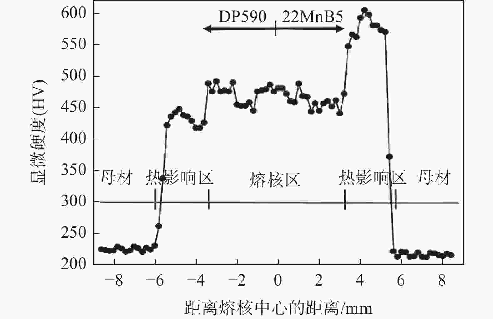 1000 ms时熔核直径减小,而拉剪力一直增加。点焊接头的显微硬度值由高到低分别为22MnB5侧热影响区→熔核区→DP590侧热影响区。在拉剪力作用下,接头拉伸断裂方式有界面断裂、部分界面断裂和熔核拔出断裂。并由此得出结论:在电极压力为3.8 kN的条件下,不等厚DP590/22MnB5的最佳点焊工艺为焊接电流为8.5 kA,焊接时间为160 ms。Abstract: In this paper, the single pulse resistance spot welding technology was used to study the section characteristics and tensile properties of 22MnB5/DP590 spot welding joints with varying thickness section under different welding current and welding time, and the variation of microhardness of spot welding joints was analyzed. The results show that the welding current has little effect on the penetration and core thickness of the base metal. With the increase of welding current, the weld core moves towards the thicker DP590 side, and both weld diameter and tensile shear of the joint increase. Compared with the welding current, prolonging welding time has significant effect on the indentation rate and core offset of the joint. With the increase of welding time, the penetration of the base metal and the thickness of the molten core decrease. The diameter of the molten core decreases when the welding time is1000 ms, but the tensile shear keeps increasing. The microhardness values of spot welded joints from high to low are as follows: 22MnB5 side heat affected zone → molten core zone →DP590 side heat affected zone. Under the action of tensile shear, the joint tensile fracture modes include interface fracture, partial interface fracture and core pulling out fracture. It is concluded that given 3.8 kN of welding force the optimum welding conditions for varying section of DP590/22MnB5 are 8.5 kA of welding current and 160 ms of welding time.-