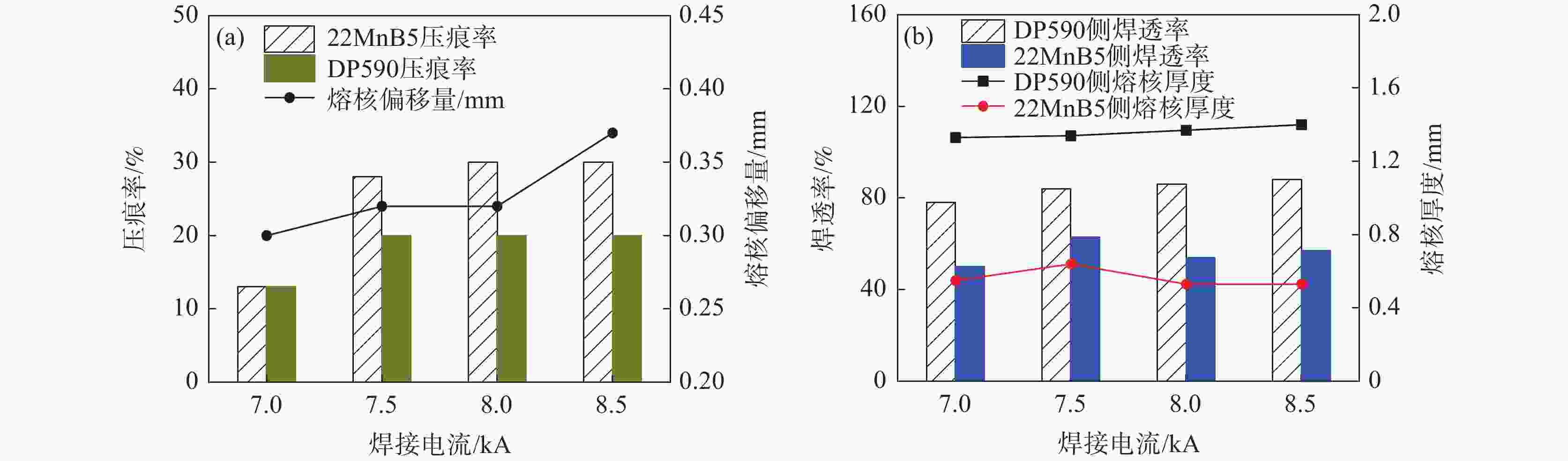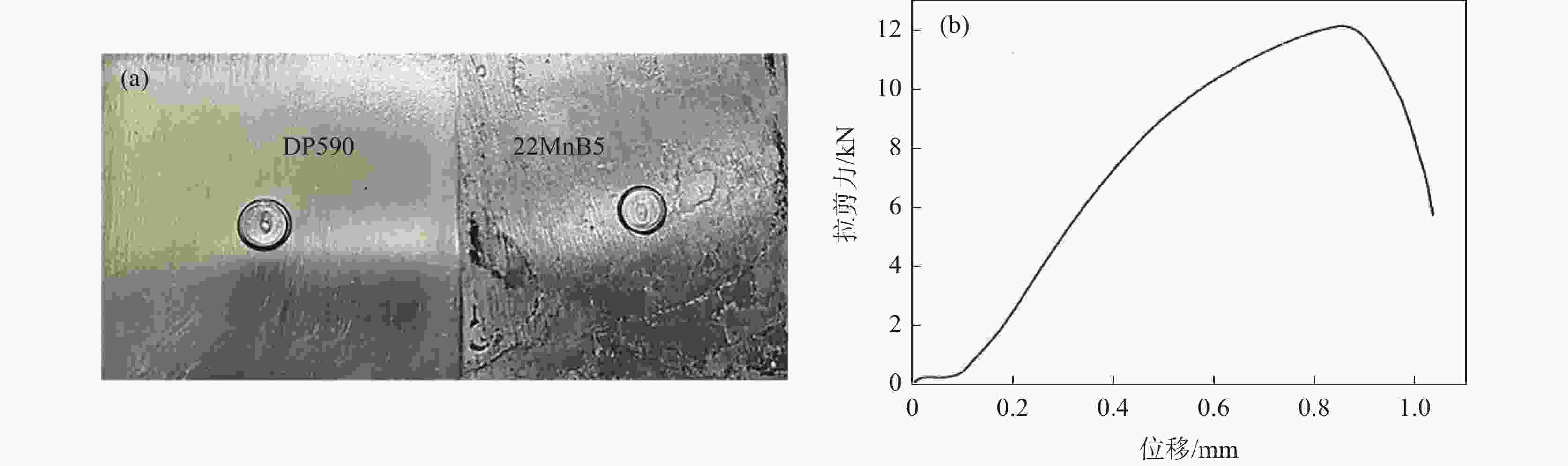 % 材料 C Si Mn P S Cr B Al Ti N Fe DP590 0.06 0.31 1.23 0.02 0.004 0.55 0.029 Bal. 22MnB5 0.22 0.23 1.2 0.013 0.001 0.2 0.0027 0.04 0.028 0.004 Bal. 表 2 单脉冲点焊工艺参数