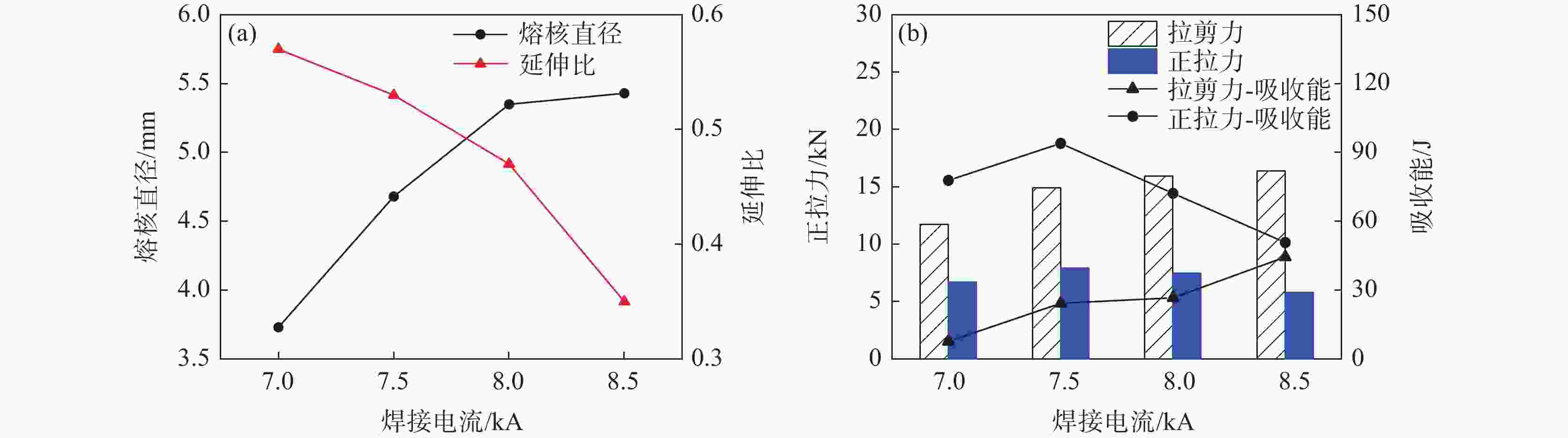 编号 焊接时间/ms 焊接电流/kA 电极压力/kN 保持时间/ms 1 160 7 3.8 400 2 160 7.5 3.8 400 3 160 8 3.8 400 4 160 8.5 3.8 400 5 320 7.5 3.8 400 6 500 7.5 3.8 400 7 1000 7.5 3.8 400 -
