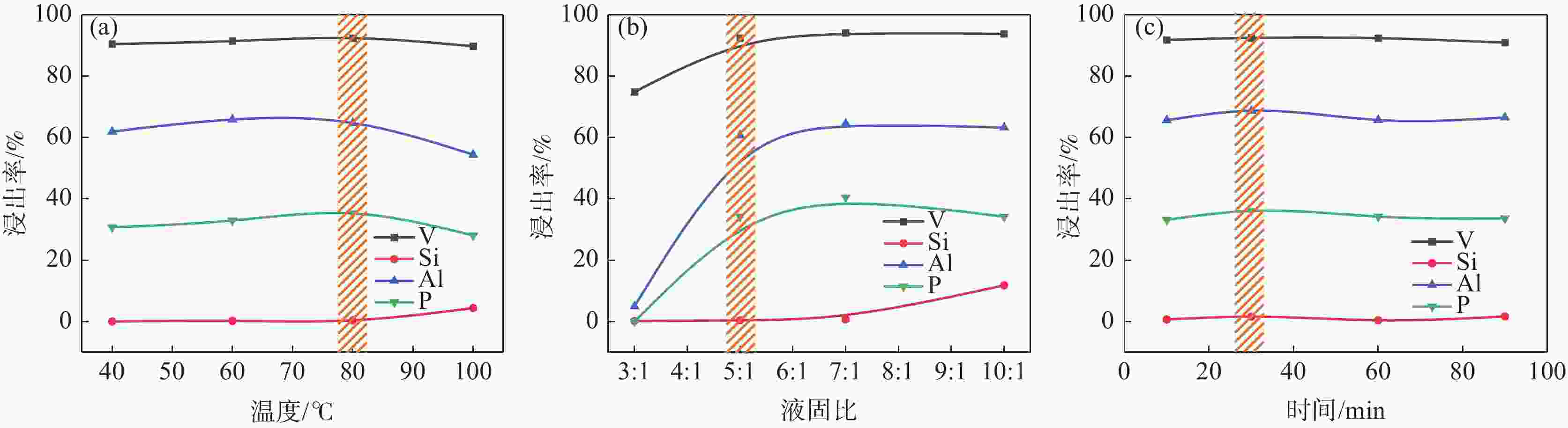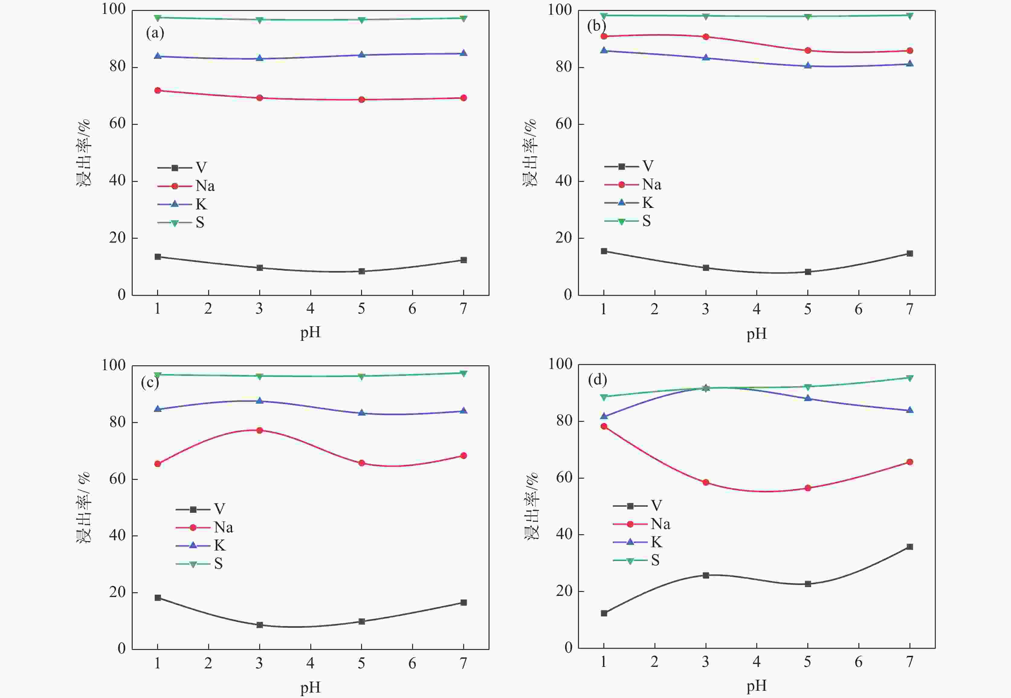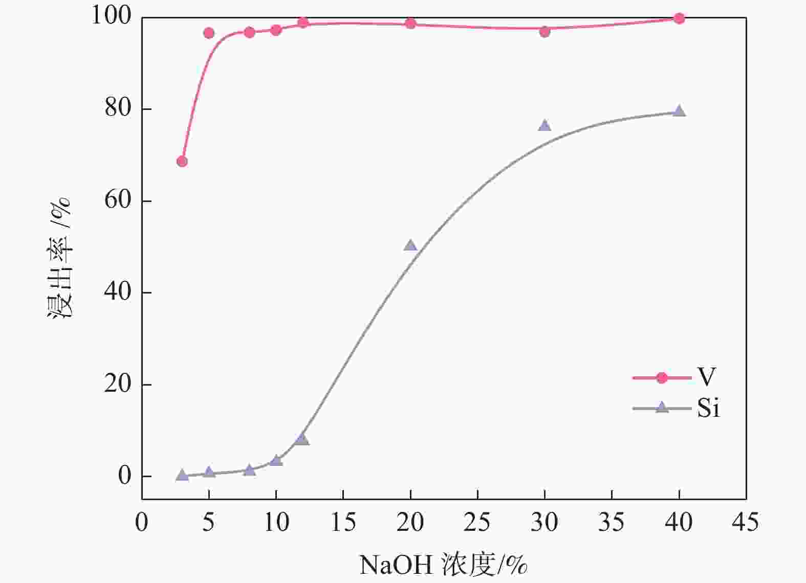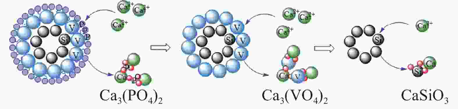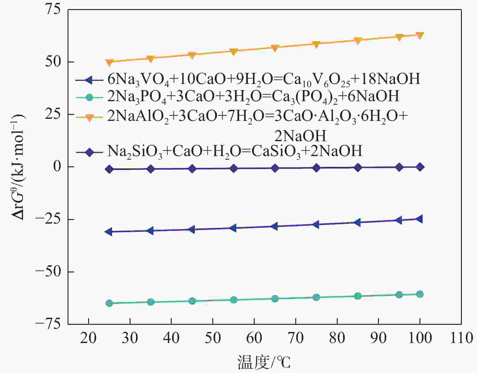 温度/℃ pH 含量/(g·L−1) Na2O SiO2 V2O5 K2O MgO CaO TiO2 Fe2O3 Al2O3 P2O5 S 40 3 11.56 <检测下限 0.70 22.00 0.50 0.42 <检测下限 0.31 1.92 0.07 17.03 5 13.60 <检测下限 0.17 23.41 0.49 0.42 <检测下限 0.02 1.85 0.03 17.11 60 3 8.50 <检测下限 0.10 19.80 0.38 0.30 <检测下限 0.32 1.39 <检测下限 13.85 5 8.54 <检测下限 0.24 19.25 0.36 0.30 <检测下限 <检测下限 1.05 0.02 13.55 表 3 NaOH浸液钙化铵化成分变化