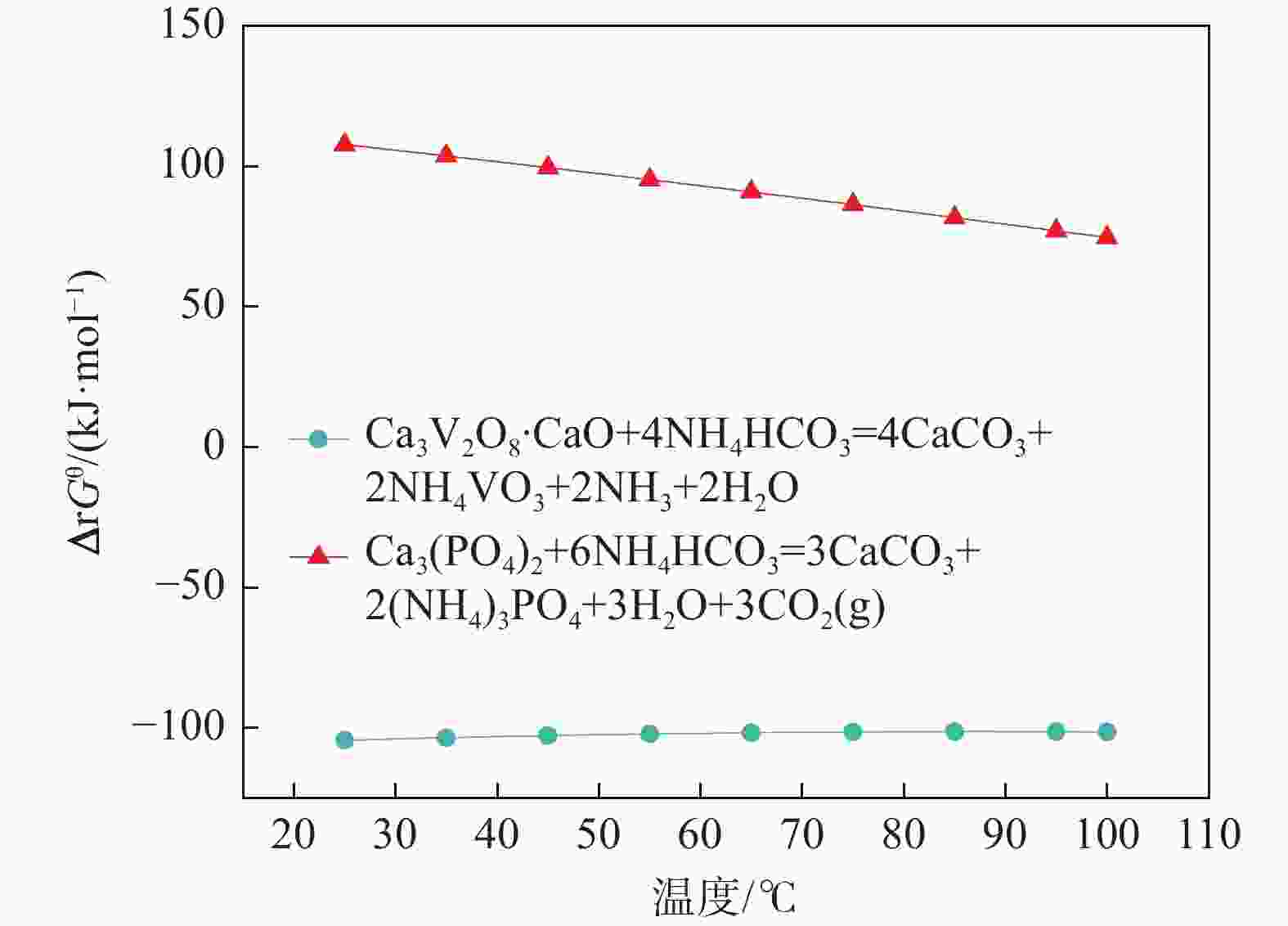 成分 含量/(g·L−1) 含量/% NaOH浸出液 钙化后碱液 铵化后液 钒酸钙 碳酸钙 Na2O 34.95 34.82 0.02 SiO2 0.39 0.32 0.06 0.17 0.99 Al2O3 0.58 0.55 P2O5 3.11 0.28 0.18 8.34 6.85 V2O5 16.22 0.52 29.45 40.38 1.55 -