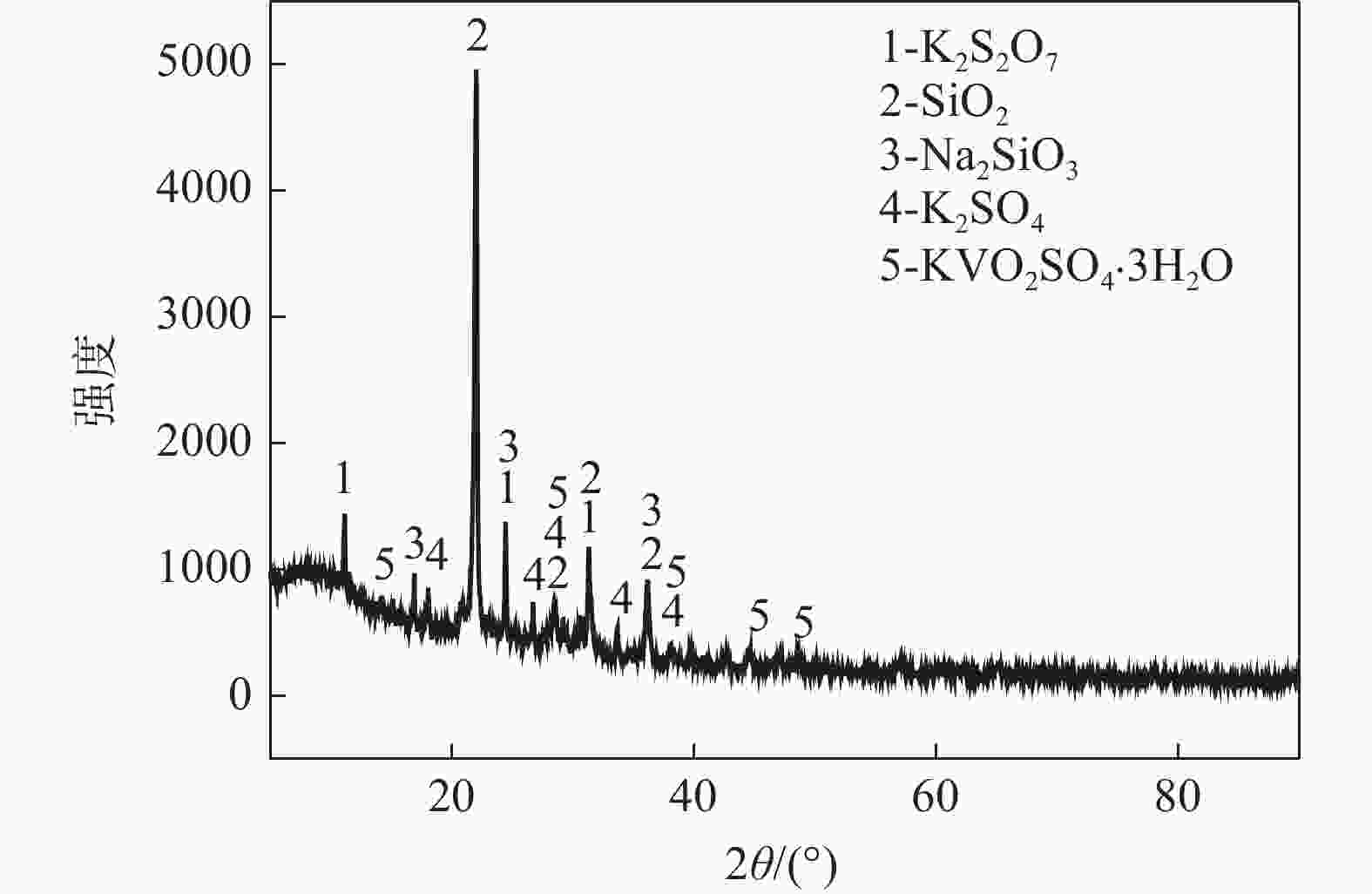 % Na2O SiO2 V2O5 K2O MgO CaO TiO2 Fe2O3 Al2O3 P2O5 As2O5 SO3 5.31 53.04 5.23 11.73 0.17 0.20 0.10 1.21 1.62 1.45 0.02 19.92 表 2 最佳水洗条件下失活硫酸催化剂水洗液成分