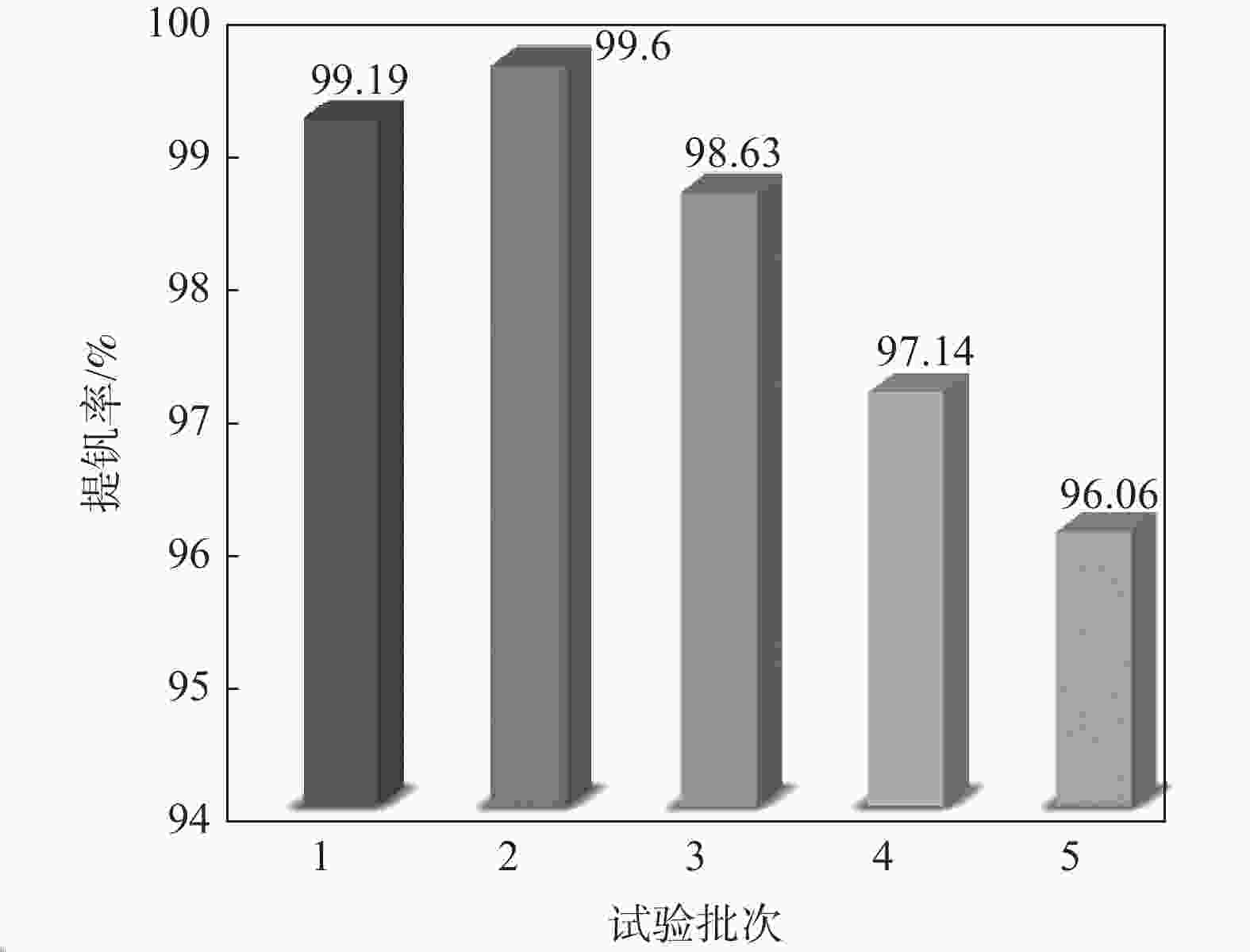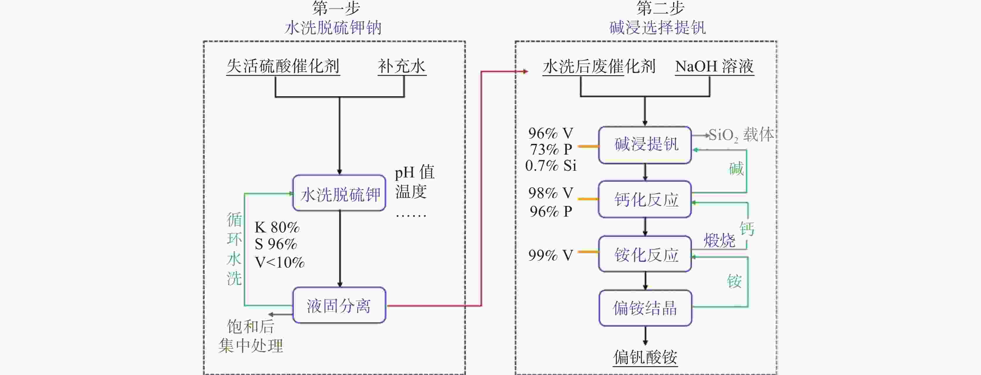 摘要: 针对失活硫酸催化剂直接酸浸、碱浸工艺选择性差,后续分离代价高、介质难回用的问题,使用两步法选择性提钒新工艺,利用钾、硫的强水溶性特点,研究了水洗温度、pH值对钾、硫浸出的影响,发现在温度40~60 ℃、pH值3~5水洗条件下,钾、硫的浸出率分别达到80%、96%以上,而钒的损失率控制在10%以内,实现了钒与钾、硫的选择性分离;第二步利用钒、硅在碱介质中的溶出特性,研究了碱浸温度、时间、液固比及碱液浓度对提钒效果的影响,发现采用5% NaOH溶液在80 ℃、L/S=5条件下反应30 min可实现失活硫酸催化剂中钒95%以上的浸出,而硅基本不浸出,实现了钒、硅的选择性分离。含钒浸出液可经钙化-铵化工艺制备得到偏钒酸铵产品,NaOH介质返回提钒阶段循环使用,介质封闭。Abstract: Based on the limited selectivity exhibited by current direct acid leaching and alkaline leaching processes for deactivated sulfuric acid catalysts, resulting in costly subsequent separation and challenging medium reuse, a new two-step process for selective extraction of vanadium was adopted. Using the strong water solubility of potassium and sulfur, the influence of washing temperature and pH value on leaching of potassium and sulfur was studied. It was found that potassium and sulfur can be removed more than 80% and 96% respectively by water washing under the condition of temperature 40~60℃ and pH 3~5, while the loss rate of vanadium was controlled within 10%. Thus, the selective separation of vanadium from potassium and sulfur was realized. In the second step, based on the leaching characteristics of vanadium and silicon in an alkali medium, the effects of leaching temperature, time, liquid-solid ratio and alkali concentration on vanadium extraction were studied. It was found that after reaction with 5% NaOH solution at 80 ℃ and L/S = 5 for 30 min, more than 95% vanadium was deactivated from the sulfuric acid catalyst, while the silicon leaching rate kept almost zero. The vanadium-containing leaching solution can be handled by calcification and ammonium process to obtain ammonium metavanadate products. The NaOH solution can be recycled to vanadium extraction step and wastewater zero emission was achieved.