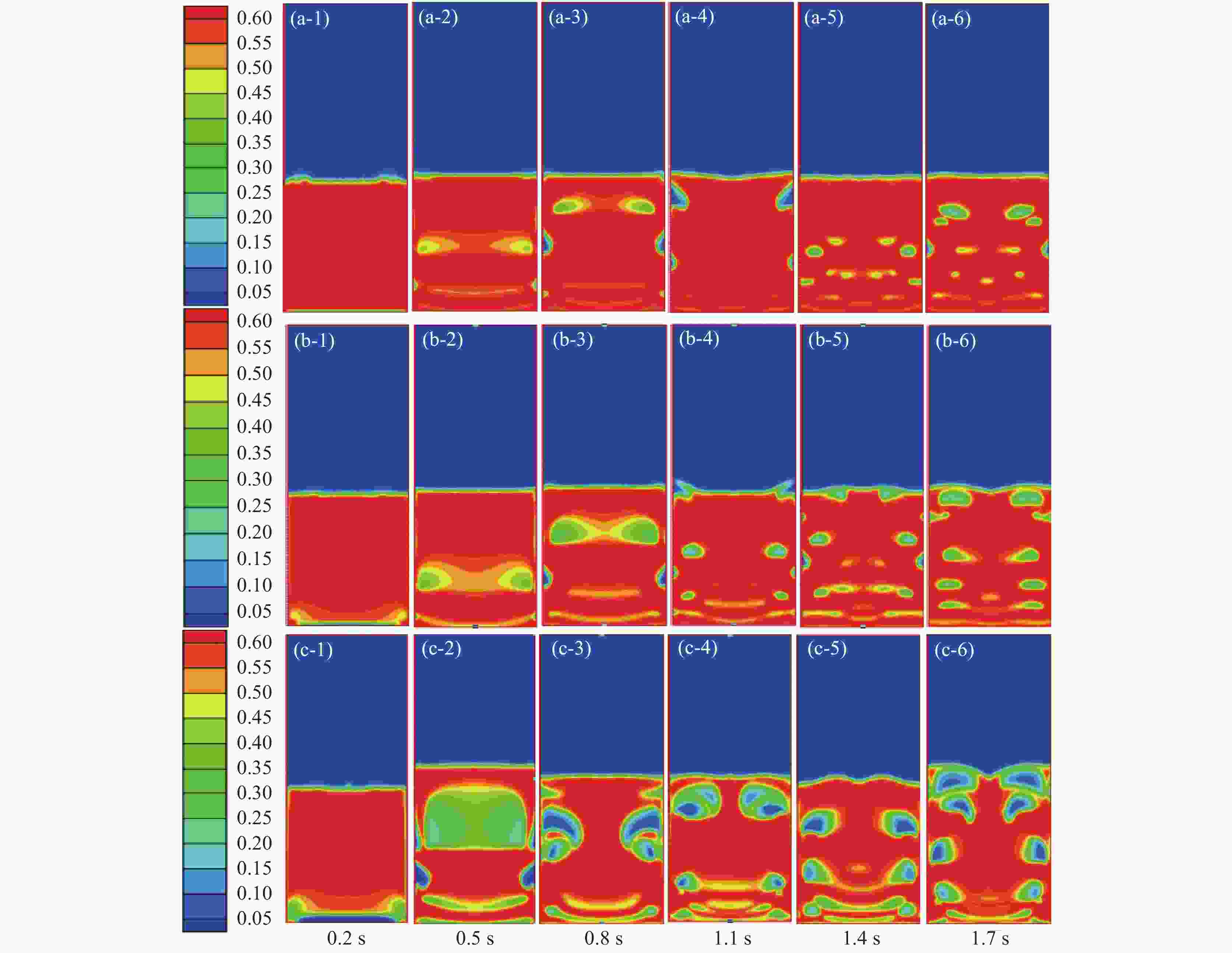 (a-1)~(a-6):初始流化速度为0.288 m/s (Ergun公式);(b-1)~(b-6):初始流化速度为0.319 m/s (Wen-Yu公式);(c-1)~(c-6):初始流化速度为0.425 m/s (Grace公式)
