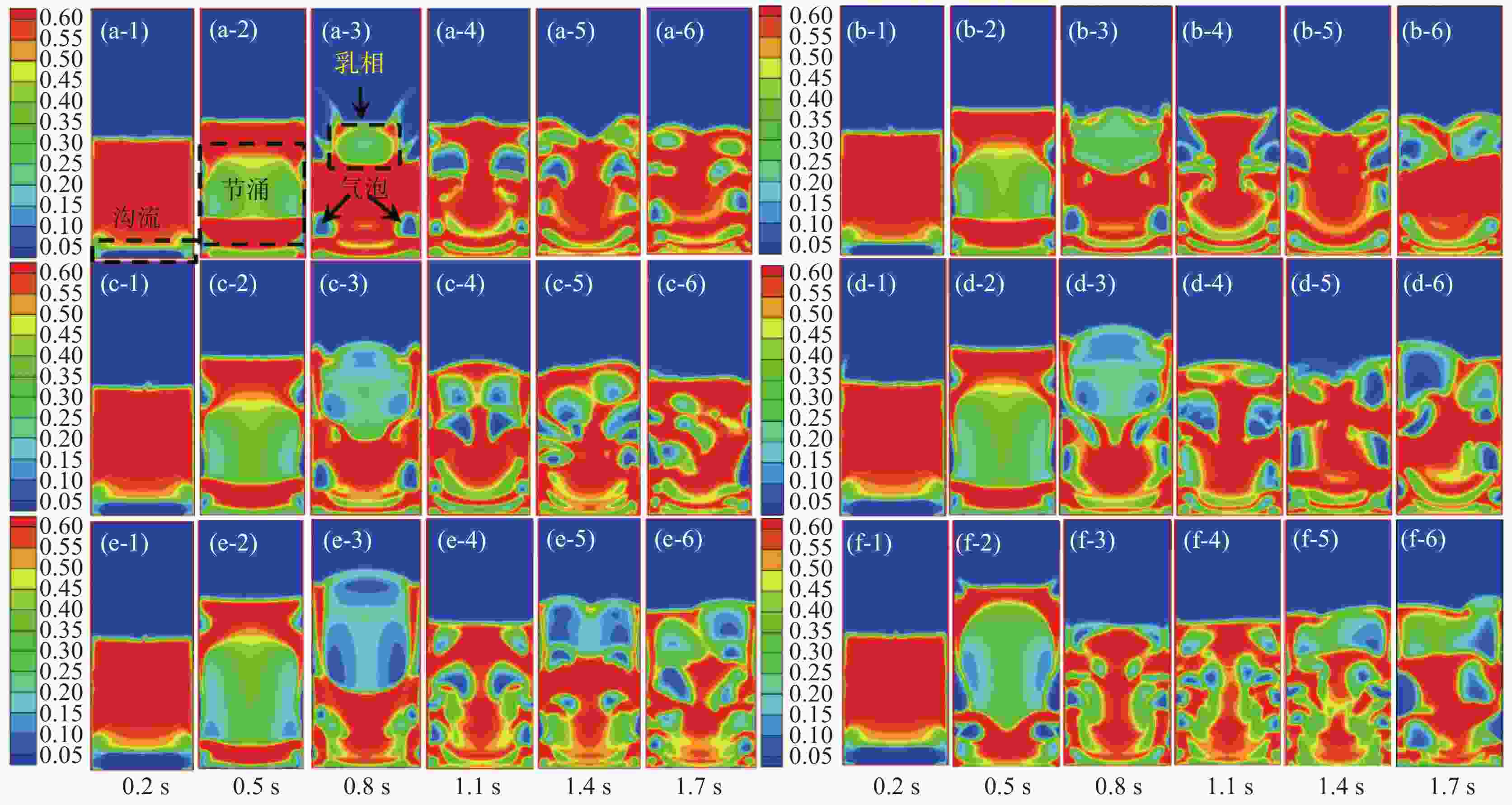 (a-1)~(a-6): 1.1倍初始流化速度(0.4675 m/s);(b-1)~(b-6): 1.2倍初始流化速度(0.51 m/s);(c-1)~(c-6): 1.3倍初始流化速度(0.5525 m/s);(d-1)~(d-6): 1.4倍初始流化速度(0.595 m/s);(e-1)~(e-6): 1.5倍初始流化速度(0.6375 m/s);(f-1)~(f-6): 1.1倍初始流化速度(0.68 m/s)