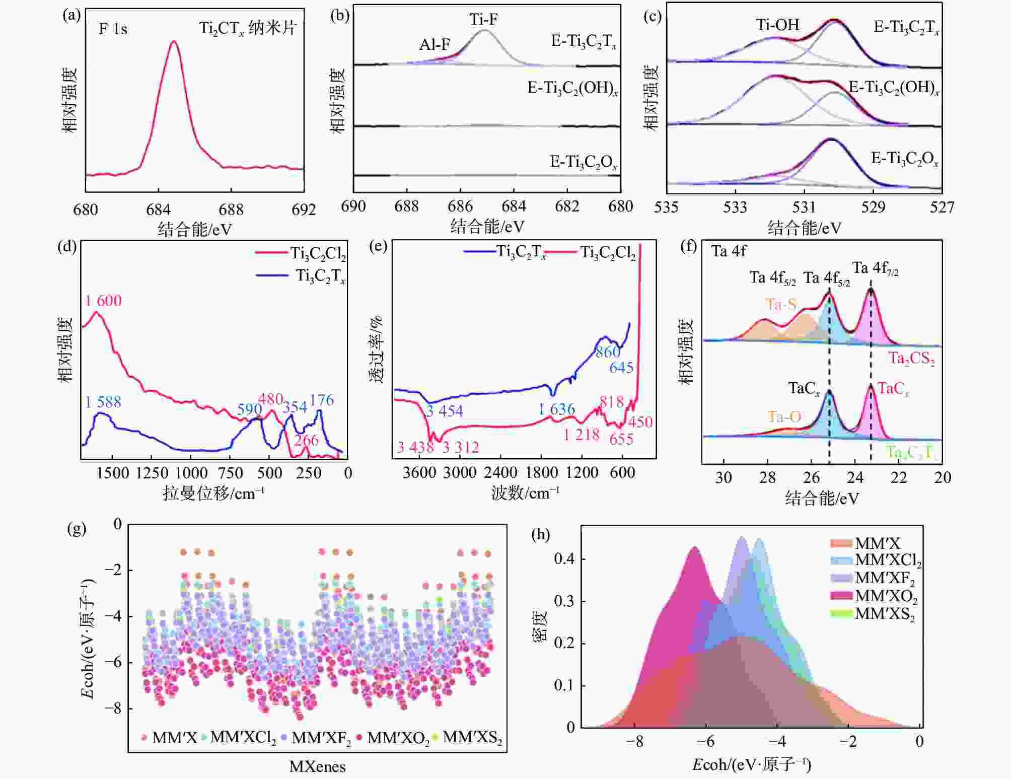 (a) Ti3C2Tx纳米片F 1s的XPS光谱[34]; Ti3C2Tx、Ti3C2(OH)x与Ti3C2Ox的XPS光谱:(b)F 1s与(c) O 1s[35];Ti3C2Cl2与Ti3C2Tx的(d)拉曼光谱与(e)傅里叶红外光谱[37]; (f) Ta2CS2与Ta4C3Tx在Ta 4f的XPS光谱[39];(g)不同官能团的归一化结合能与(h)相应的分布[40]