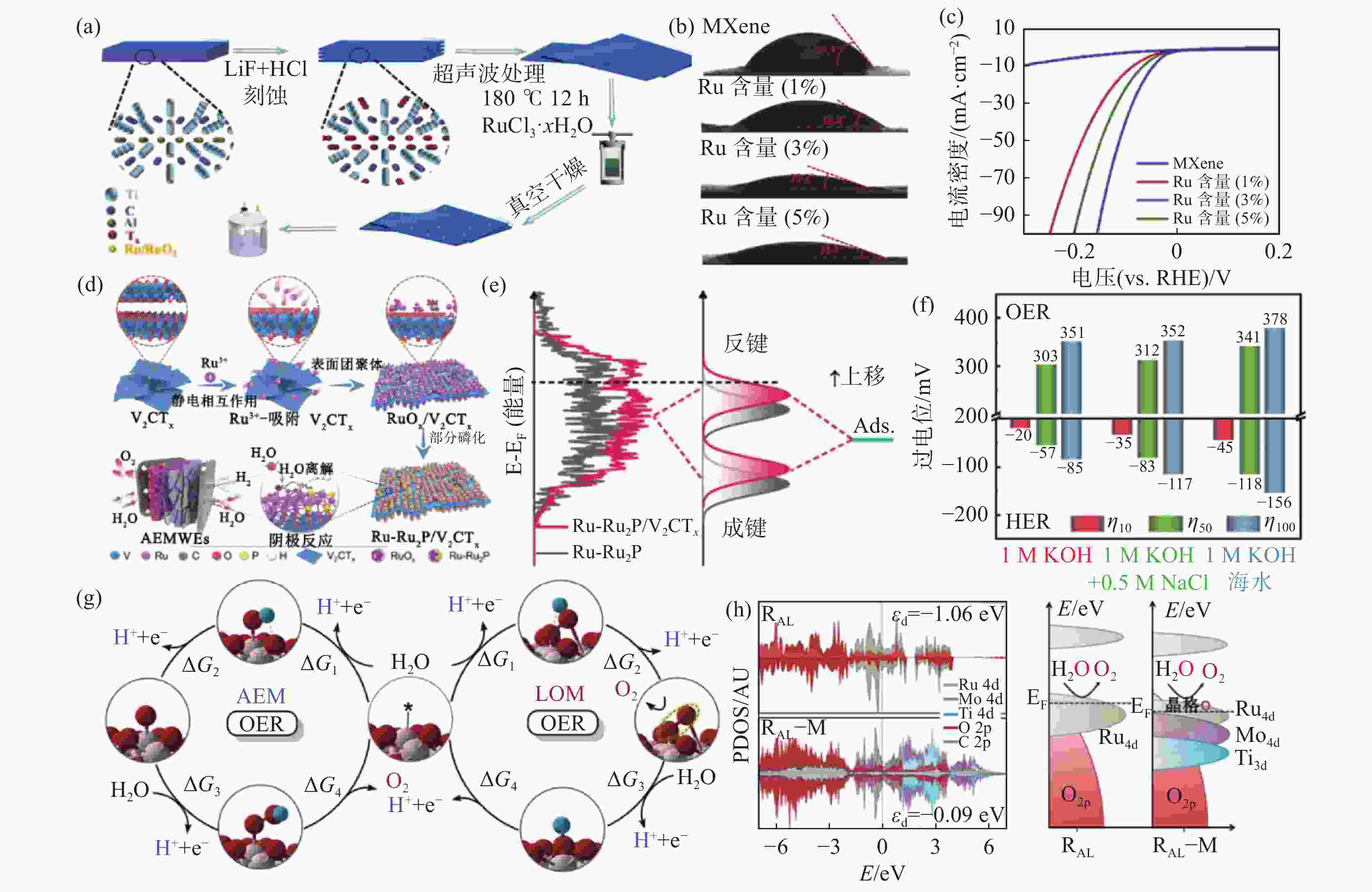 (a) Ru-RuO2/Ti3C2Tx催化剂的合成示意[47]; (b) Ti3C2Tx、Ru-RuO2/Ti3C2Tx与水的接触角测试[47]; (c) Ti3C2Tx与不同Ru负载量下Ru-RuO2/Ti3C2Tx的HER极化曲线[47]; (d) Ru-Ru2P/Ti3C2Tx催化剂的合成示意与其在AEMWE的应用[48];(e) Ru-Ru2P与Ru-Ru2P/Ti3C2Tx催化剂Ru 3d轨道的投影态密度(PDOS)[48]; (f) RuO2-Ti3C2/NF在10、50与100 mA/cm2电流密度下不同电解质中的HER与OER过电位[49]; (g)析氧反应(OER)中的吸附氧化机制(AEM)和晶格氧化机制(LOM)[50];(h) RuO2与RuO2-Mo2TiC2Tx催化剂的投影态密度(PDOS)[50]