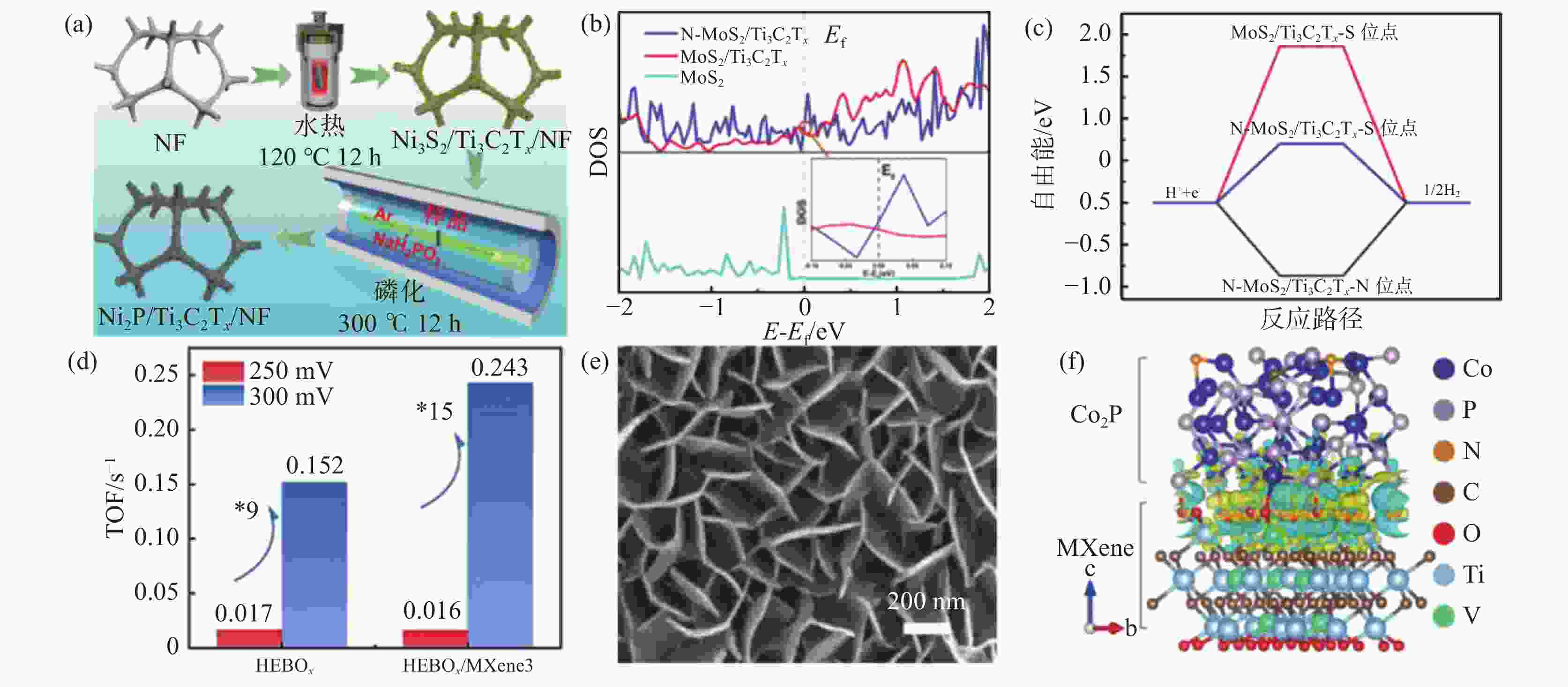 (a) Ni2P/Ti3C2Tx/NF合成示意[51]; (b) N-MoS2/Ti3C2Tx、MoS2/Ti3C2Tx与MoS2的态密度(DOS)[52];(c) N-MoS2/Ti3C2Tx与MoS2/Ti3C2Tx在S与N位点的氢吸附吉布斯自由能台阶图[52]; (d) FeCoNiMnBOx与FeCoNiMnBOx/Ti3C2Tx的TOF[53]; (e) NiCo-LDH/Ti3C2Tx/NF的SEM图[54]; (f) Co2P与MXenes界面产生的电荷密度差分(黄色代表电子积累,蓝色代表电子损失)[55]