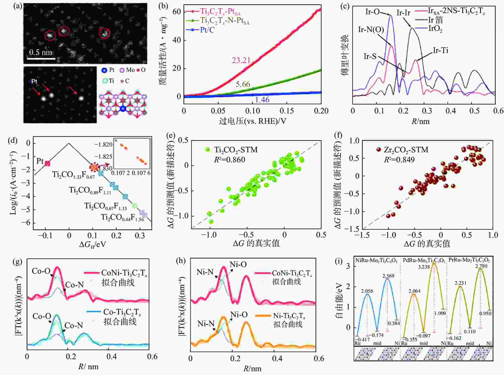(a) PtSA-Mo2TiC2Tx的HAADF-STEM放大图像及其相应的模拟图像[58]; (b) PtSA-Ti3C2Tx、最近报道的MXenes基与Pt基催化剂质量活性比较[59]; (c) Ir-2 NS-Ti3C2Tx、Ir箔和IrO2的EXAFS谱的傅里叶变换[60]; (d)不同F/O比下Ti2CTx的交换电流密度i0与∆GH的火山图[61]; 新描述符预测∆GH用于(e)Ti2CO2-STM与(f)Zr2CO2-STM[62]; (g) CoNi-Ti3C2Tx与Co-Ti3C2Tx的EXAFS谱的傅里叶变换[63]; (h) CoNi-Ti3C2Tx与Ni-Ti3C2Tx的EXAFS谱的傅里叶变换[63]; (h) Ru与Ni、Pd、Pt分别负载于Mo2Ti2C3O2时*OH迁移的动态能垒[64]