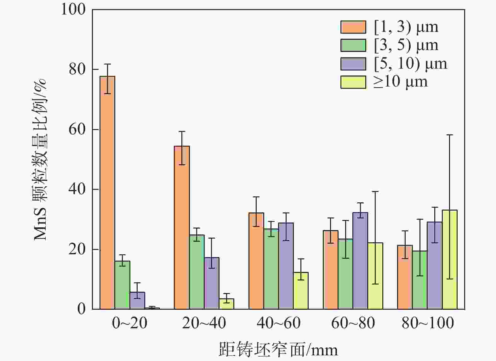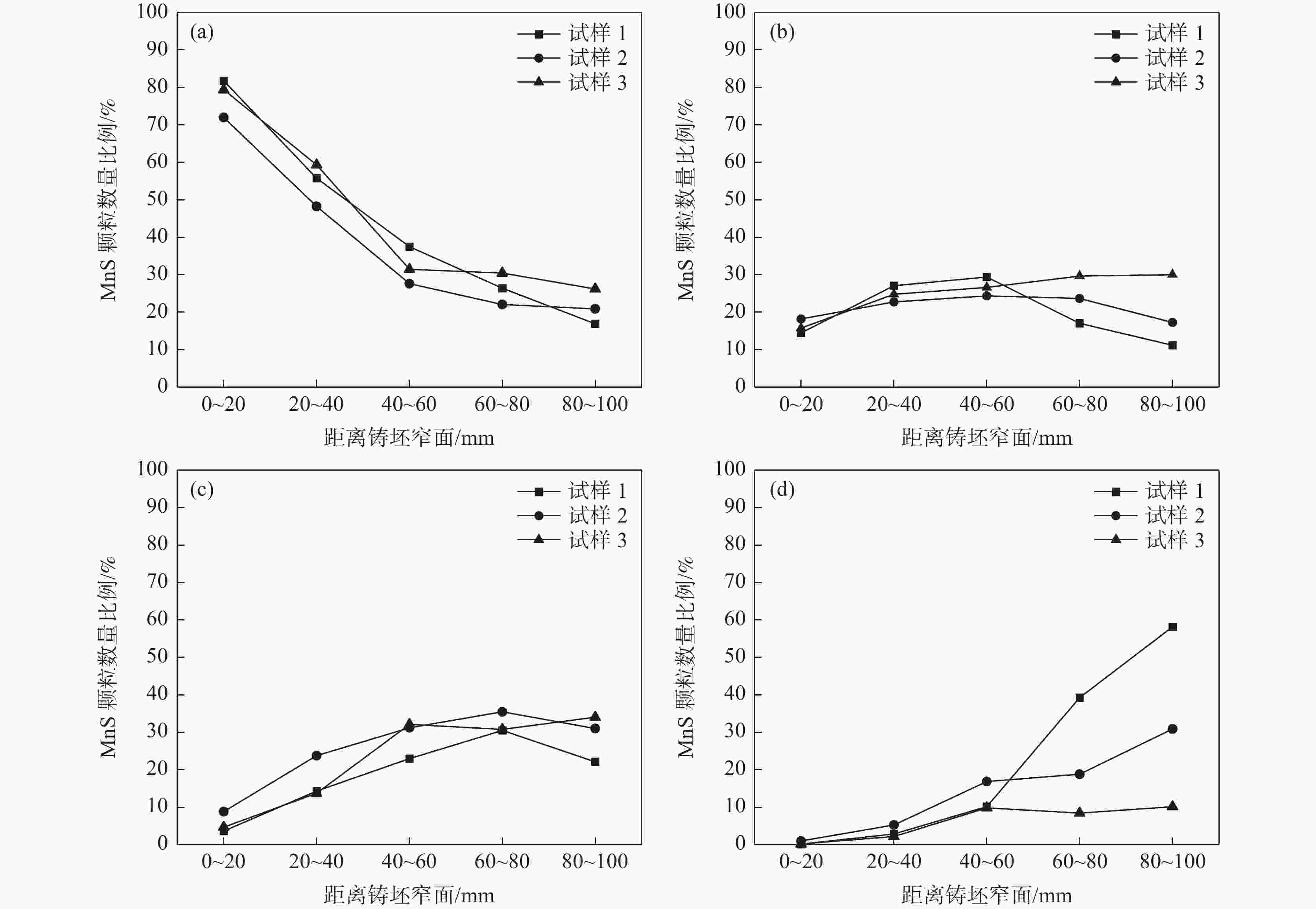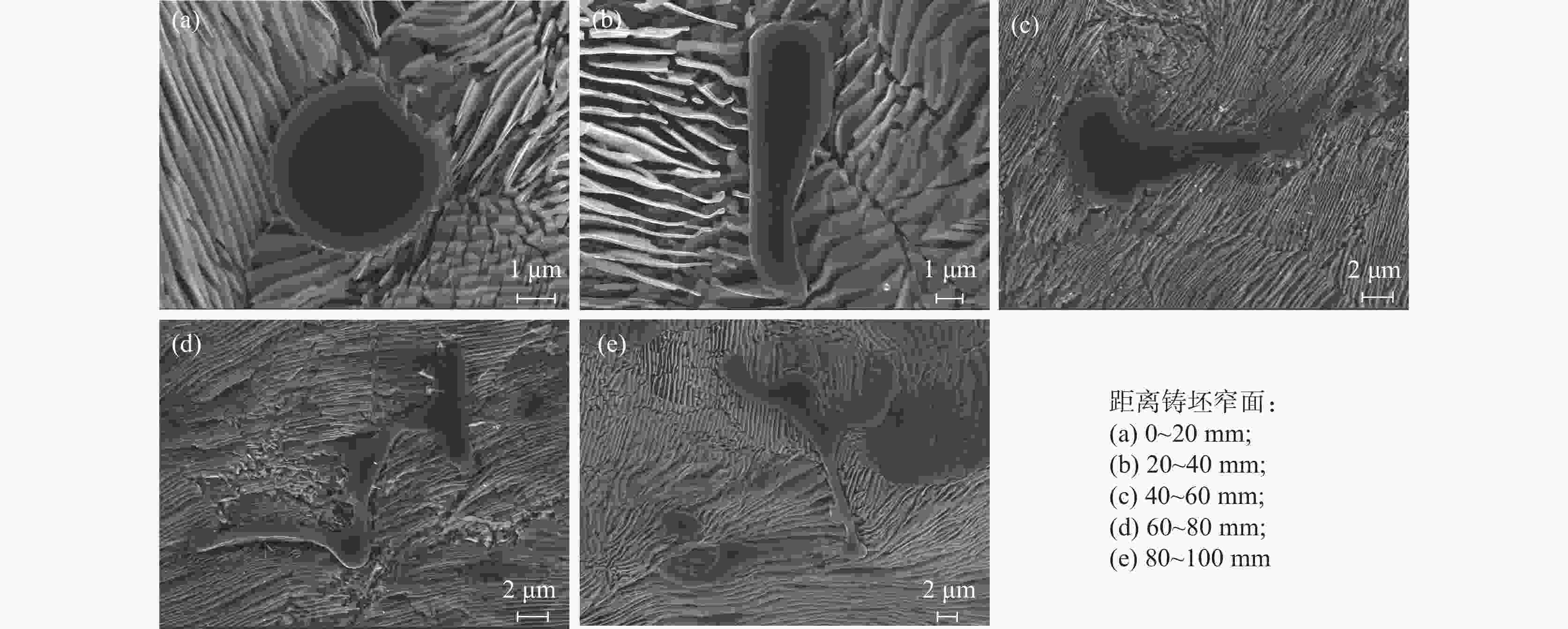 摘要: 采用电化学腐刻与Aspex扫描相结合,检测了重轨钢铸坯不同位置的MnS尺寸形貌,研究了凝固组织对MnS的影响。结果表明,凝固组织由混晶转变为粗大等轴晶时,3~5 μm的MnS颗粒数量比例降低,而≥10 μm的颗粒数量比例则明显增大。从距离铸坯窄面40 mm推移至100 mm,凝固组织类型转变越明显则≥10 μm的MnS颗粒数量比例增加越多:凝固组织发生明显转变时,其比例增加48.02%,凝固组织未发生类别转变时,其比例增加0.31%。通过连铸强化冷却等缩短局部凝固时间的工艺调控,可以促进MnS细小化控制。Abstract: The sizes and microstructures of MnS at different positions of the heavy rail steel bloom were measured by electro-chemical etching and Aspex scanning, and the effect of solidification structure on MnS was studied. The results show that when the solidification structure transforms from mixed-crystal to coarse equiaxed grain, the quantitative proportion of MnS particles with the size range of 3-5 μm decreases, and the quantitative proportion of particles with sizes larger than 10 μm increases significantly. While the distance from the narrow surface of the bloom changed from 40 mm to 100 mm, the solidification structure transformed more obviously, and the larger increment of the quantitative proportion of MnS particles with sizes over 10 μm was obtained: if the solidification structure transformed obviously, the quantitative proportion was increased by 48.02%, and if the solidification structure did not transform, the quantitative proportion was increased by 0.31%. It means MnS particles can be refined by adopting processes to shorten the local solidification time, such as strengthening cooling during continuous casting.
