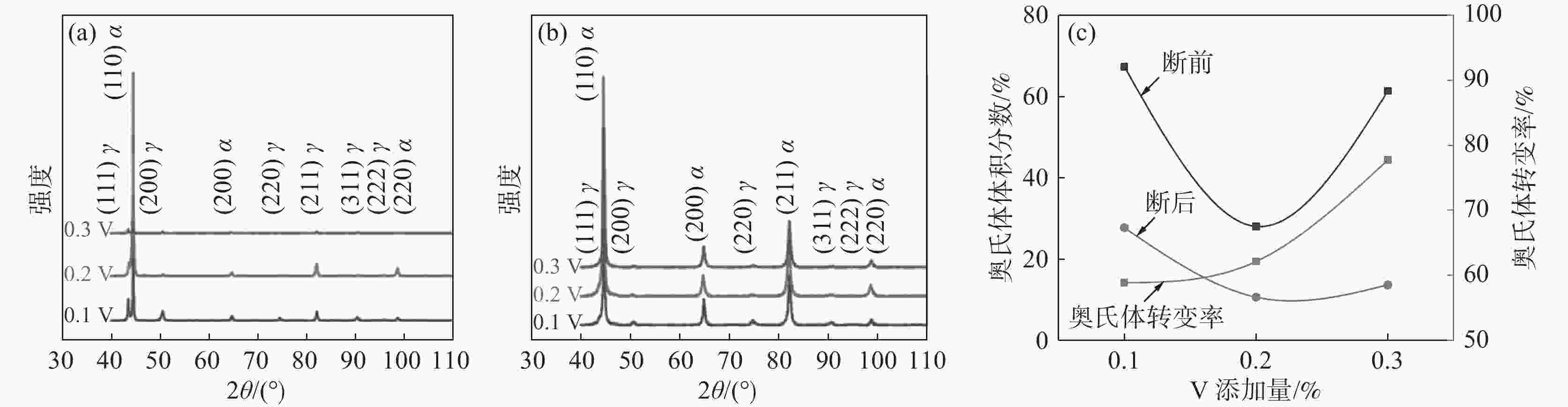 (a)拉伸试样断裂前XRD图谱;(b)拉伸试样断裂后XRD图谱; (c)奥氏体百分含量和奥氏体转变率