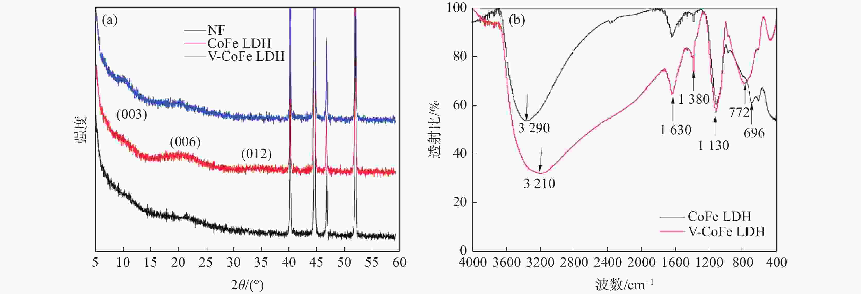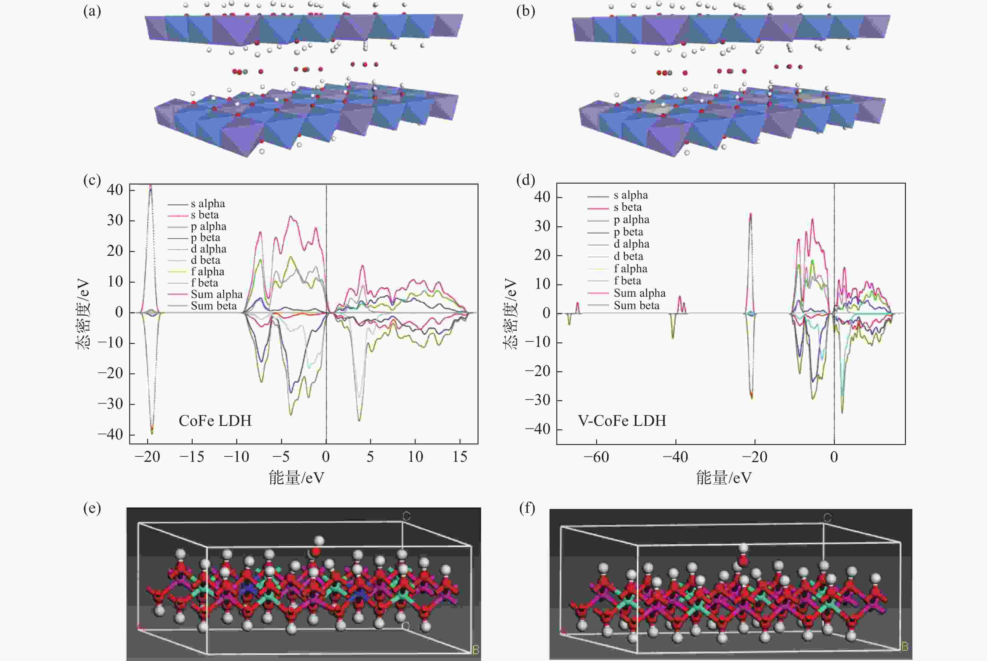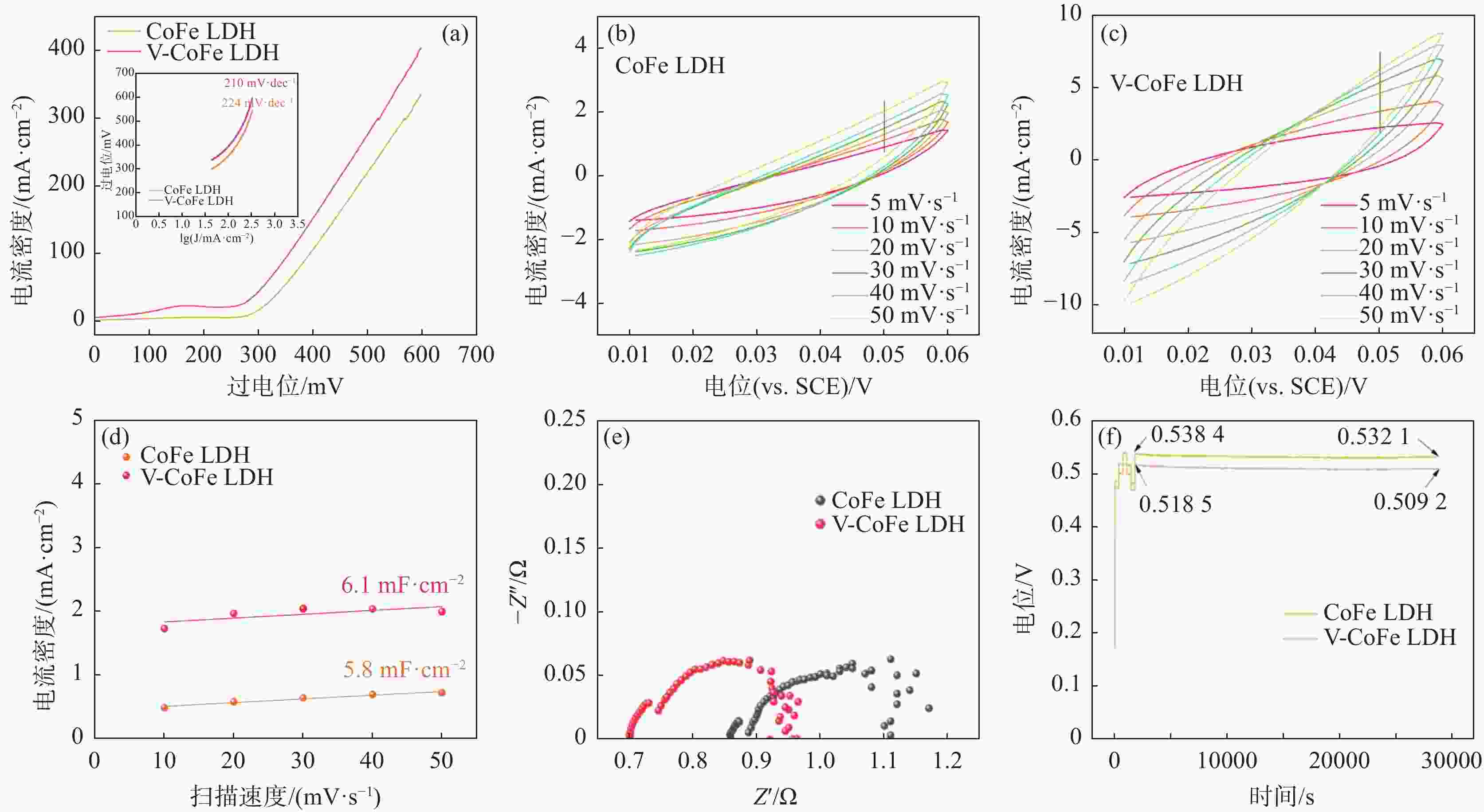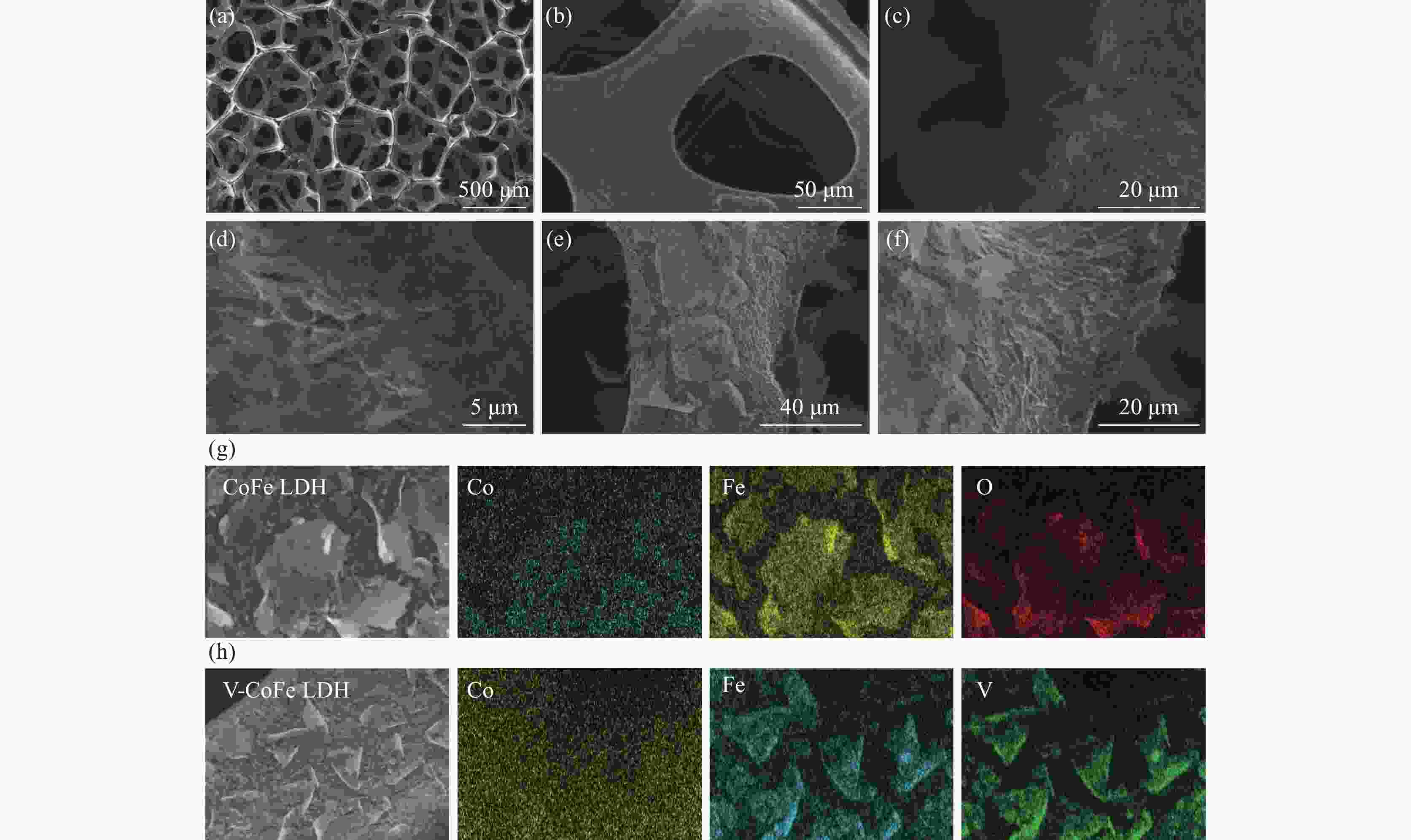 摘要: 开发环境友好且毒性相对较低的析氧反应(OER)电催化剂是目前水分解的最大困难之一。采用电沉积的方法在泡沫镍(NF)上原位生长了钴铁层状双氢氧化物(CoFe LDH)和钒掺杂的钴铁层状双氢氧化物(V-CoFe LDH)纳米片,并将其作为OER催化剂以探究其析氧性能。研究结果表明,在碱性介质中,当电流密度为100 mA·cm−2时,CoFe LDH和V-CoFe LDH的过电位分别为396 mV和356 mV,CoFe LDH和V-CoFe LDH分别具有224 mV·dec−1和210 mV·dec−1的Tafel斜率。此外,相比于CoFe LDH,V-CoFe LDH电催化剂具有大的电化学比表面积和优异的电解液润湿性。这些结果均表明V的引入有助于增强材料的OER性能。结合密度泛函理论计算和试验结果证明,V的掺杂不仅优化了材料的电子结构,增强了导电性,同样降低了吸附能,增强了催化剂与电解液的接触。Abstract: Exploiting environmentally friendly and relatively low-toxicity oxygen evolution reaction (OER) electrocatalysts is currently one of the biggest difficulties in water splitting. In this work, cobalt iron layered double hydroxide (CoFe LDH) and vanadium-doped cobalt iron layered double hydroxide (V-CoFe LDH) nanosheets are in situ grown on nickel foam (NF) by electrodeposition as an effective OER catalyst. When CoFe LDH and V-CoFe LDH samples are used as electrocatalysts, they both exhibit excellent OER performance. In an alkaline media, when the current density is 100 mA·cm−2, the overpotentials of CoFe LDH and V-CoFe LDH are small overpotentials of 396 mV and 356 mV, respectively. Tafel slopes of CoFe LDH and V-CoFe LDH are 224 mV·dec−1 and 210 mV·dec−1, respectively. The electrochemical activity specific surface area of V-CoFe LDH electrocatalysts is higher than CoFe LDH electrocatalysts. Moreover, the V-CoFe LDH electrocatalyst has better wetting properties for the electrolyte. These all indicate that the introduction of V helps to enhance the OER performance of the material. Density functional theory calculations and experimental results have shown that the doping of V not only optimizes the electronic structure of the material, enhances conductivity, but also reduces adsorption energy and enhances the contact between the catalyst and electrolyte. This work demonstrates that V-CoFe LDH is a highly promising OER electrocatalyst.