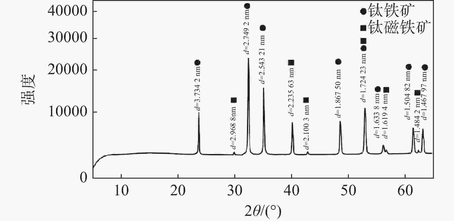 % TiO2 TFe FeO SiO2 Al2O3 CaO MgO 48.03 33.93 38.26 1.50 0.57 0.50 3.12 表 2 钛精矿矿物组成分析结果