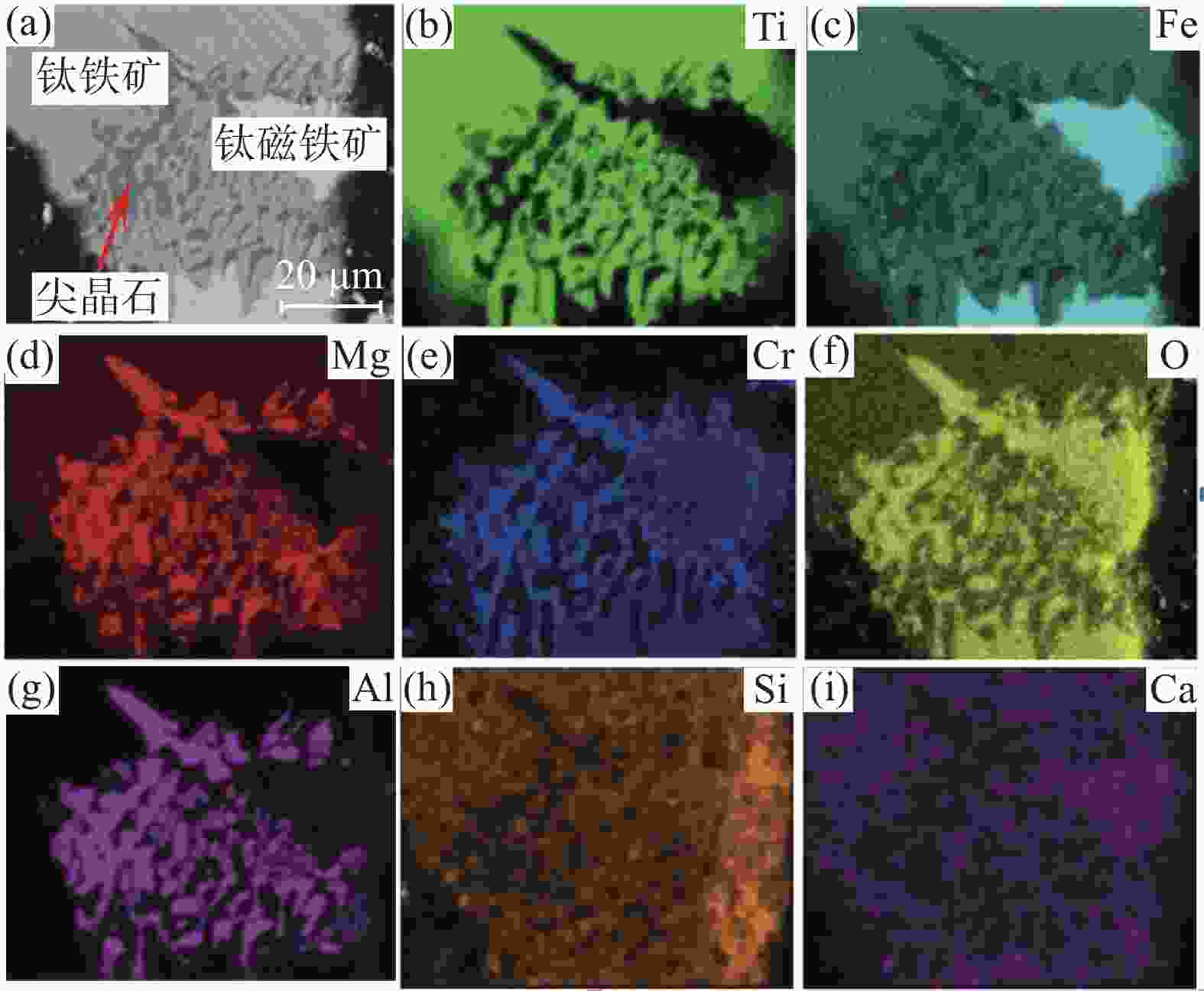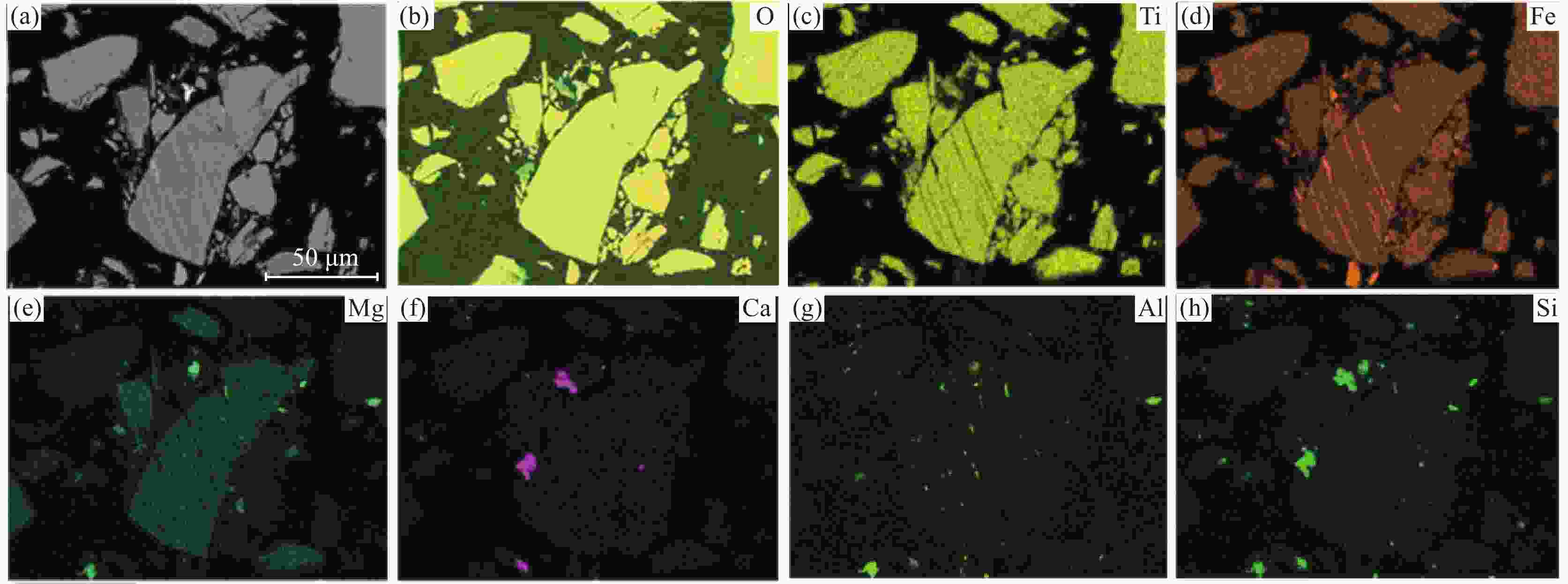 % 序号 TiO2 FeO MgO CaO Al2O3 SiO2 V2O3 Na2O K2O P2O5 Total 1 53.60 42.09 3.51 0.00 0.01 0.00 0.14 0.00 0.01 0.00 99.37 2 52.46 42.71 4.36 0.03 0.02 0.03 0.08 0.00 0.01 0.00 99.70 3 51.61 45.03 2.95 0.03 0.01 0.01 0.00 0.00 0.00 0.02 99.66 4 51.83 44.93 2.85 0.00 0.00 0.02 0.21 0.01 0.00 0.00 99.86 5 56.28 35.62 8.02 0.00 0.00 0.00 0.07 0.03 0.01 0.00 100.05 6 50.86 48.00 0.07 0.00 0.00 0.00 0.00 0.05 0.00 0.00 98.99 7 52.37 47.28 0.09 0.01 0.00 0.00 0.00 0.02 0.00 0.00 99.77 8 52.05 47.23 0.08 0.00 0.00 0.02 0.32 0.02 0.00 0.00 99.73 9 50.53 48.91 0.02 0.02 0.03 0.00 0.00 0.02 0.00 0.01 99.55 10 49.33 50.17 0.07 0.04 0.05 0.00 0.22 0.00 0.01 0.01 99.90 平均值 52.09 45.20 2.20 0.01 0.01 0.01 0.11 0.01 0.00 0.00 99.66 表 6 其他矿物的能谱微区数据
