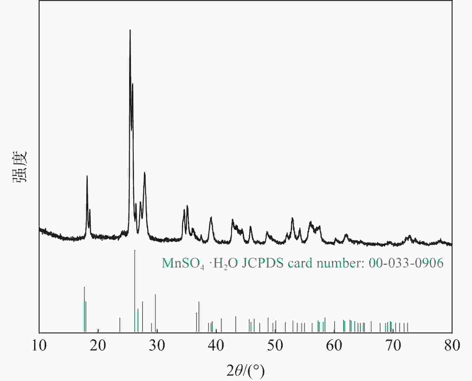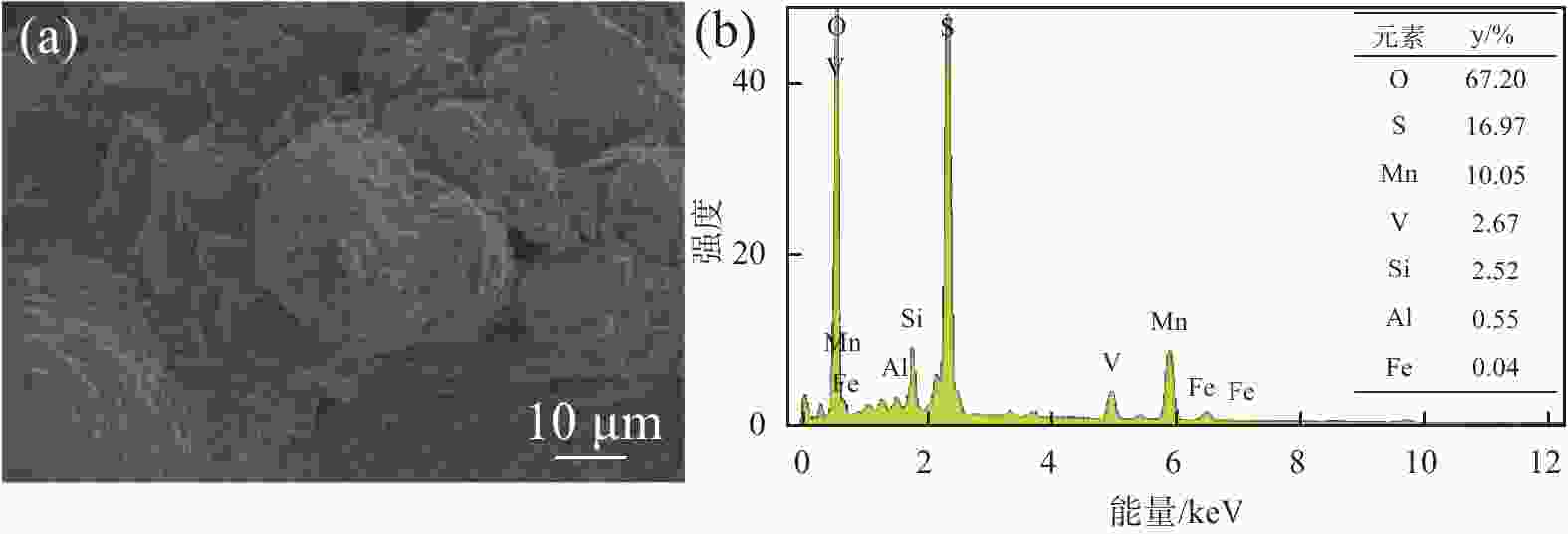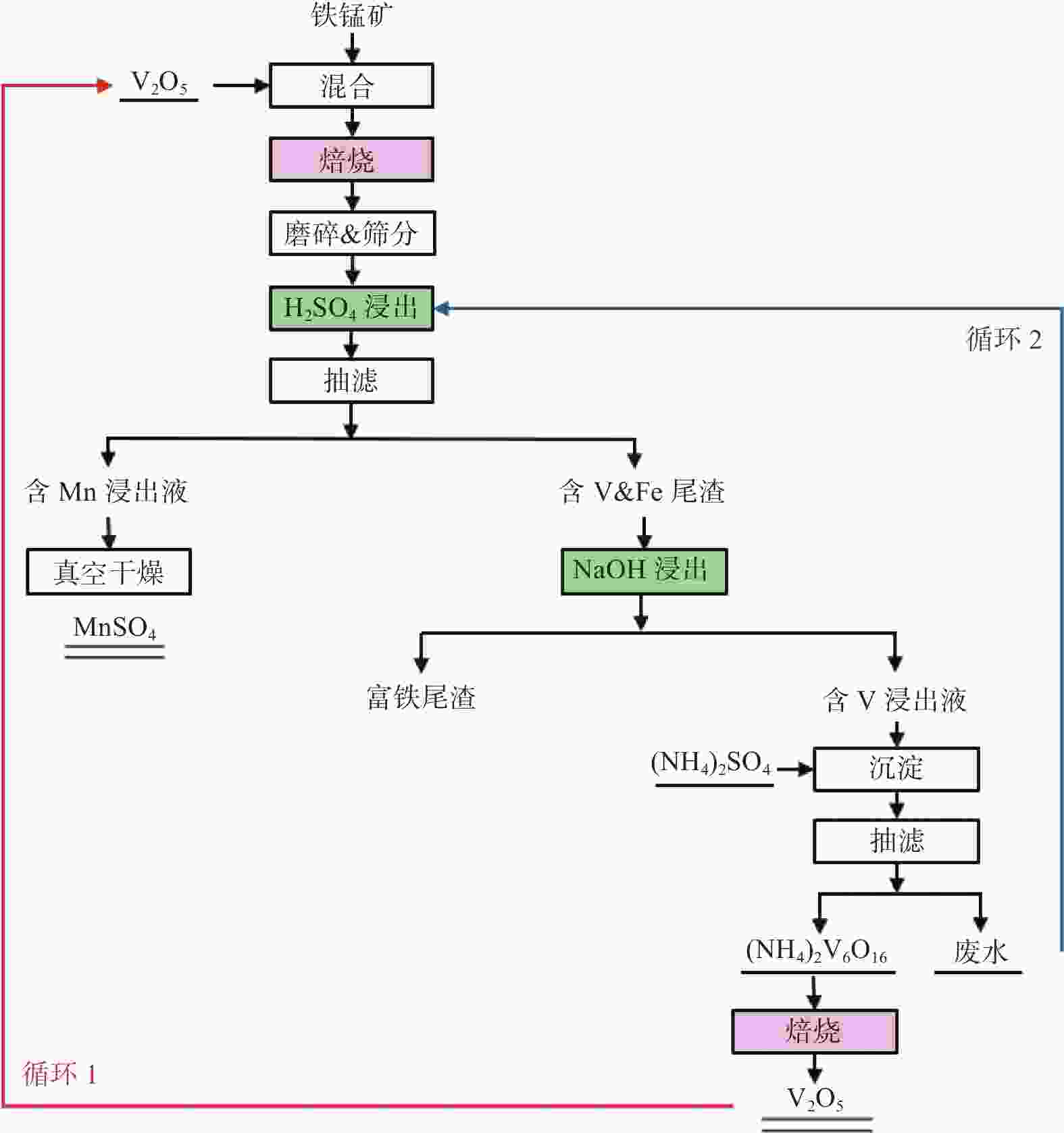 %和5.77%,实现了锰、铁组元的有效分离。含锰浸出液真空干燥得到MnSO4,可作为锰冶金和锰化工的中间产品。酸浸渣经碱浸后实现了铁、钒分离,富铁尾渣中Fe2O3含量达83.02%,可作为高炉炼铁原料。碱浸液经水解沉淀和焙烧得到V2O5可返回焙烧体系,其循环利用率达90%以上,该过程产生的废水也可返回浸出体系再次利用。该研究为共伴生铁锰资源的清洁高效利用提供了一个新方法。
