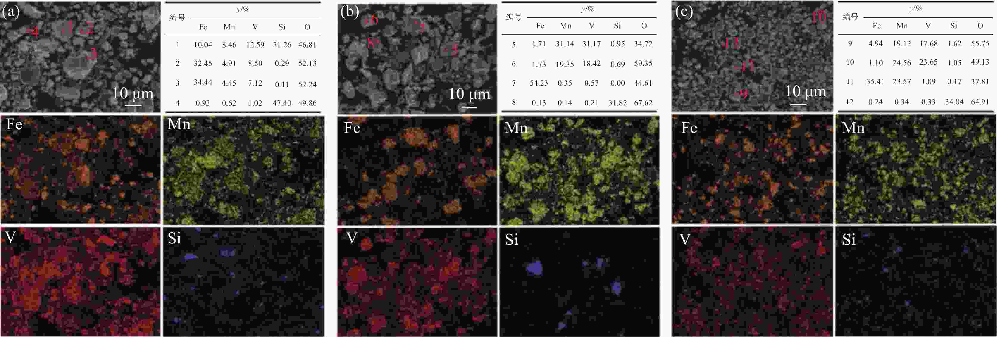 图  5  不同n(MnO2)/n(V2O5)下焙烧熟料的SEM形貌、主要元素分布